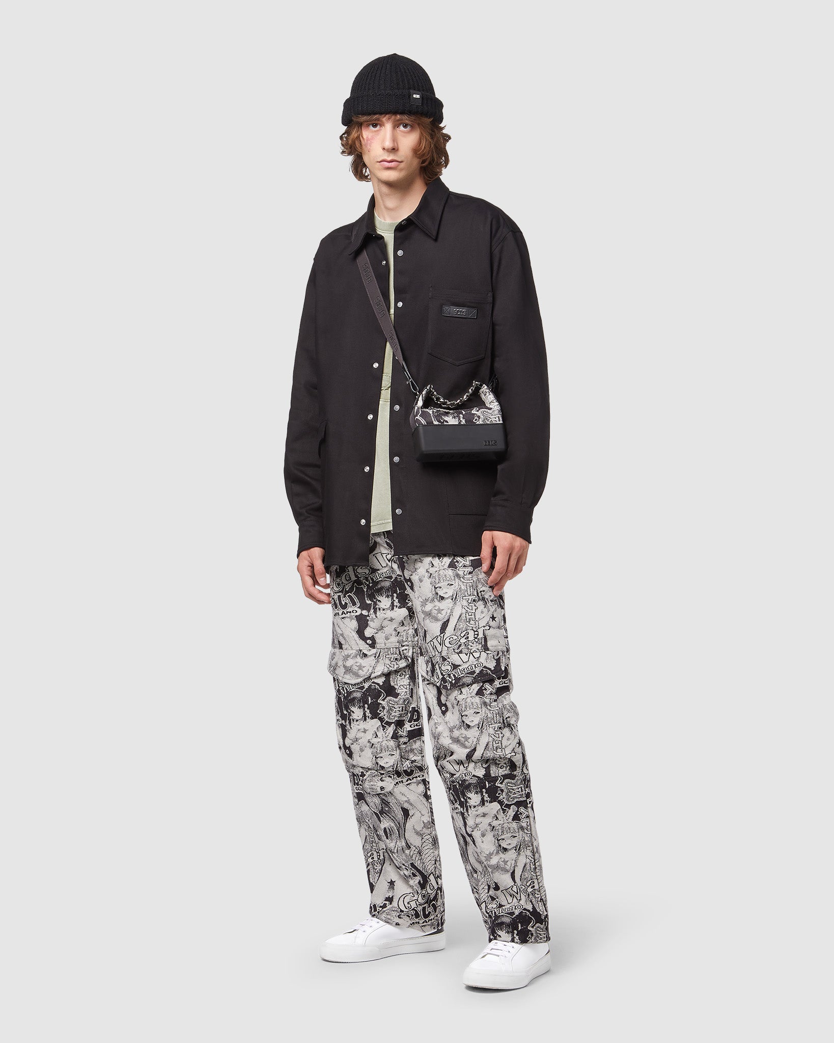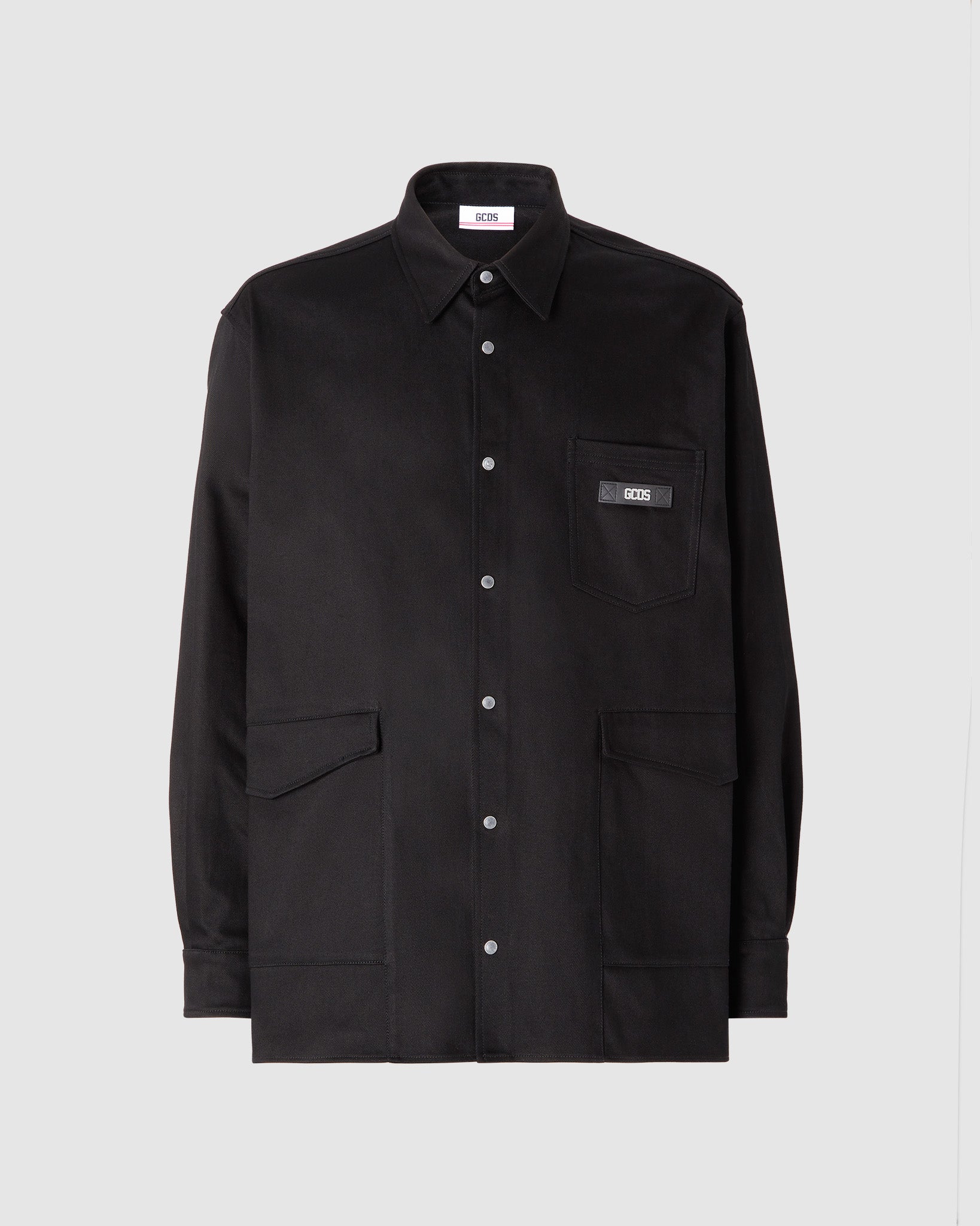 Black cotton gabardine shirt with cargo pockets and leather patch with polished nickel logo appliqué on the chest pocket. Oversized fit.