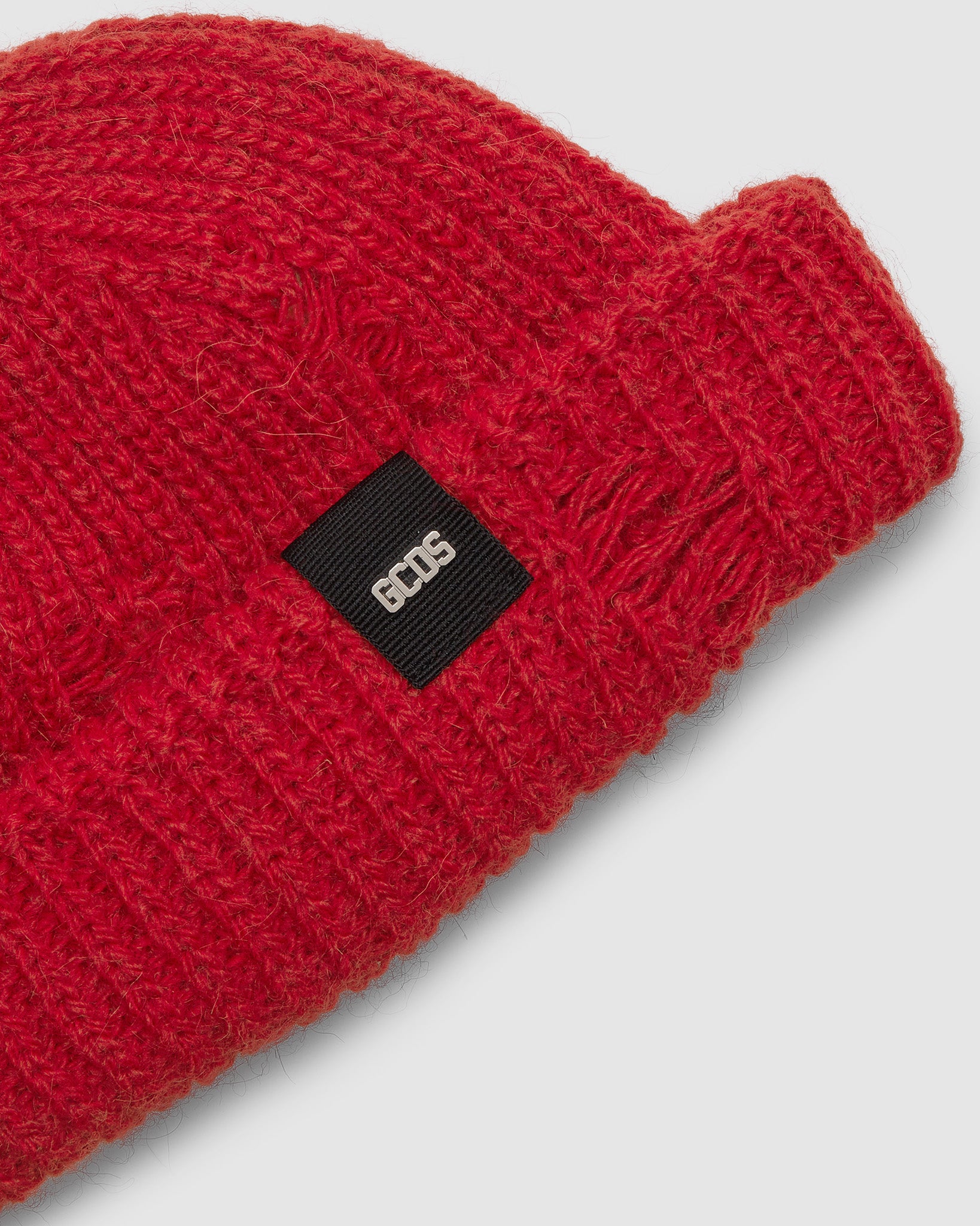 Wool and soft mohair blend ribbed beanie with bold cuff. Scattered rips and grosgrain band with polished nickel logo plaque.