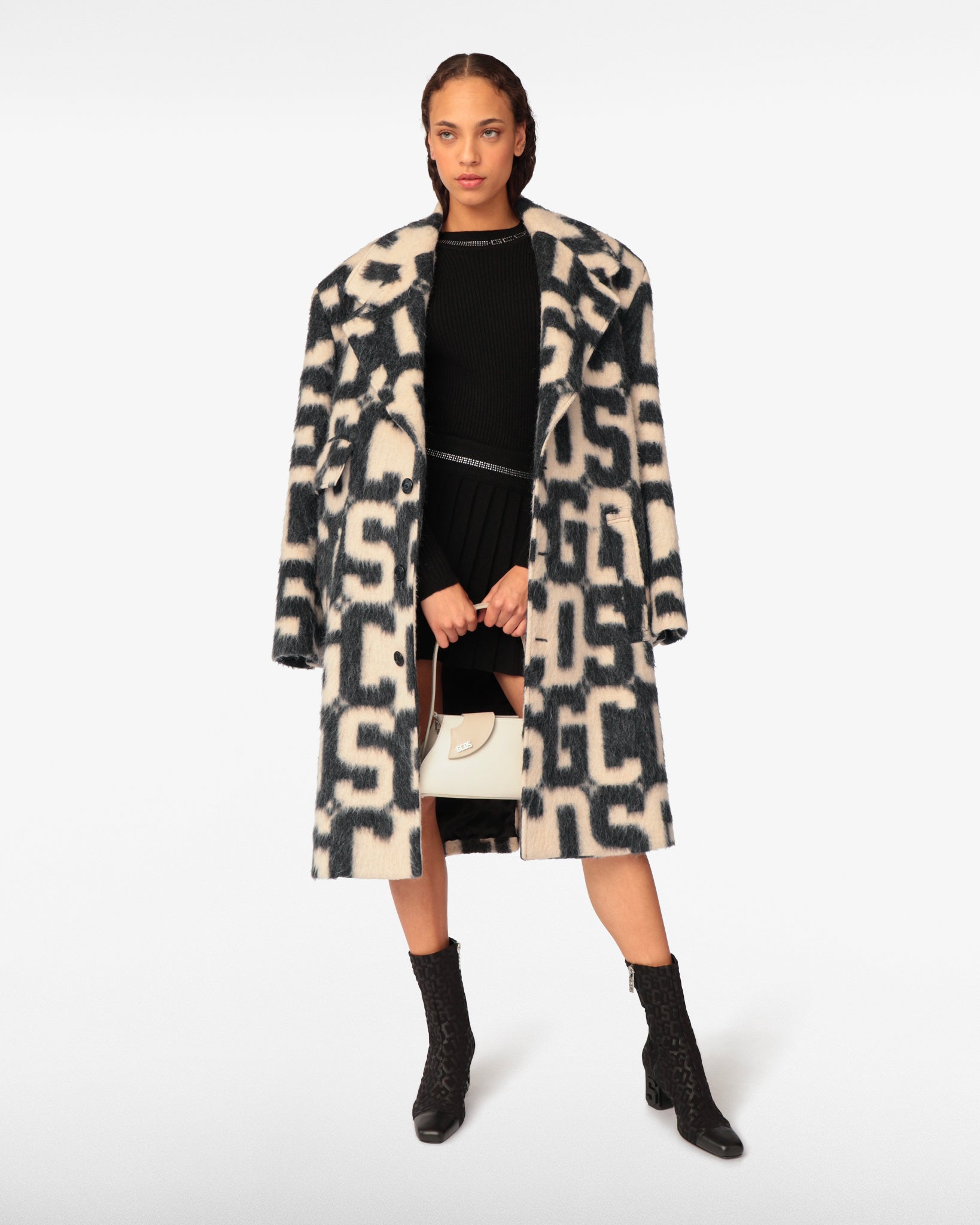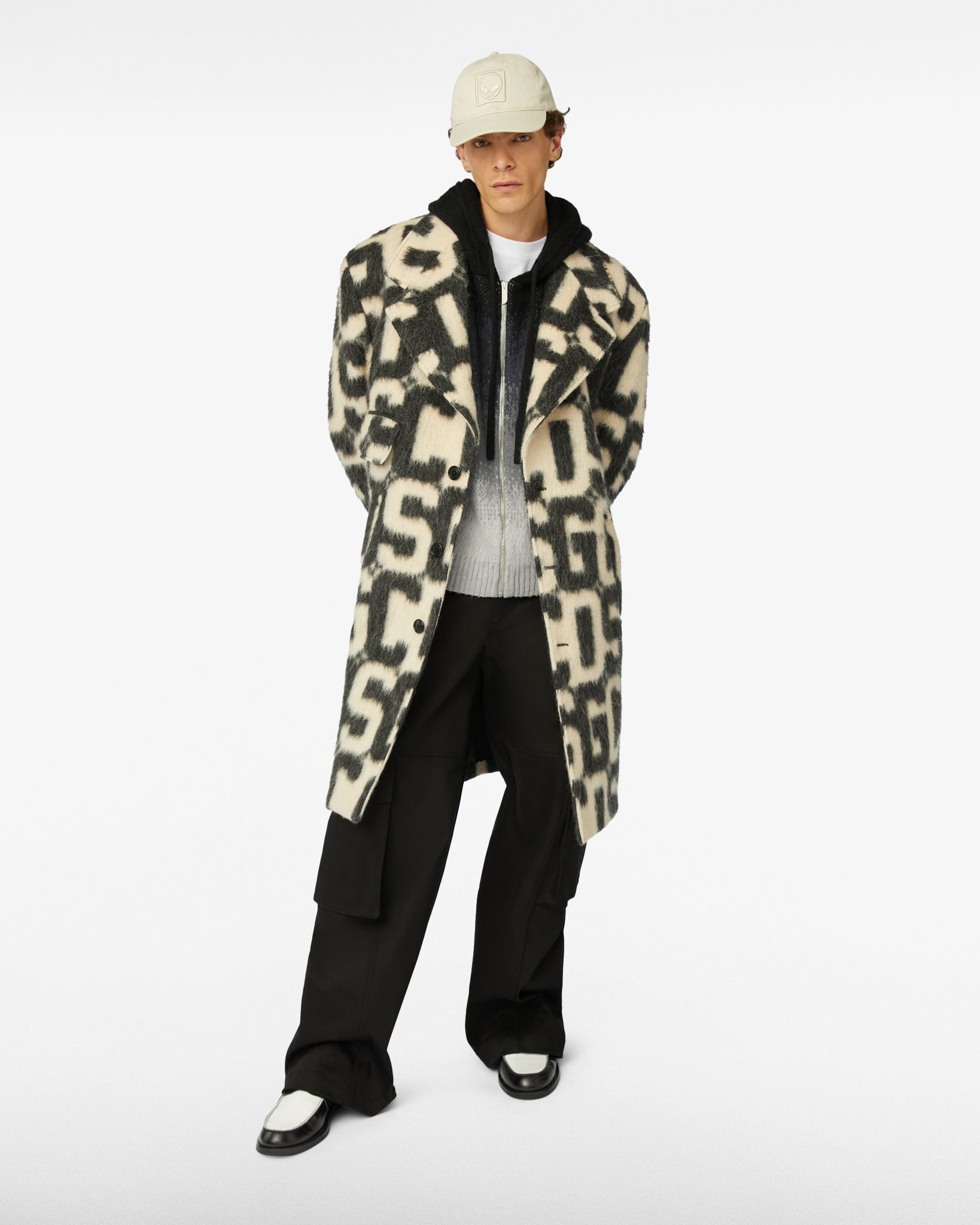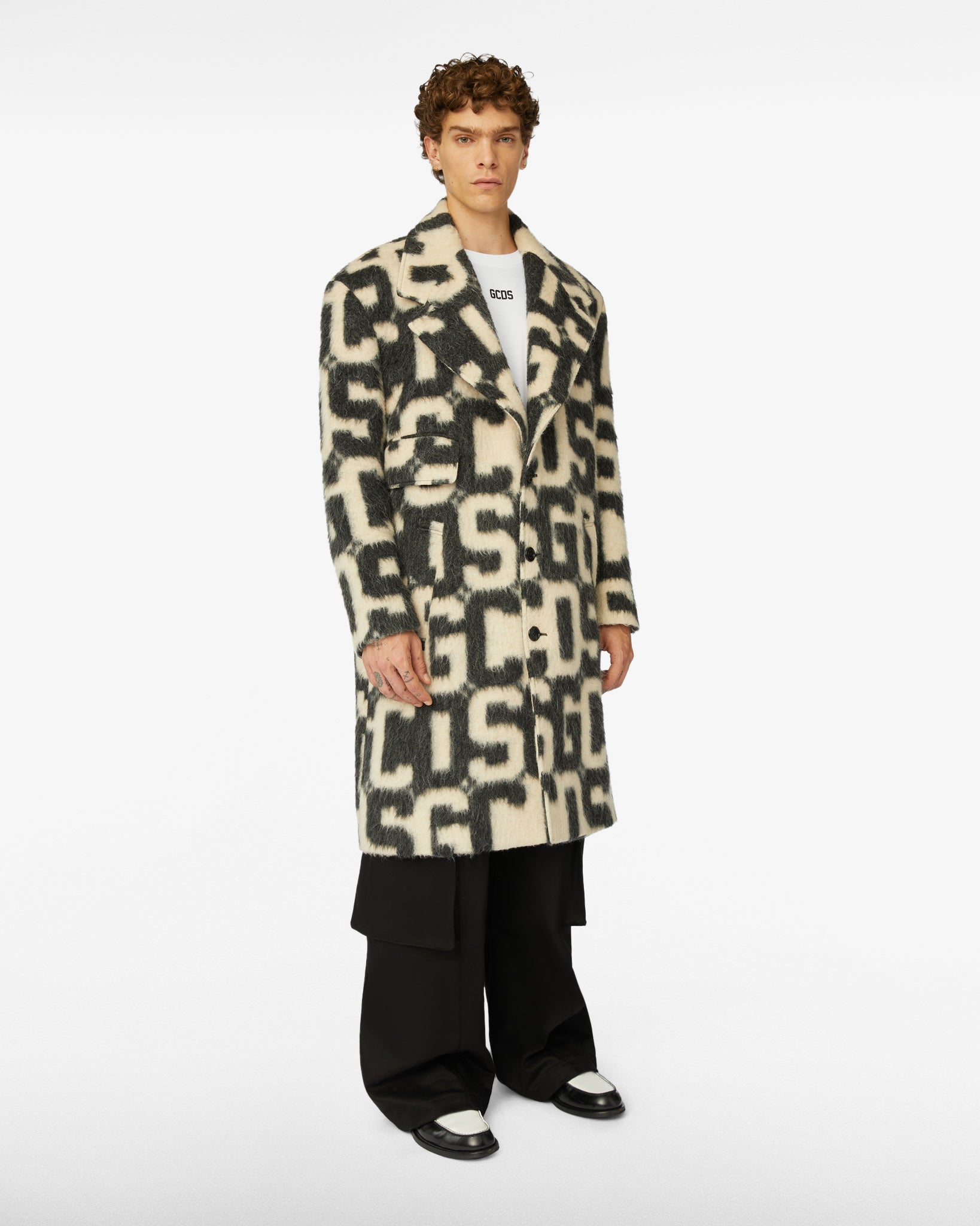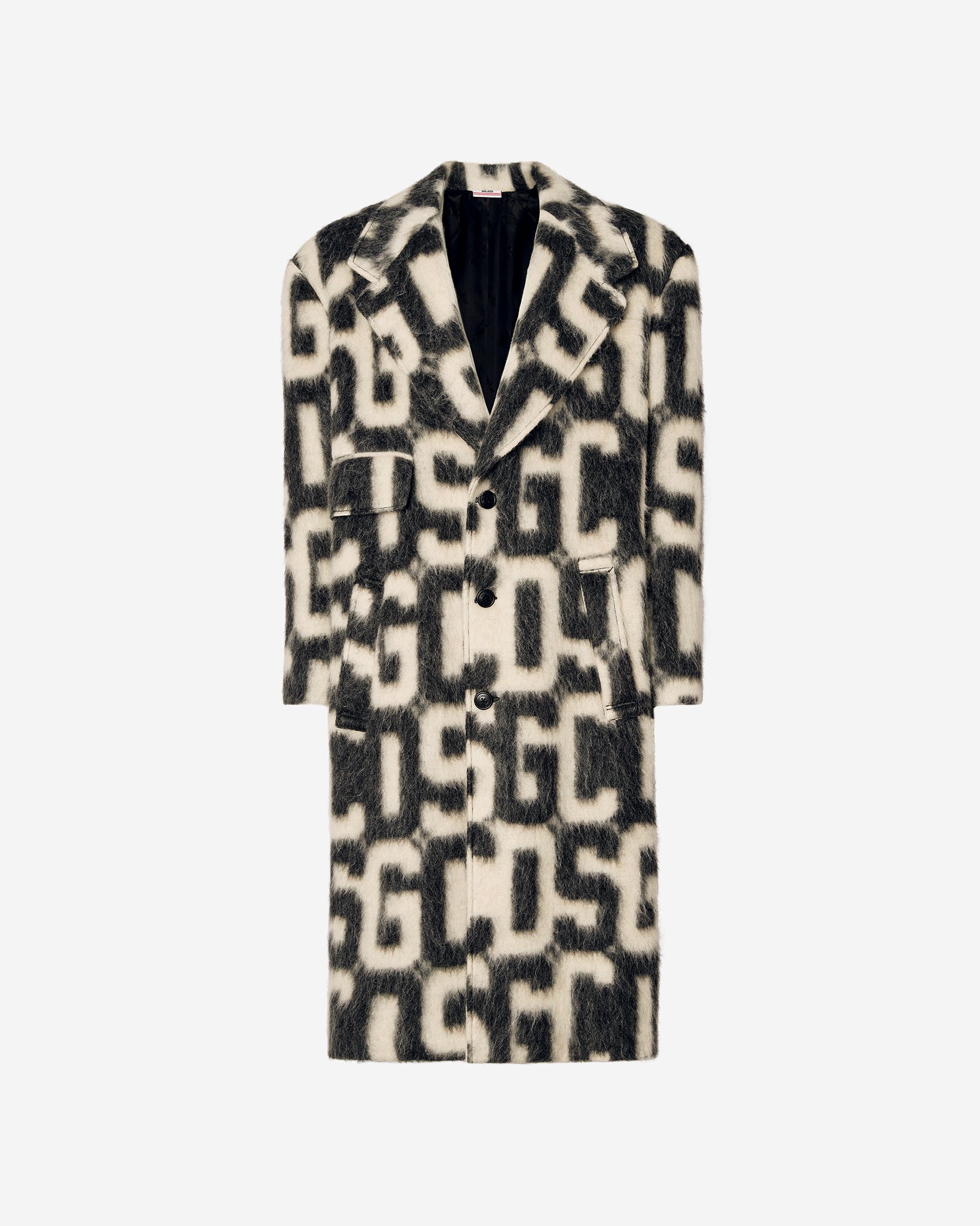 Single-breasted coat made of knit with a gauzy finish. Features all-over GCDS monogram pattern and a back slit. Lapel collar, inside epaulettes and long sleeves. Contrast front button closure.