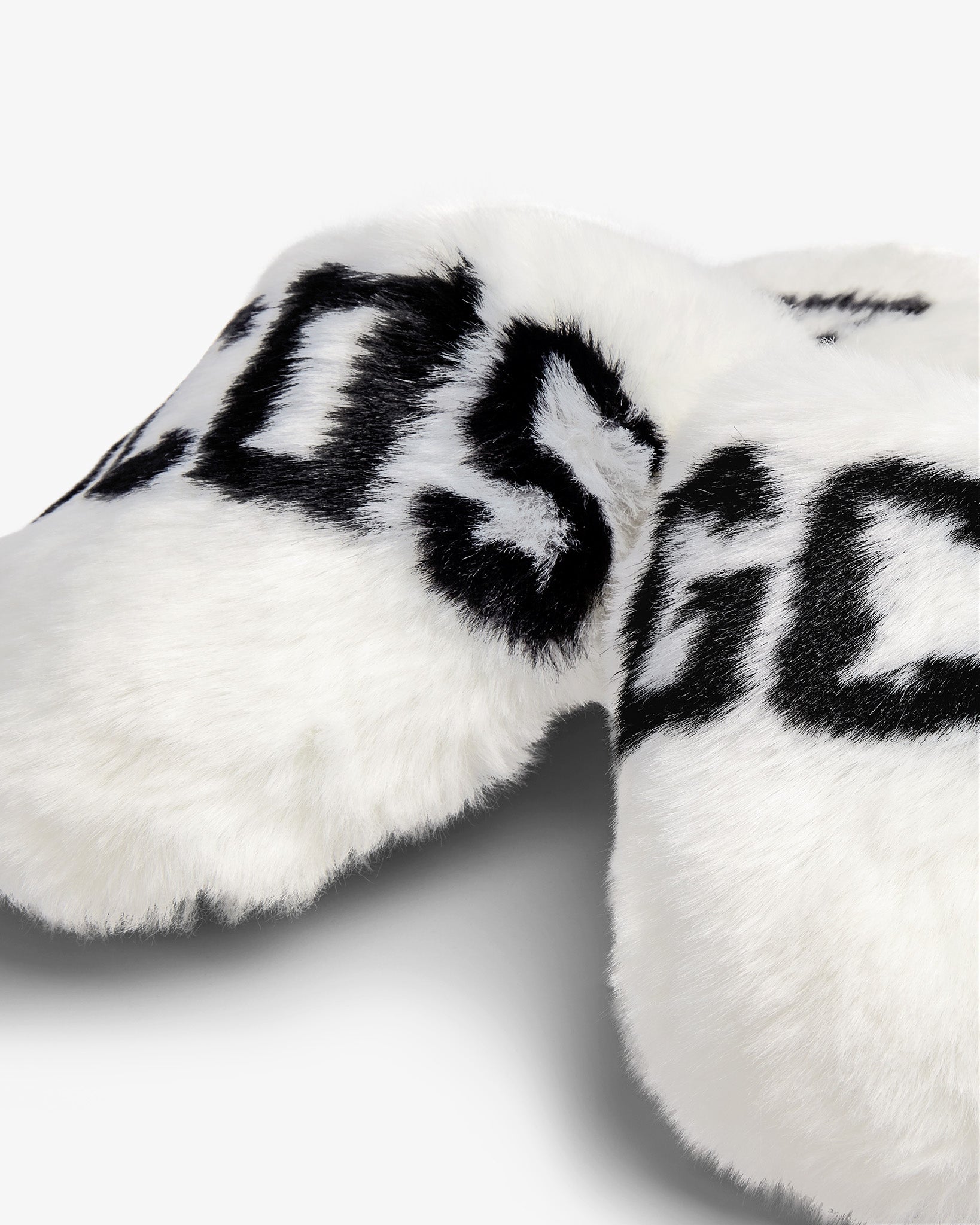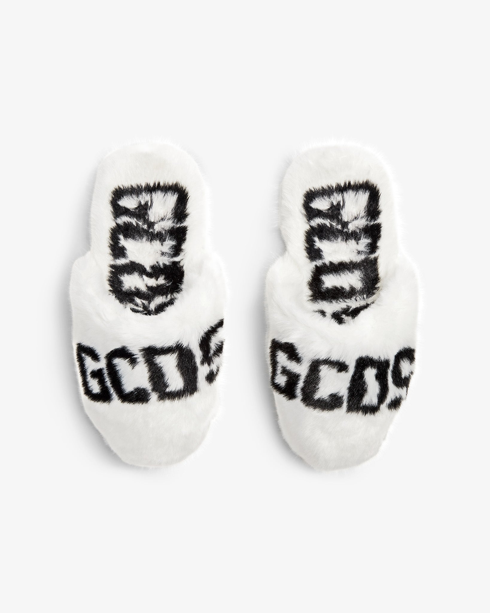 Slippers with GCDS faux fur vamp. Faux fur logoed lining and insole for warmth and comfort. Natural rubber sole. Round toe.
