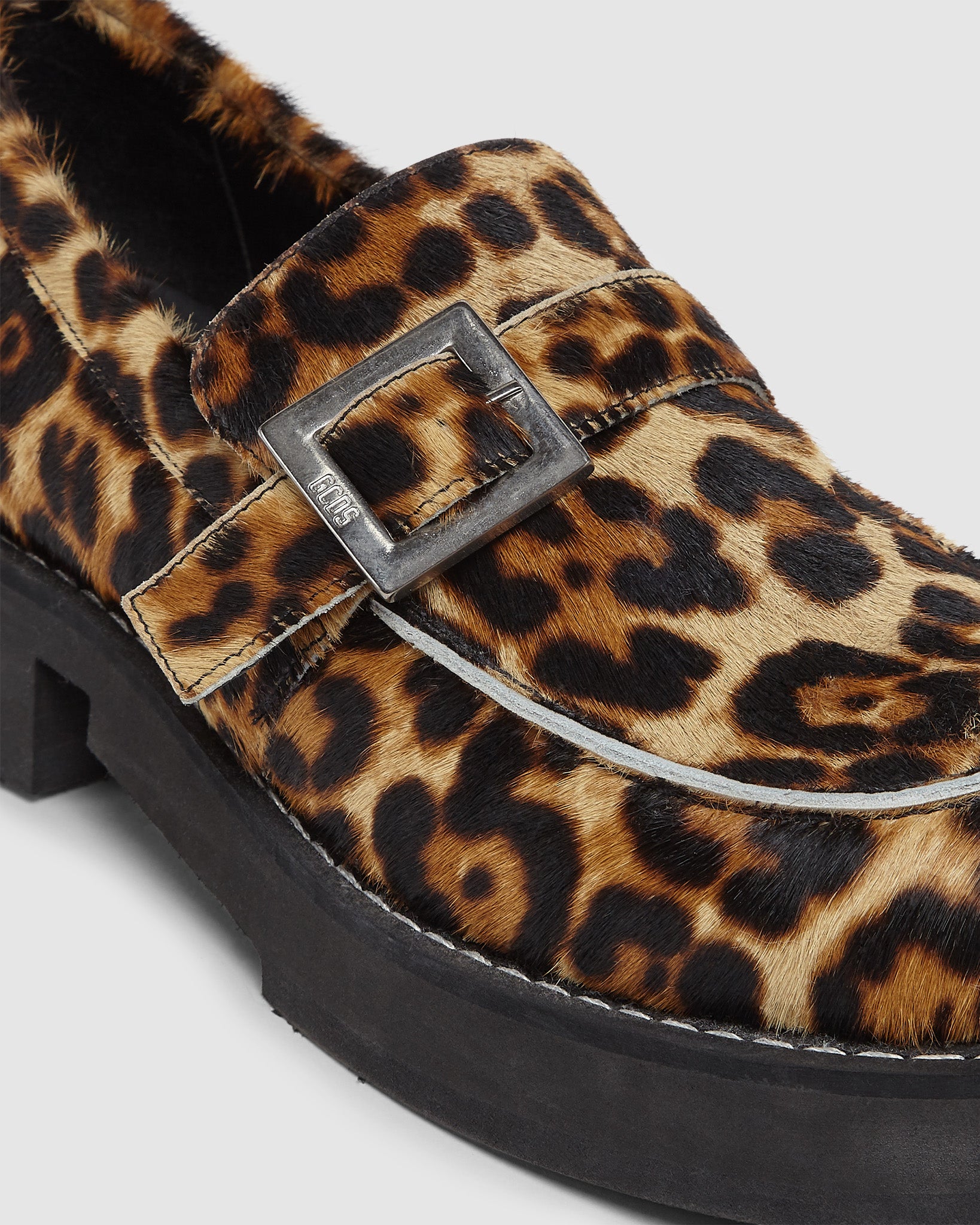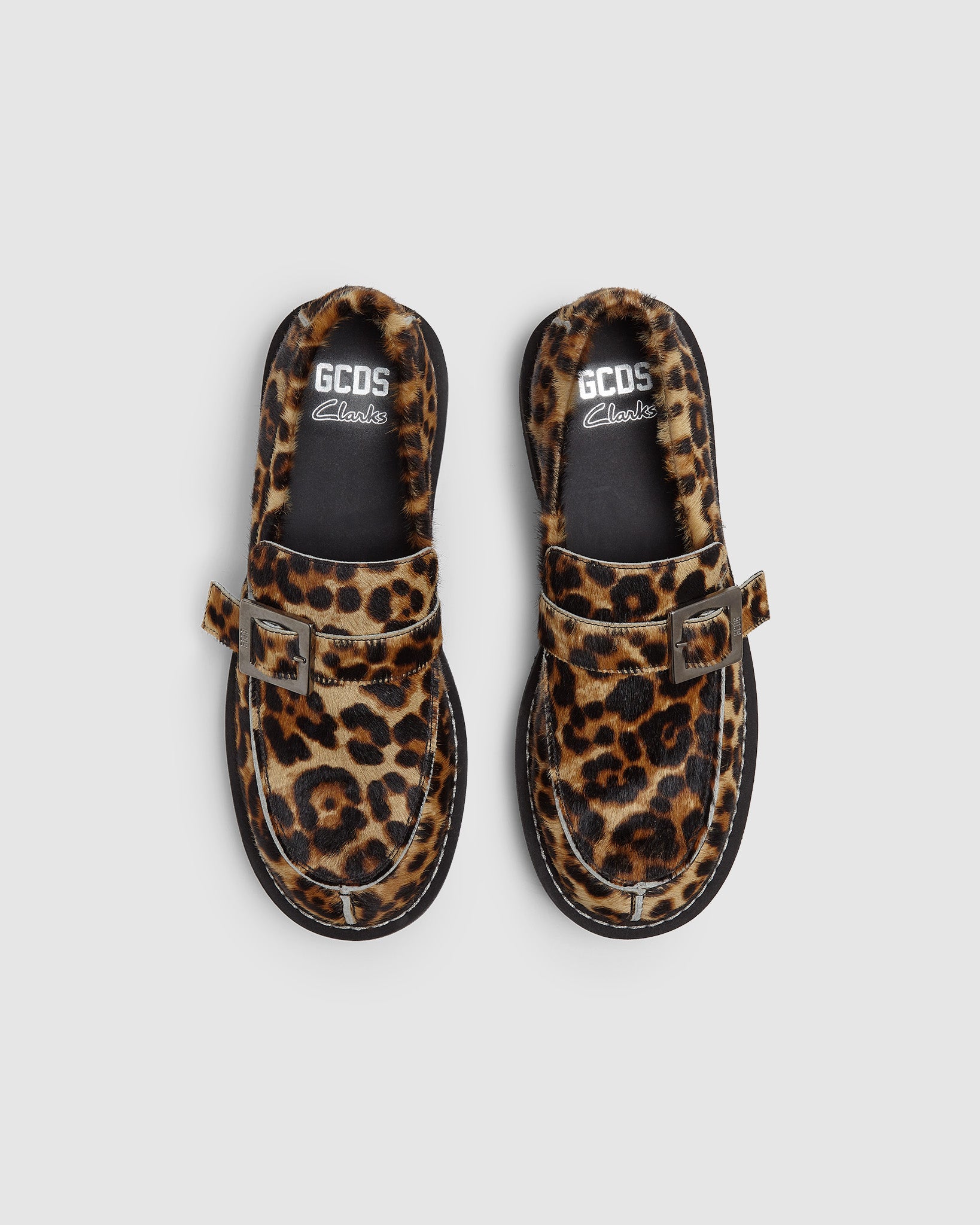 GCDS x Clarks loafers, with a distinct and geometric cut, are made of printed pony skin and feature an adjustable strap with a logo buckle. Black lightweight rubber sole with diamond texture.