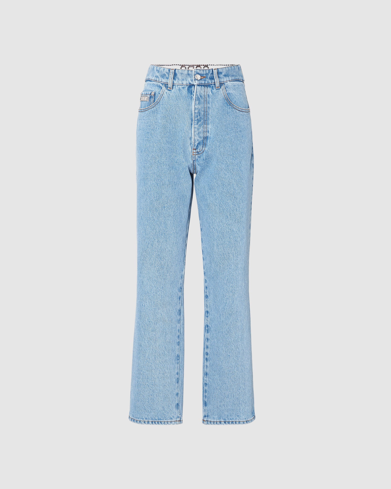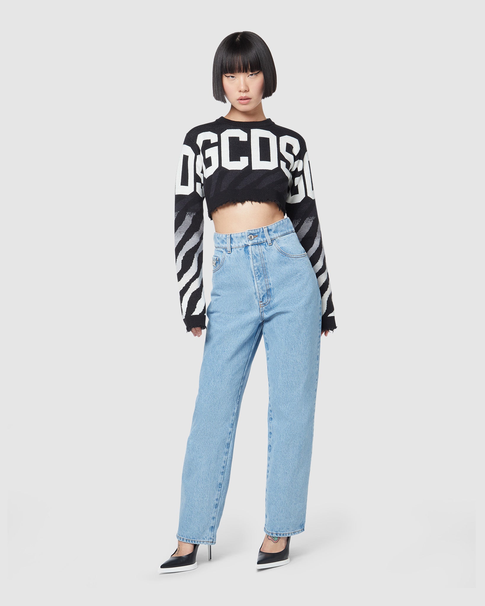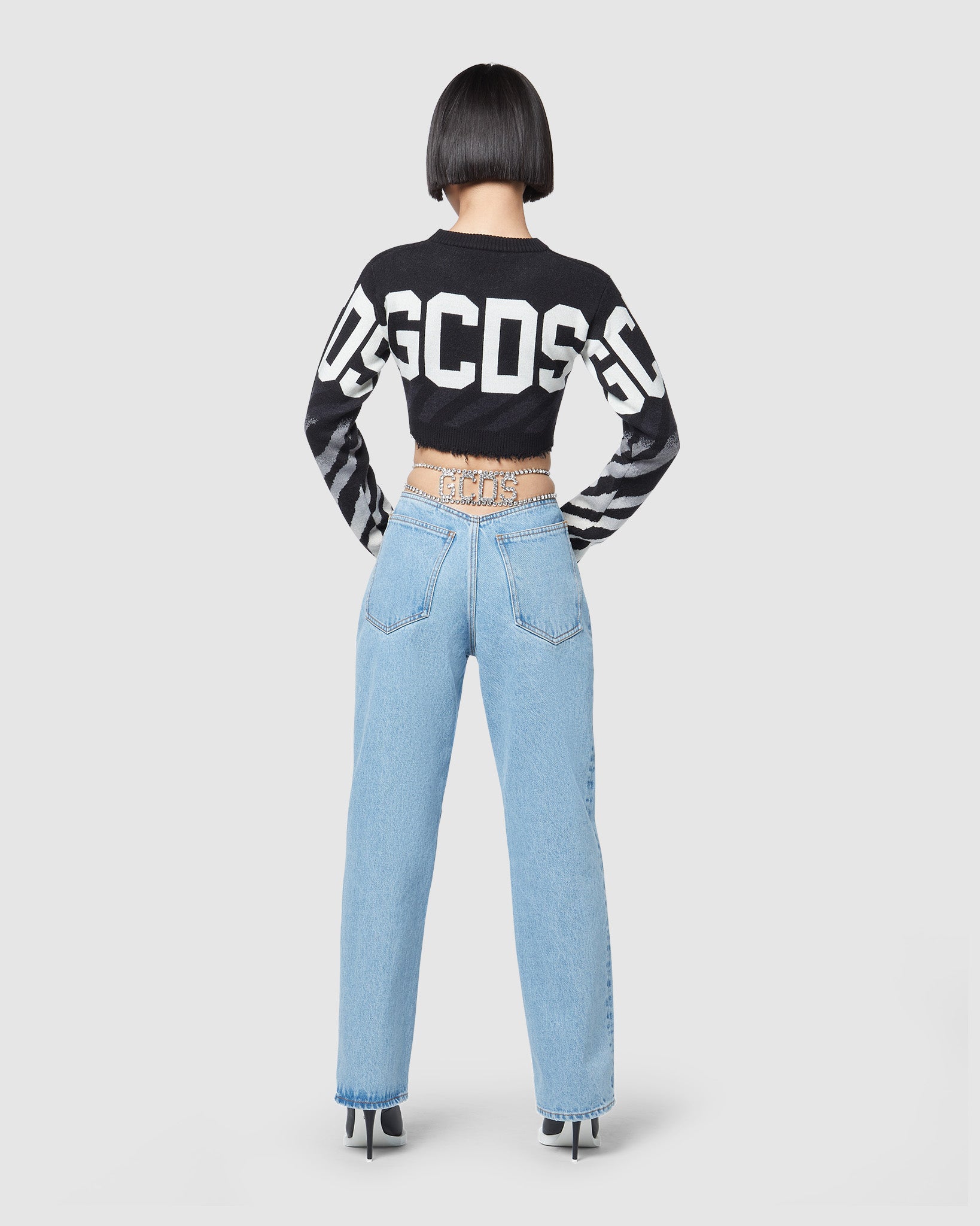 High-waisted light stone washed and bleached denim jeans. Contrasting tobacco-colored top-stitching. On the back, GCDS crystal logo belt on the waist. Straight leg cut.