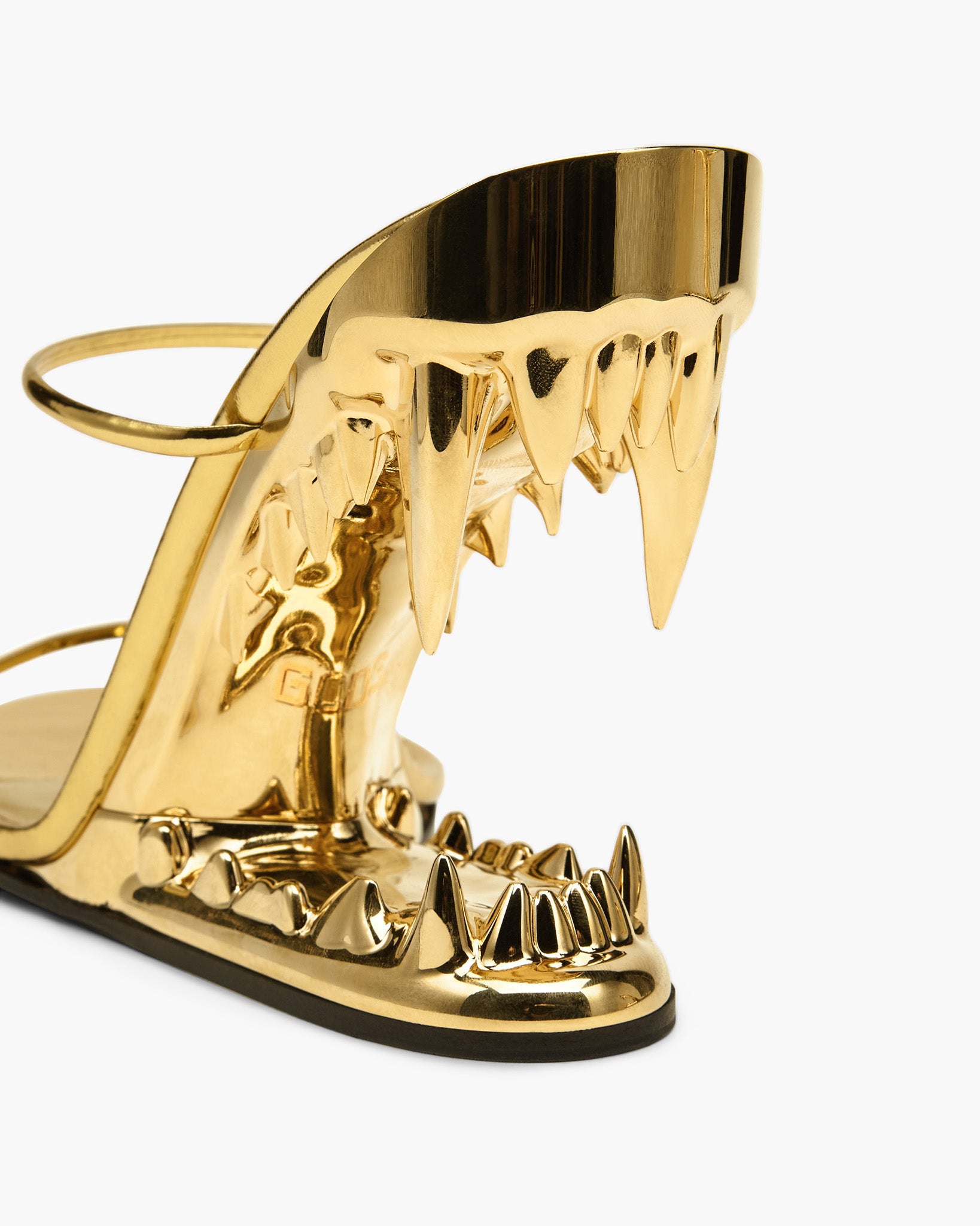 Morso sandal featuring the iconic Morso heel with mirror finish. Upper characterized with two metallic-effect leather straps. The leather insole has a hot-pressed GCDS logo stamped. Rounded toe.