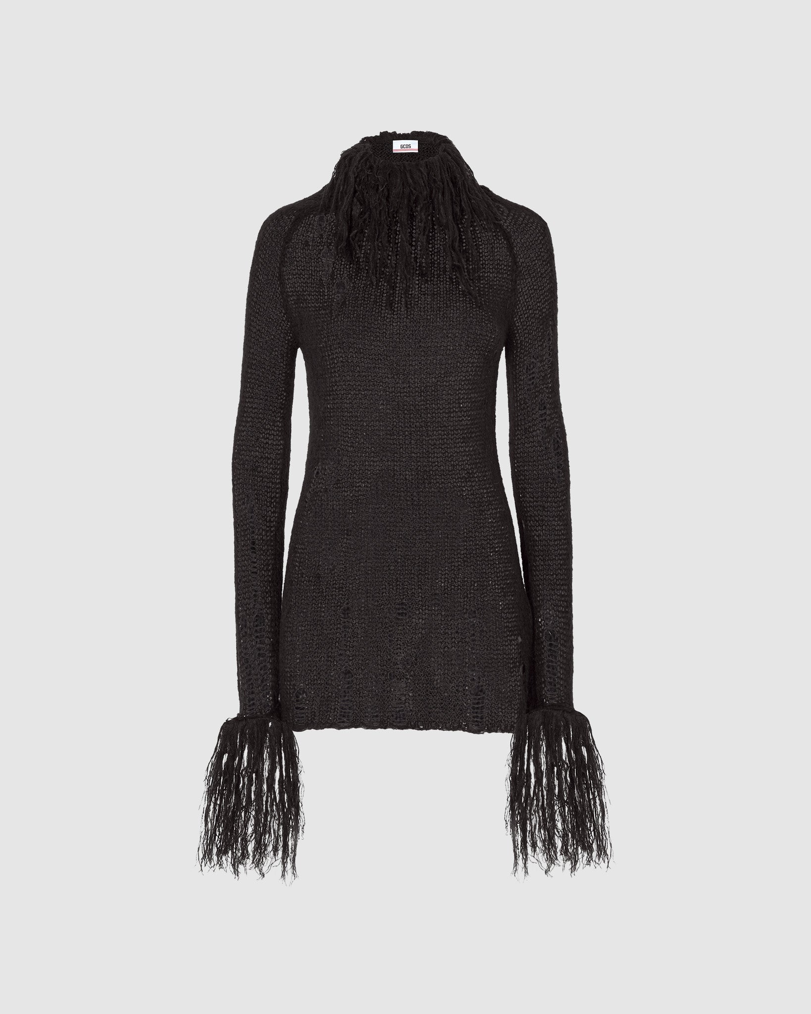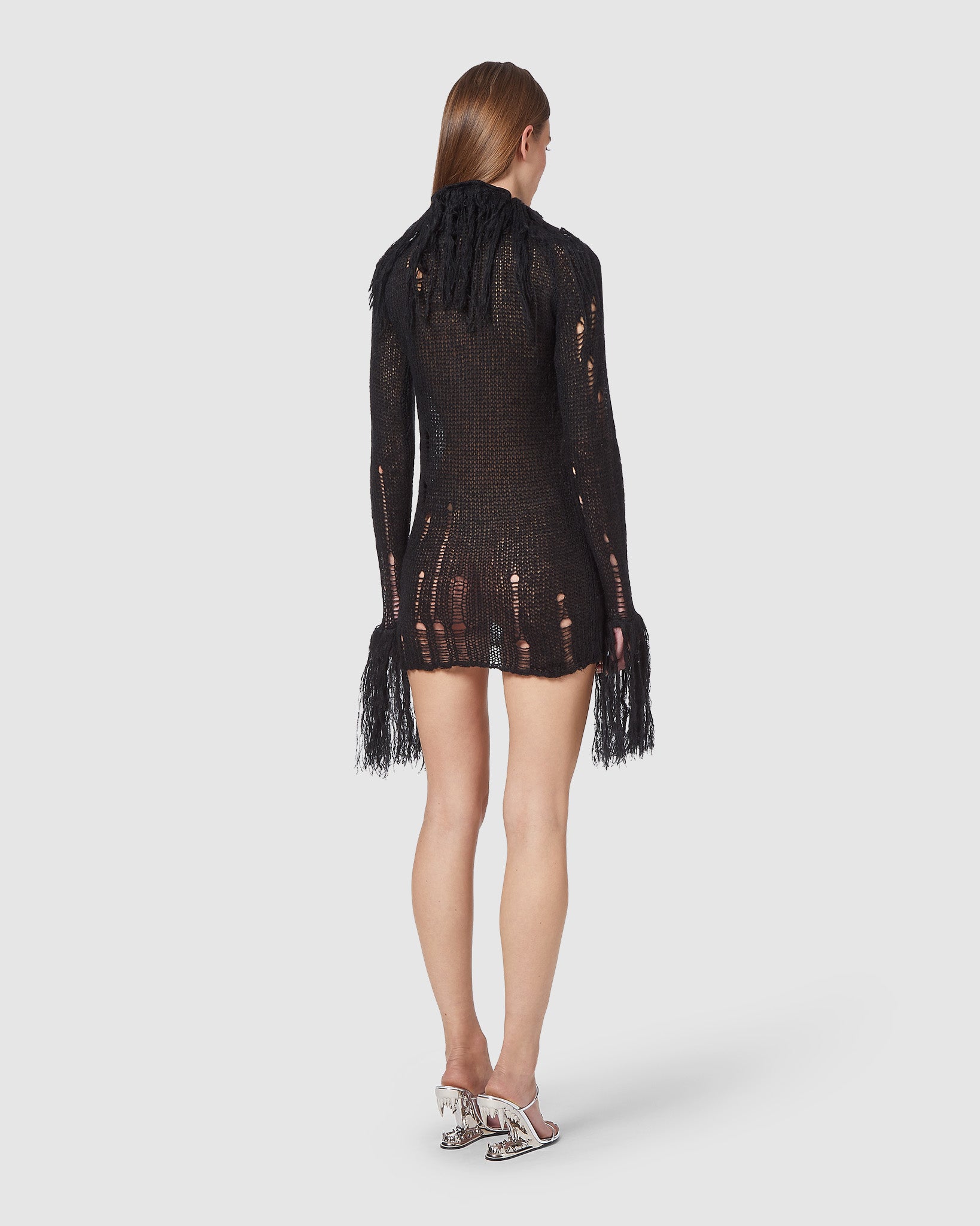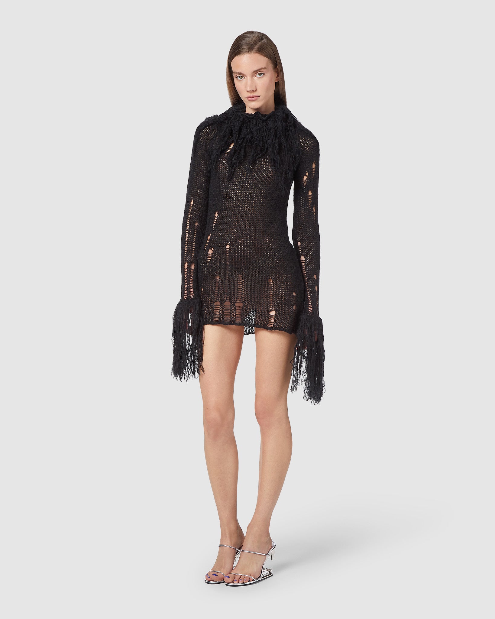 Sheer mohair dress with scattered rips and hand-applied wool feathers on neckline and sleeve bottoms.The wool feathers of each item has a One-of-a-kind production.