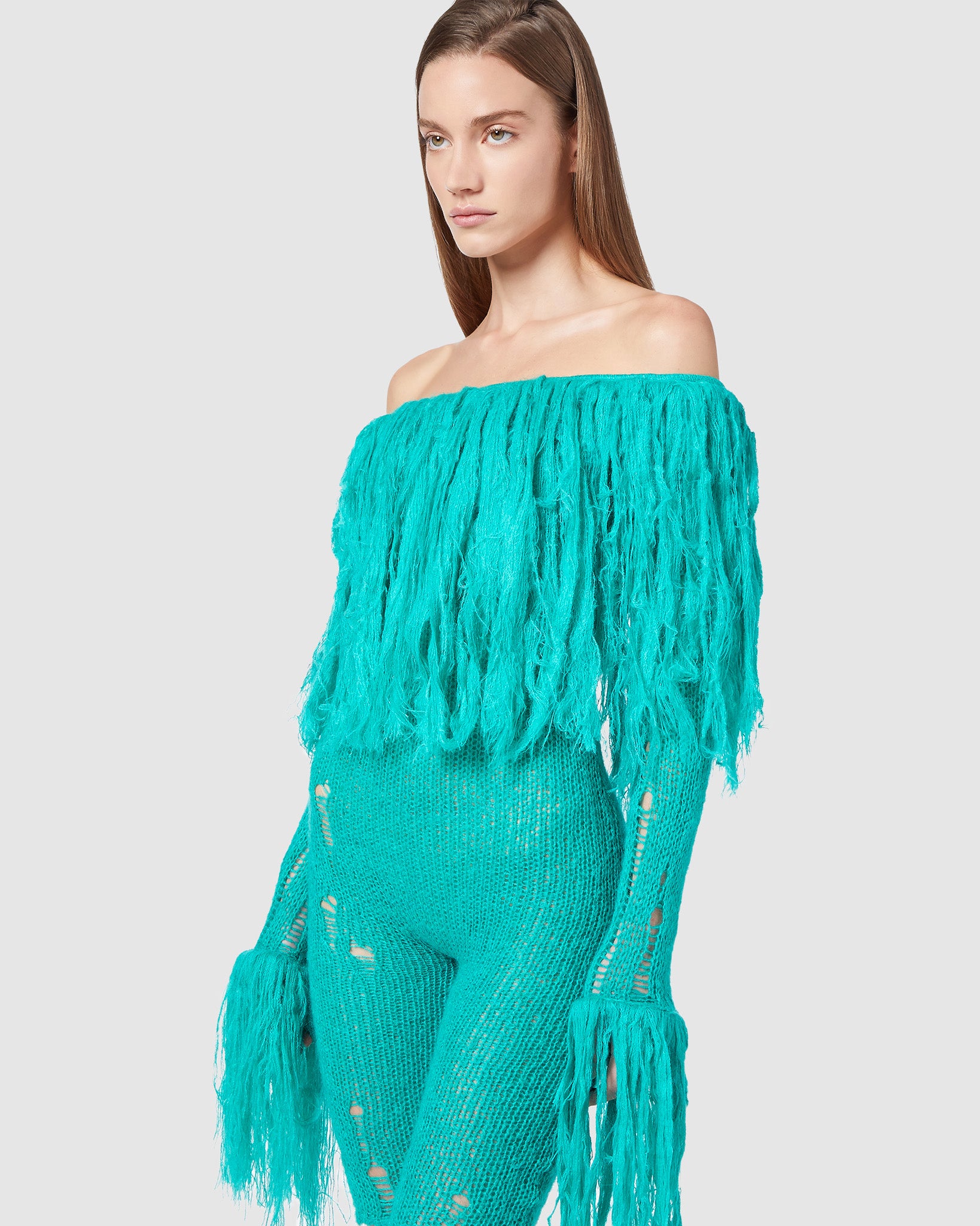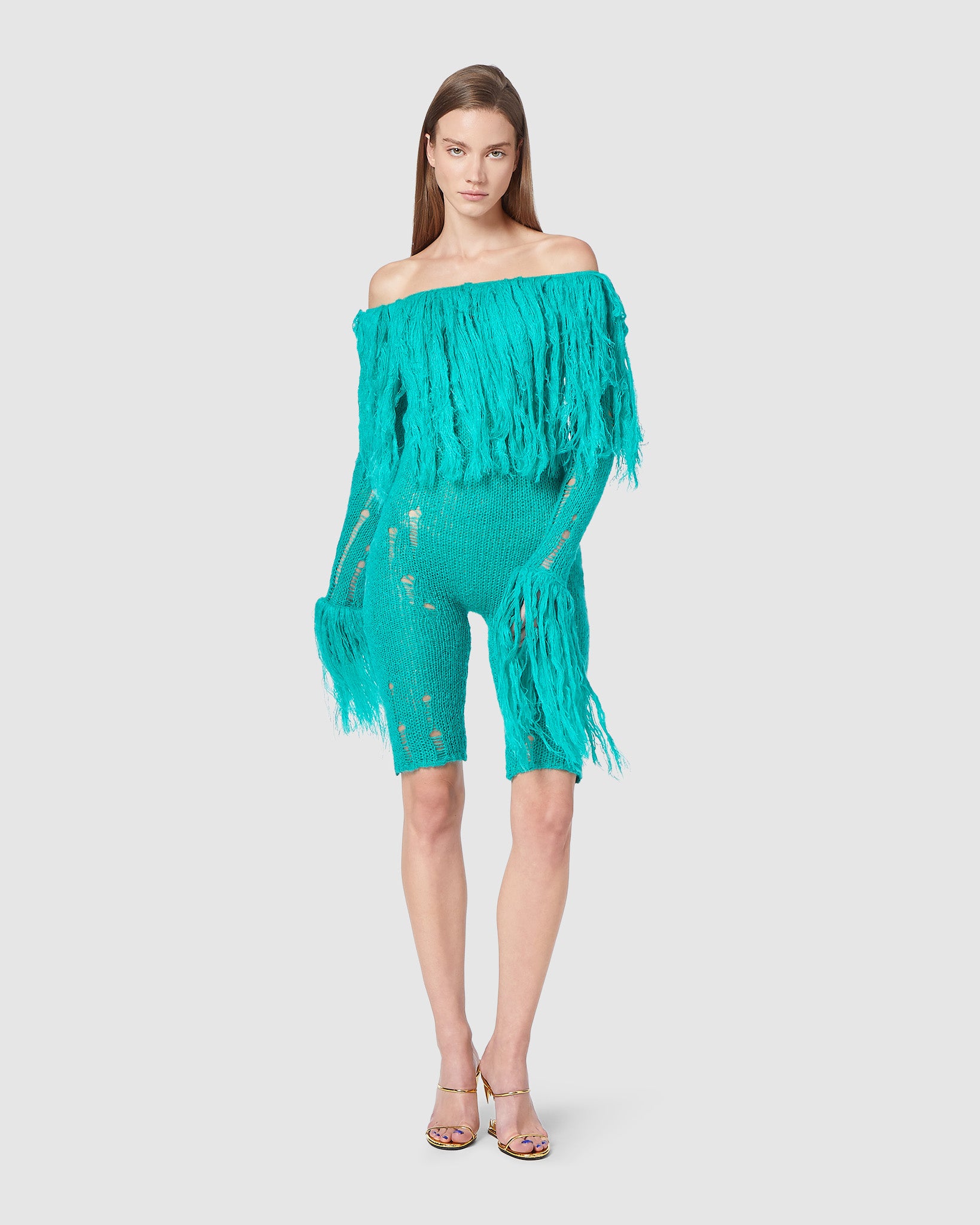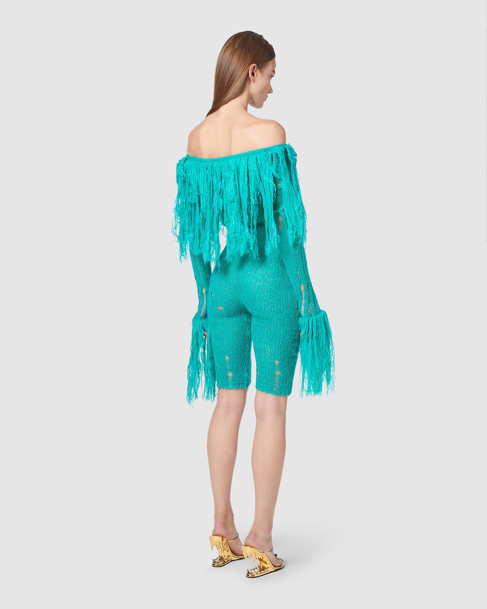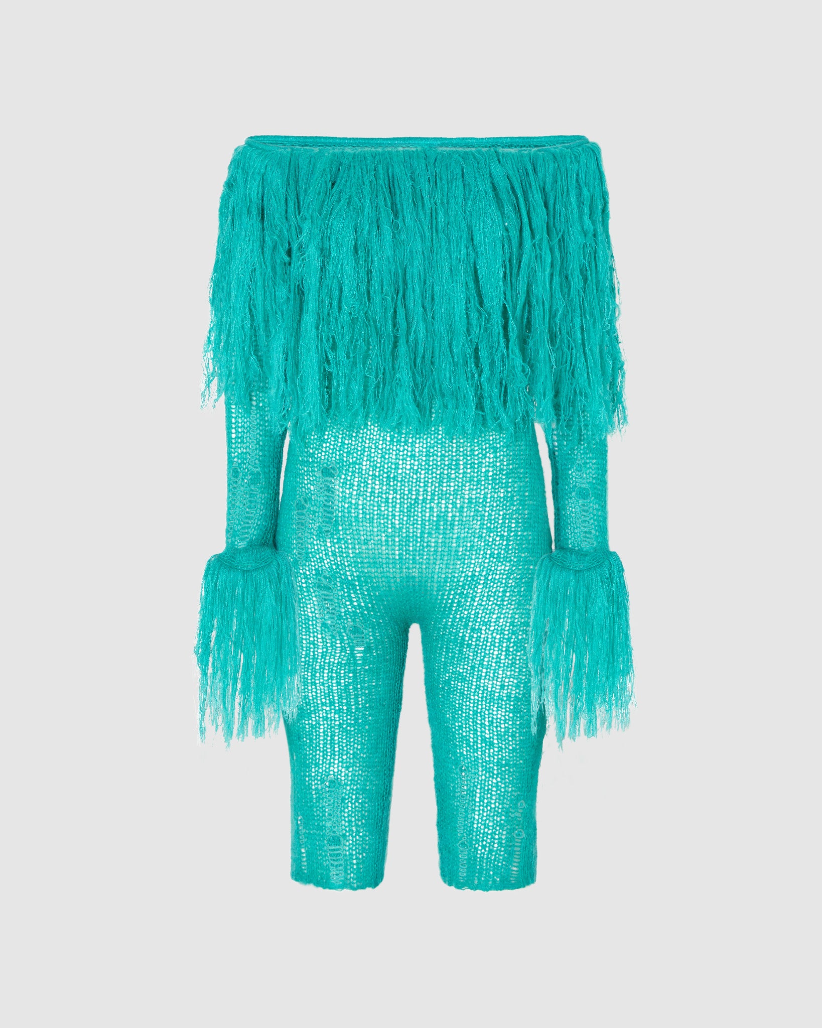 Sheer mohair jumpsuit with scattered rips and hand-applied wool feathers on neckline and sleeve bottoms.The wool feathers of each item has a One-of-a-kind production.