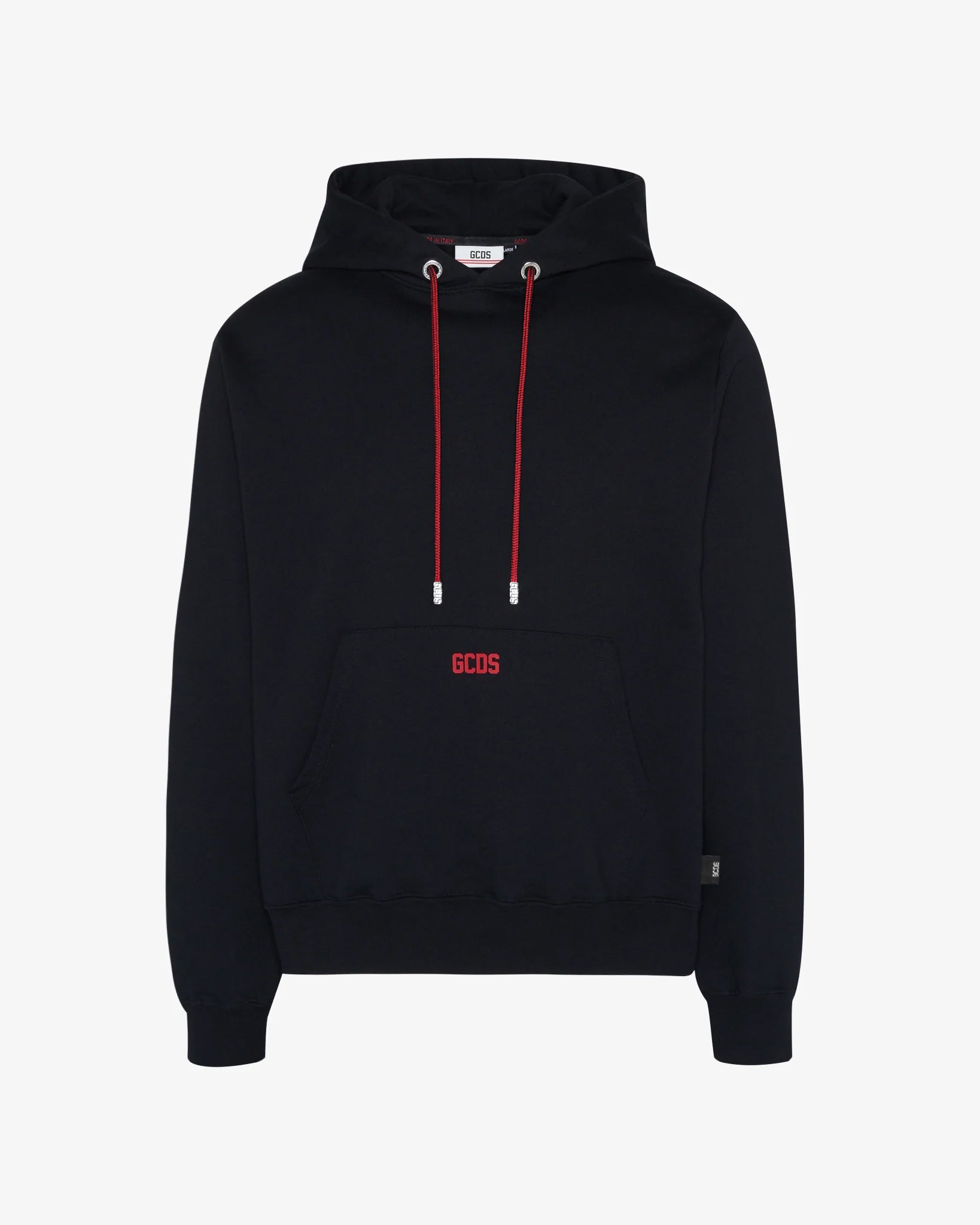 Long-sleeved organic cotton sweatshirt with adjustable hood. GCDS logo appliqué on the center of the pouch pocket and at the back, on the center of the hood. Oversized fit.