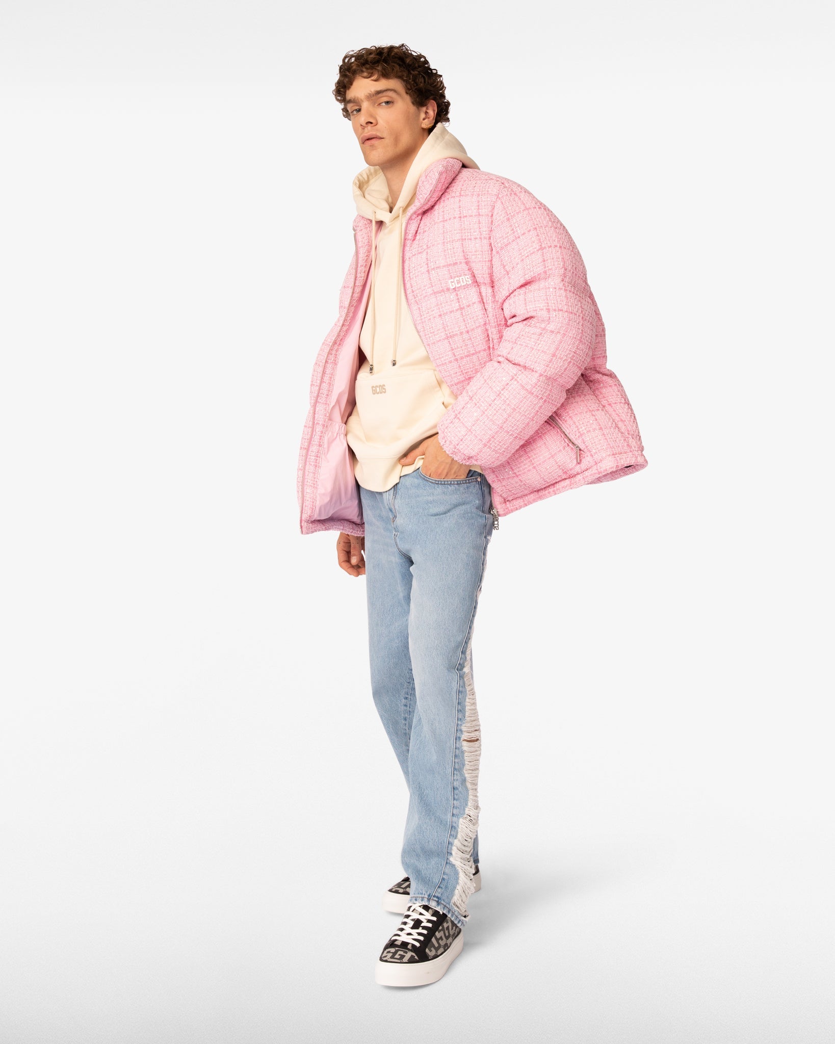 Organic cotton long-sleeved oversized sweatshirt with adjustable hood and logoed cord aglets. GCDS logo applied on the center of the pouch pocket and at the back, on the center of the hood.