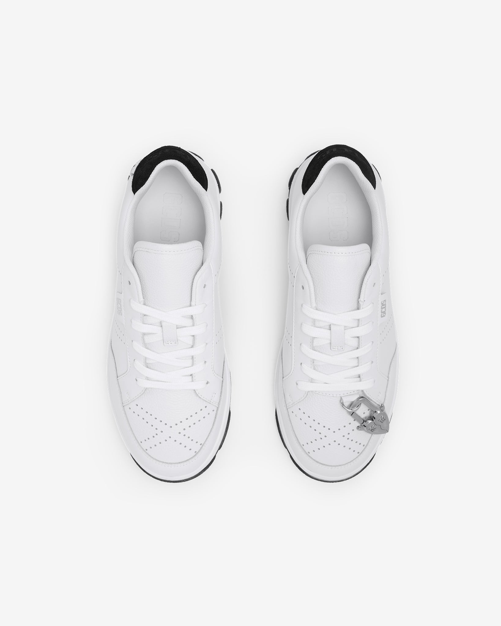 Vintage-inspired low top sneakers with smooth and grained calfskin leather vamp. Iconic X perforations on the toebox and sides of the vamp. Padded tongue. Detailing on the vamp and contrasted tread. Vamp characterized by three small eyelets to which GCDS “heart piercing” snap hooks may be added. Leather-covered Fussbett with heat-printed logo. Internal mesh lining.
