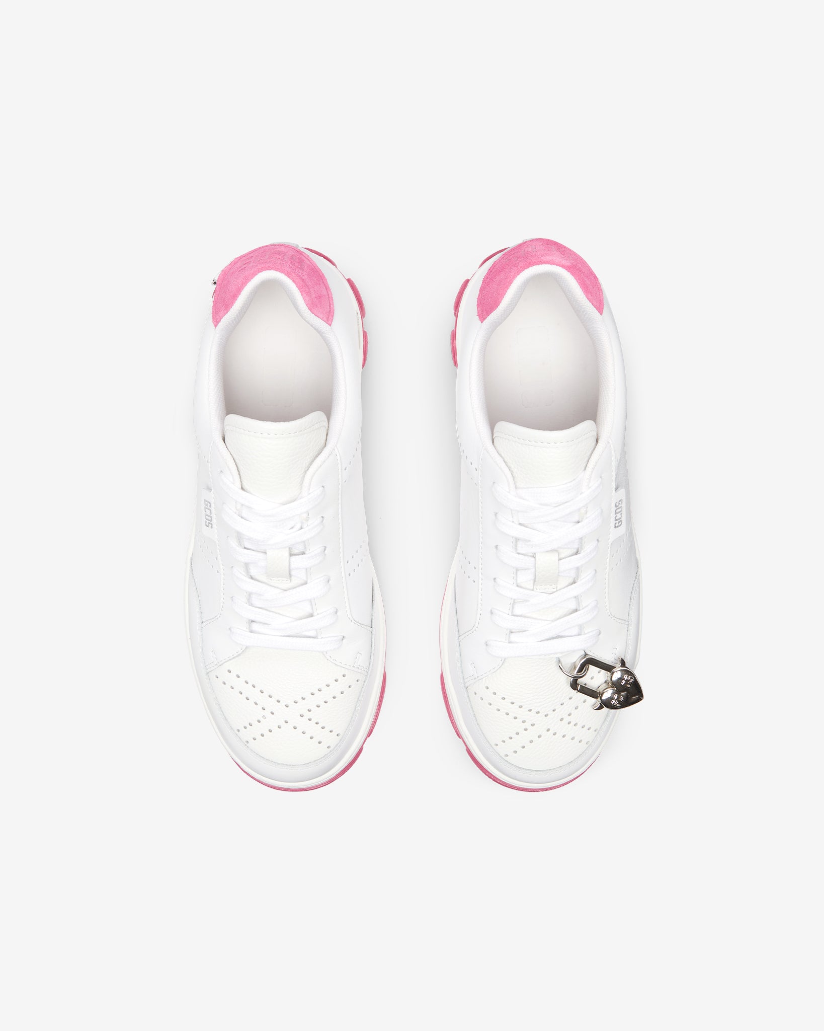 Vintage-inspired low top sneakers with smooth and grained calfskin leather vamp. Iconic X perforations on the toebox and sides of the vamp. Padded tongue. Detailing on the vamp and contrasted tread. Vamp characterized by three small eyelets to which GCDS “heart piercing” snap hooks may be added. Leather-covered Fussbett with heat-printed logo. Internal mesh lining.