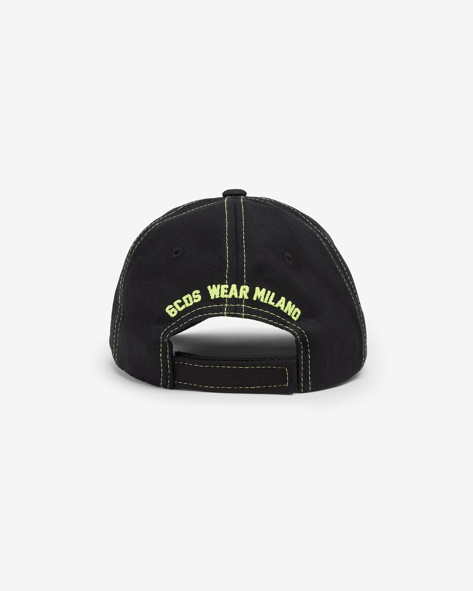 GCDS cotton gabardine baseball cap with logo embroidery on the front. “GCDS Wear Milano” embroidery on the back closure of the cap. Matching lining with grosgrain logo appliqué.
