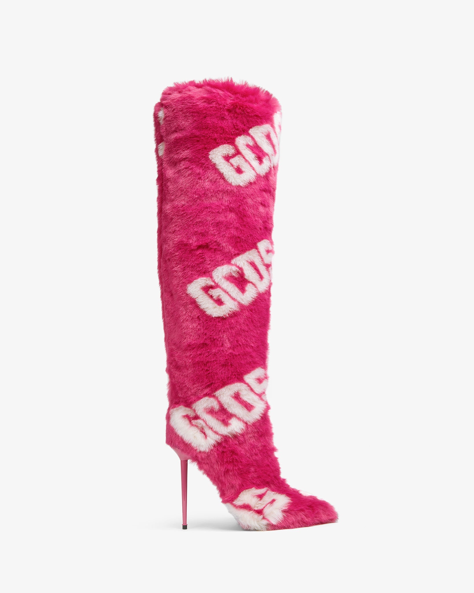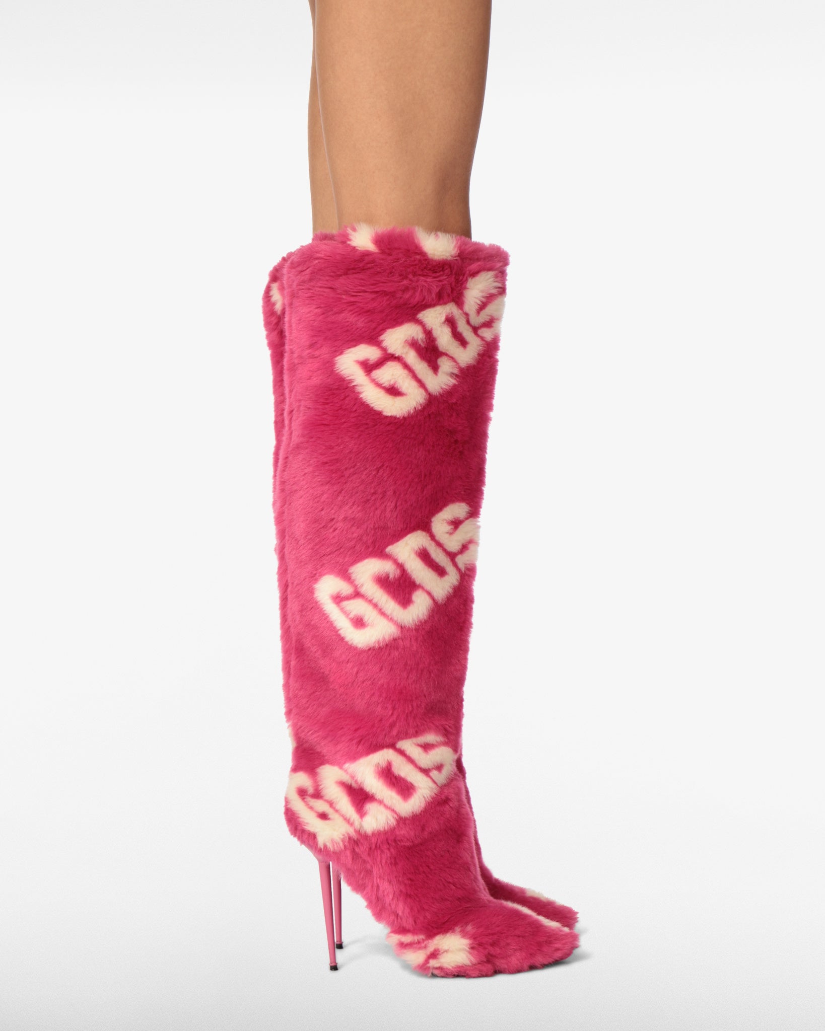 Knee-high faux fur stiletto boots with GCDS logo. The internal micro platform provides comfort and support while walking. Tube fit.