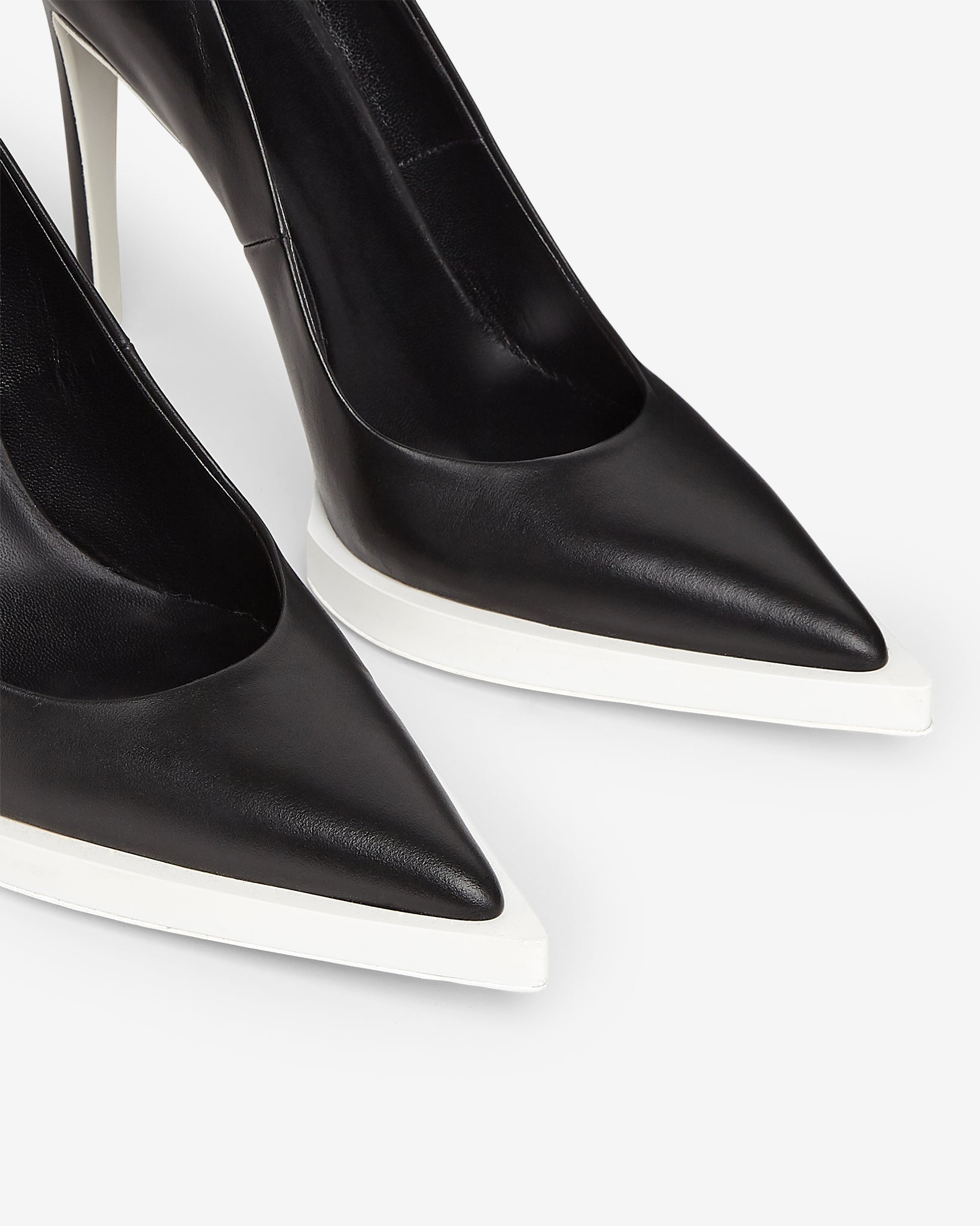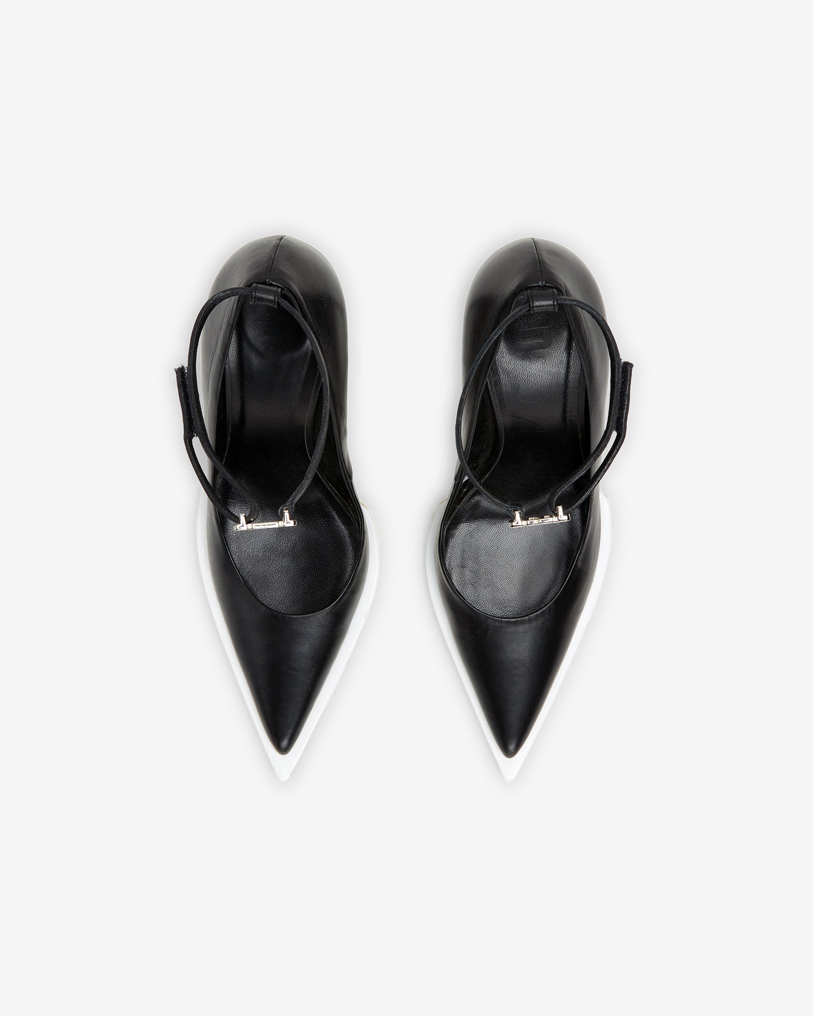 Leather pumps with stiletto heel characterized by a protruding platform to accentuate the shape of the toe. Ankle strap with polished nickel GCDS logo and velcro closure.