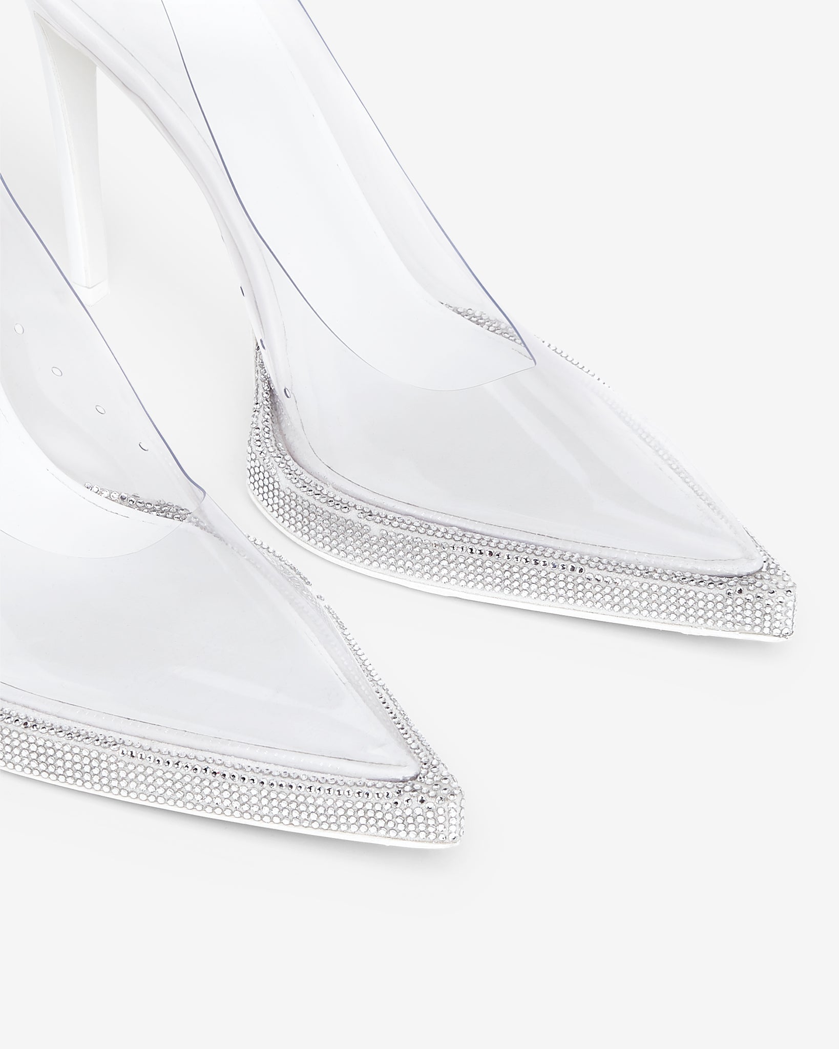 Unlined PVC pumps with stiletto heel characterized by a protruding platform to accentuate the shape of the toe. Platform covered in rhinestone fabric. Ankle strap with polished nickel GCDS logo and velcro closure. The leather insole has a hot-pressed GCDS logo stamped. Pointed toe.