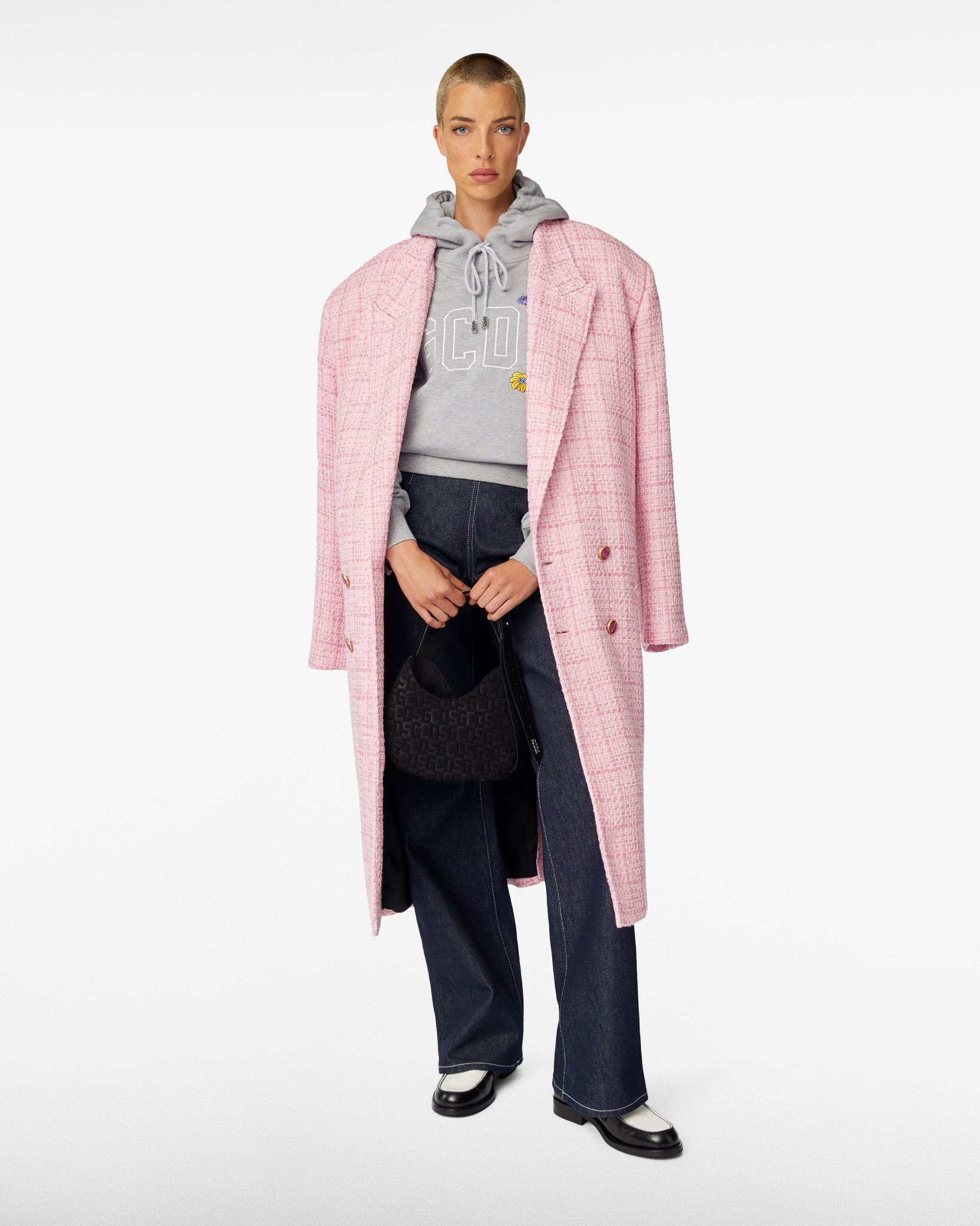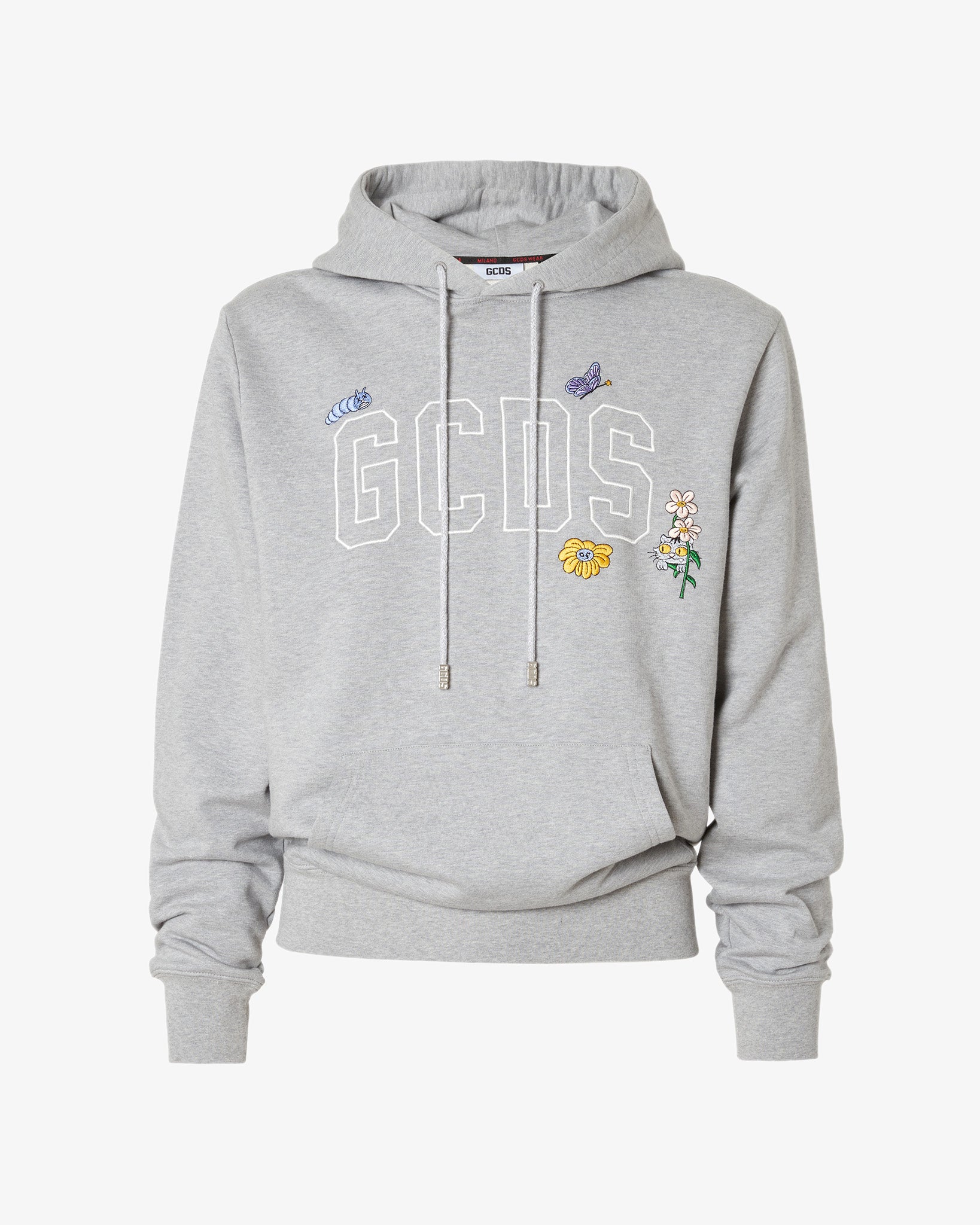 Oversized hoodie made from cotton jersey. Adjustable hood with logoed cord aglets. Long sleeves with cuffs and pouch pocket on the front. An embroidery detail of the GCDS logo and floral motifs completes the garment.
