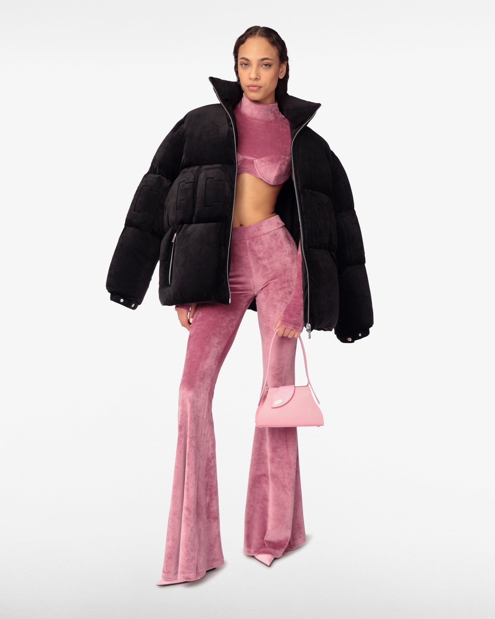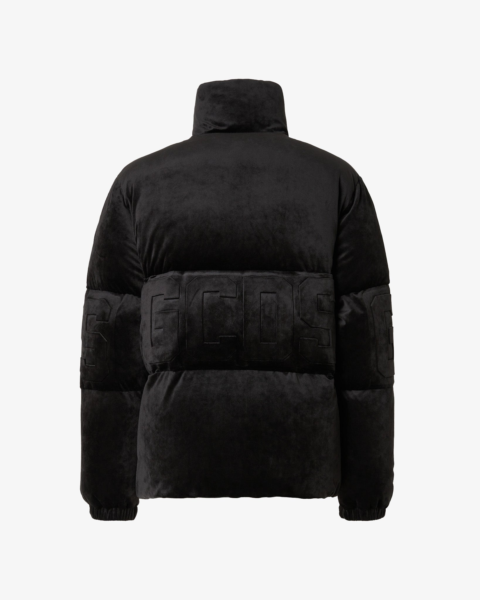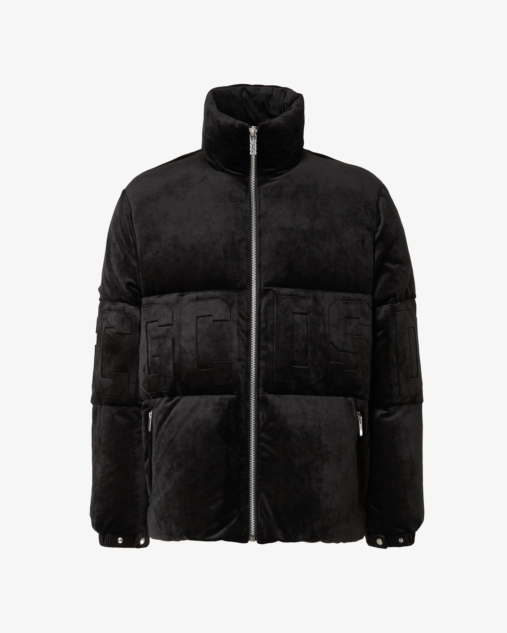 Padded jacket made of stretch velvet. High collar and front closure with metal zipper and logoed zipper pull. The garment features embossed GCDS logo on the front and back.
