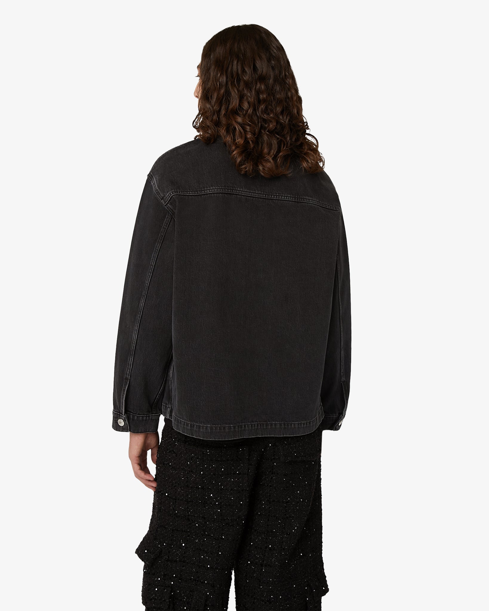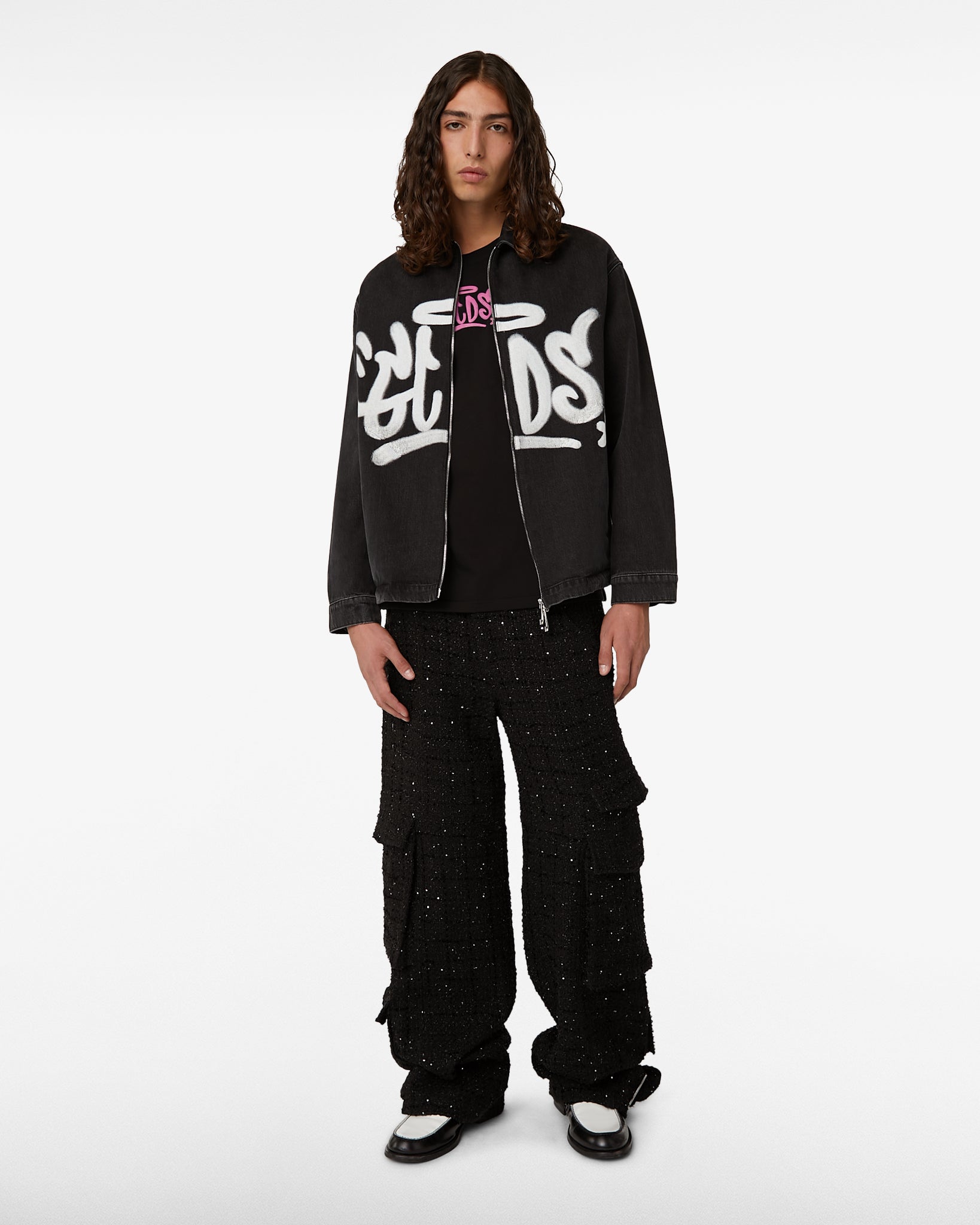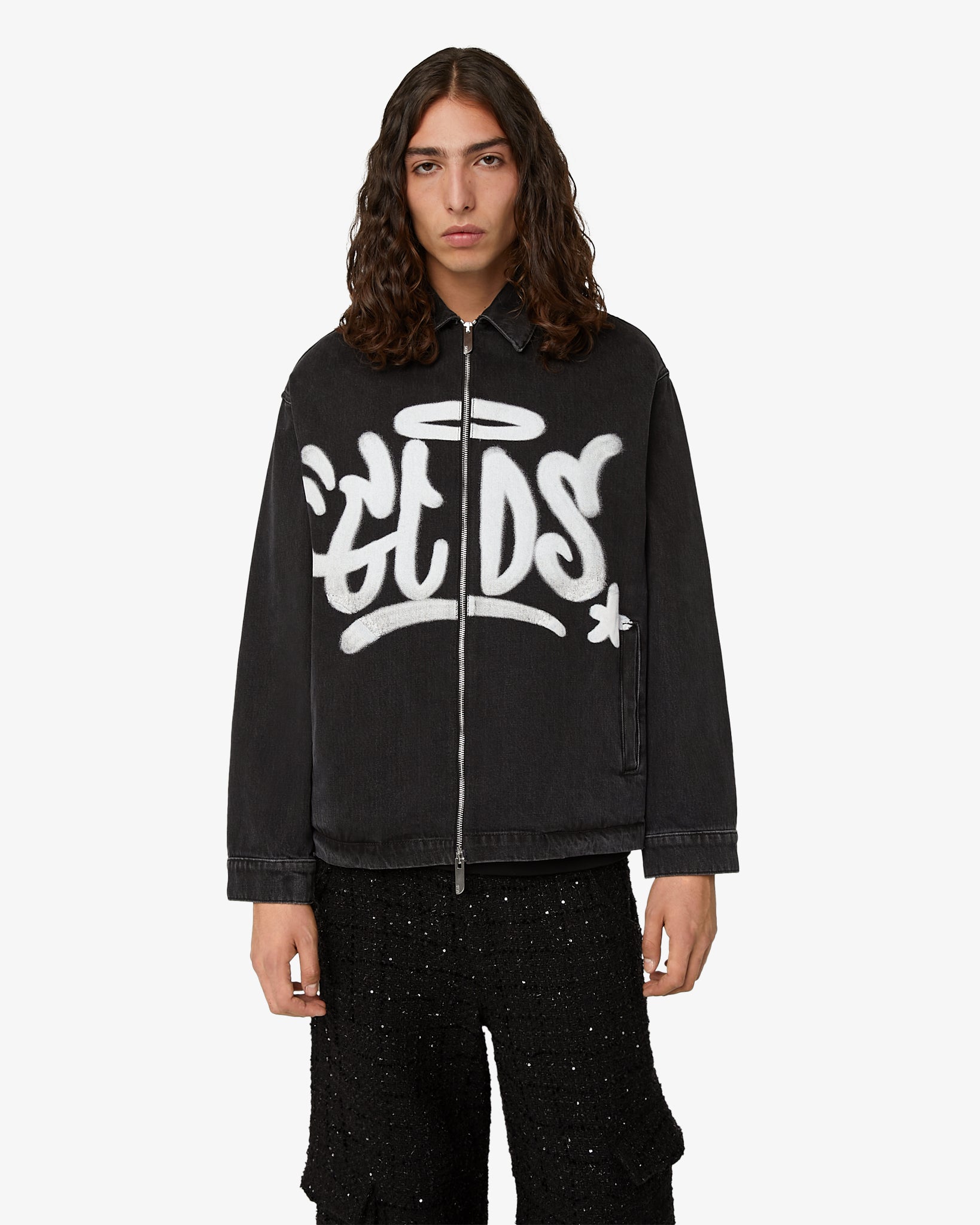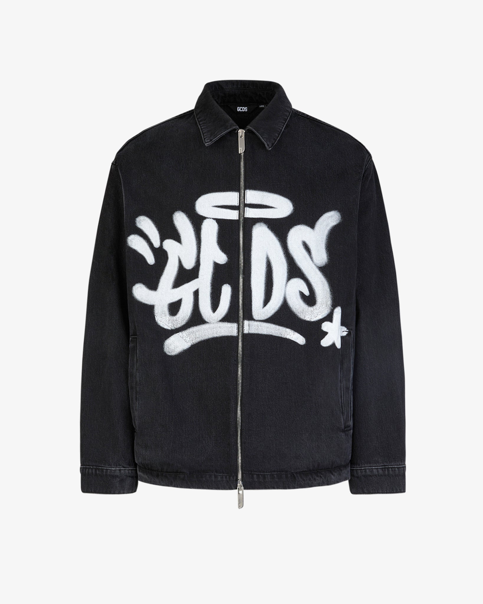 Harrington jacket made of denim with a shirt collar, a metal zipper and logoed zipper puller. The classic model, reinterpreted with a modern twist, features a spary effect GCDS "Graffiti" print positioned on the front.