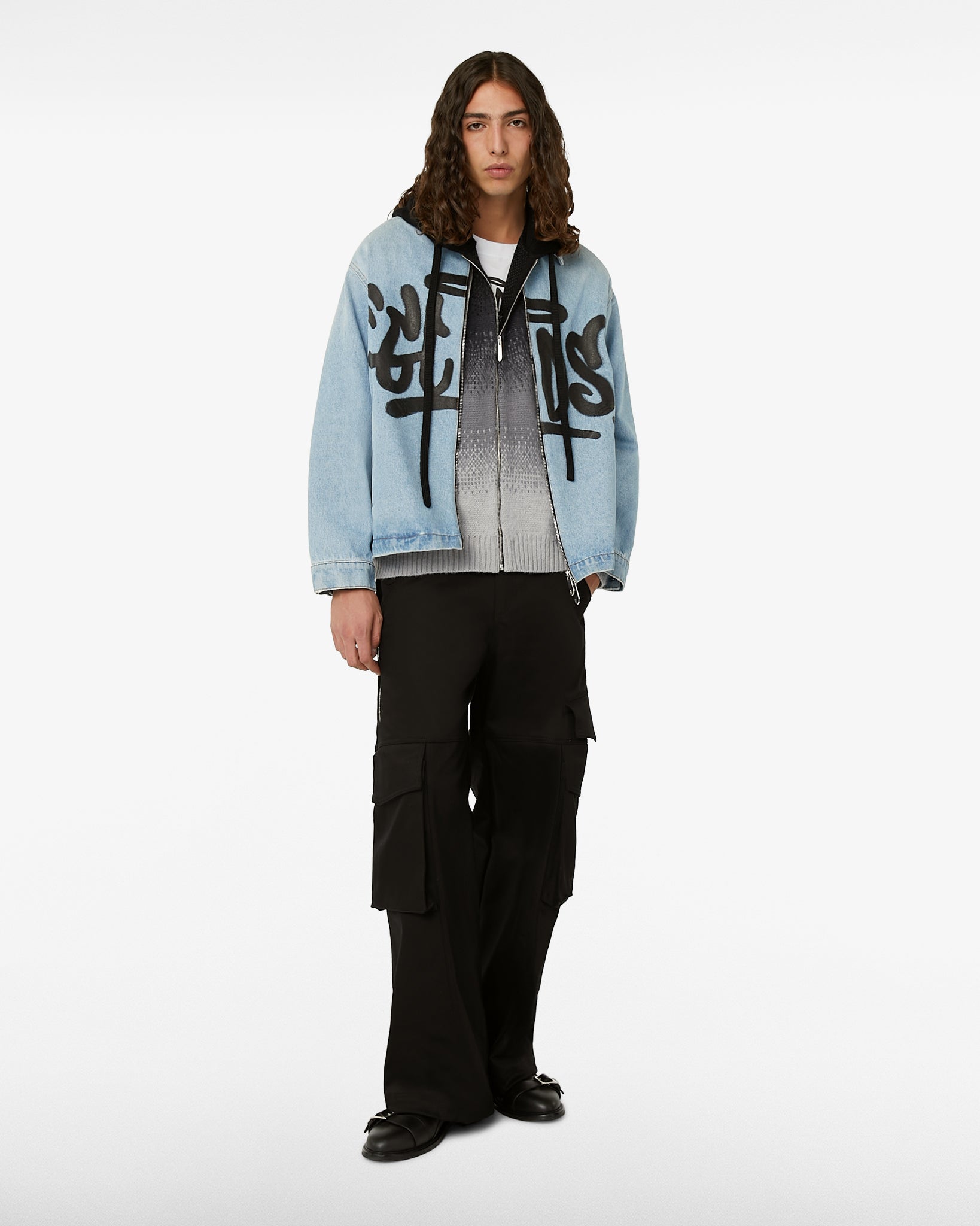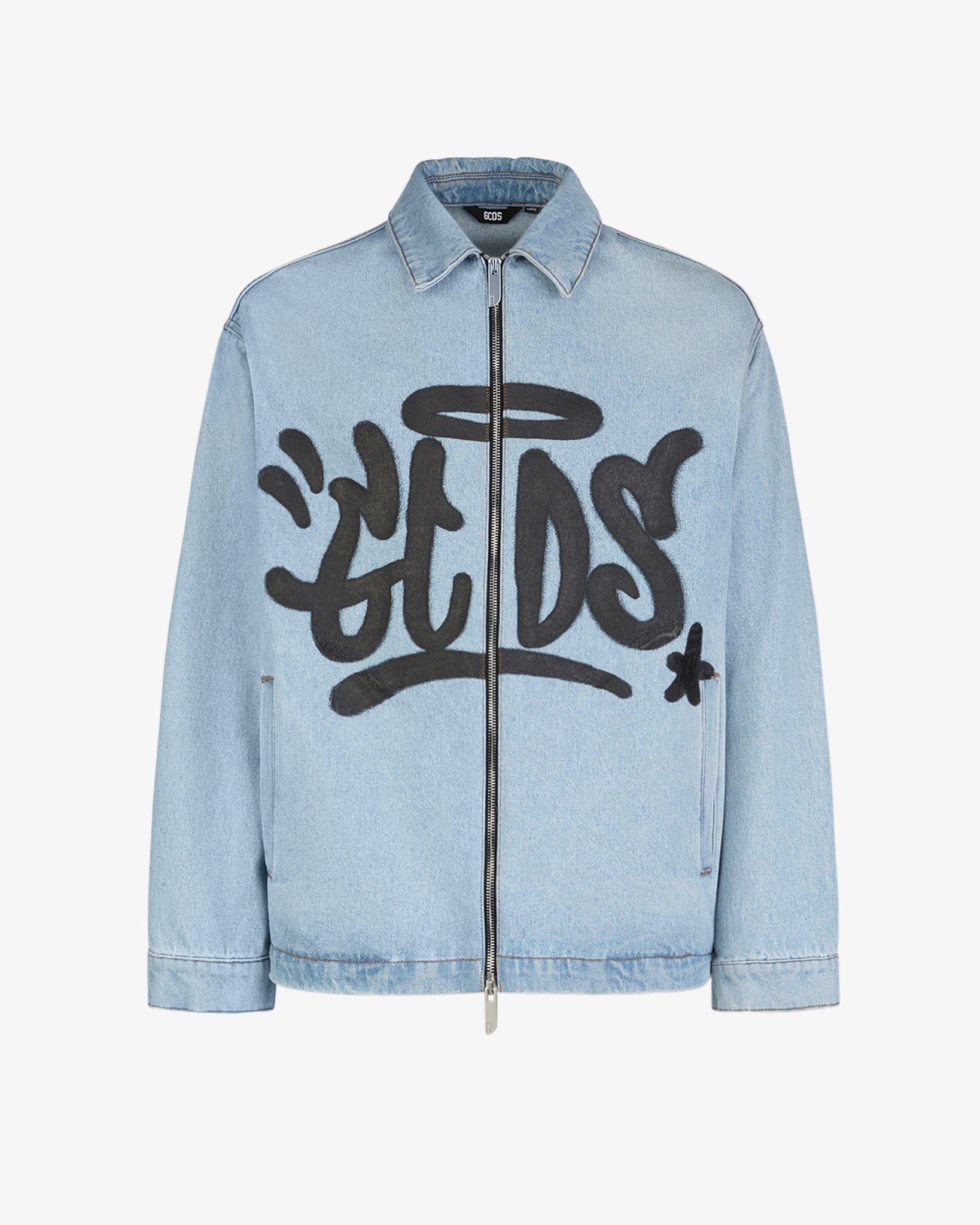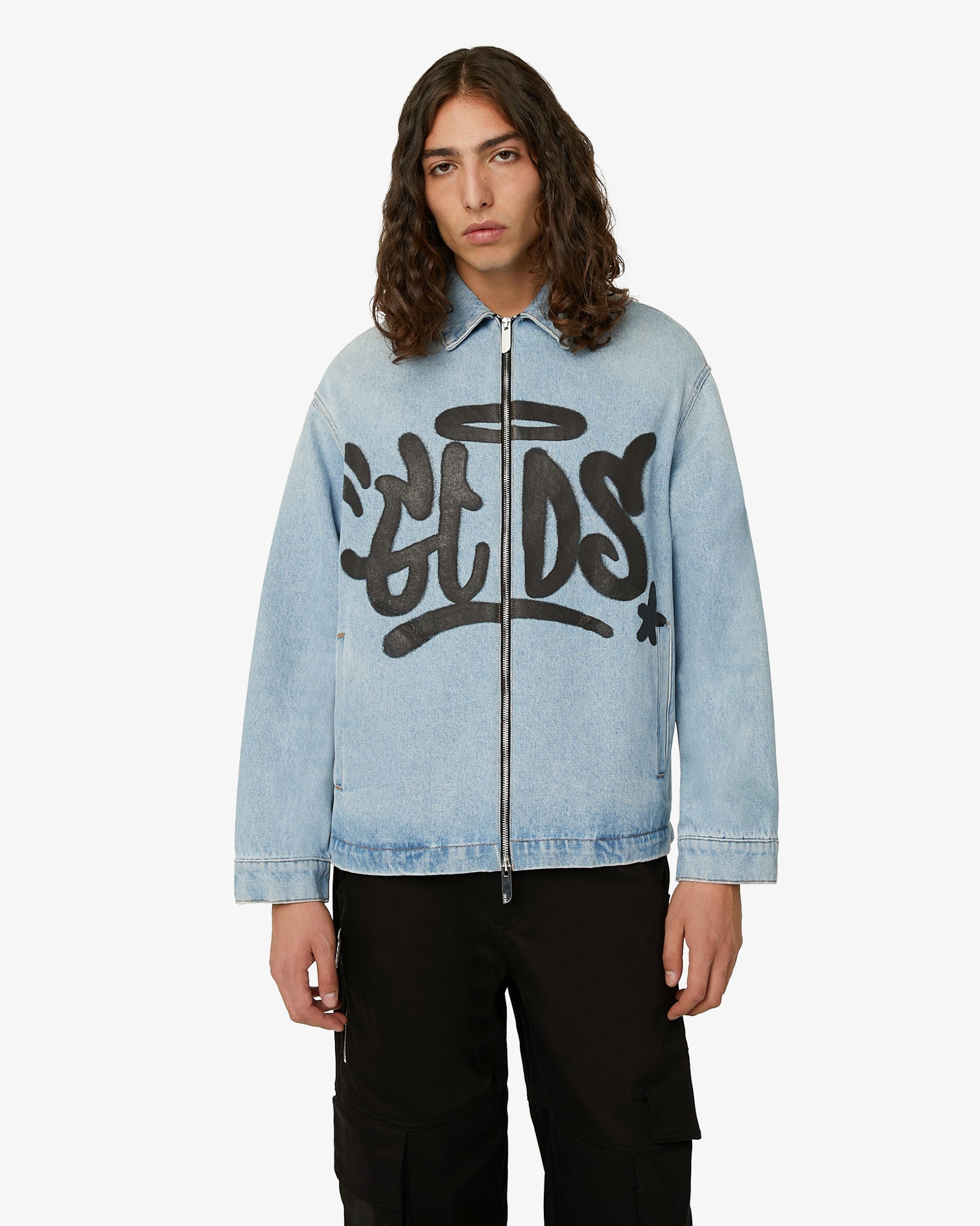 Harrington jacket made of denim with a shirt collar, a metal zipper and logoed zipper puller. The classic model, reinterpreted with a modern twist, features a spary effect GCDS "Graffiti" print positioned on the front.