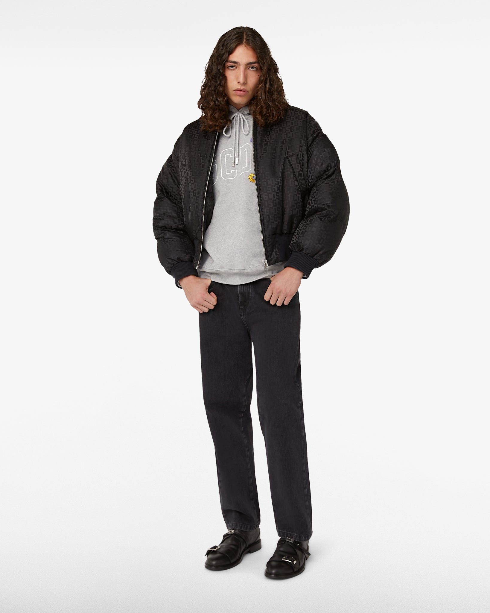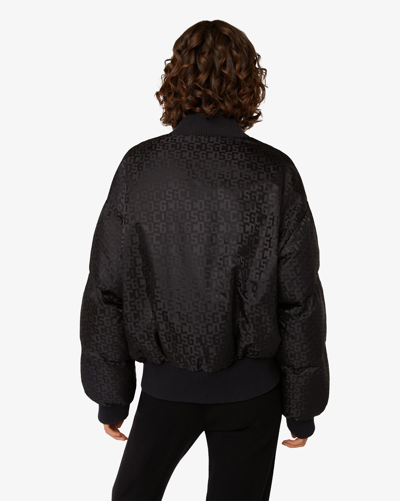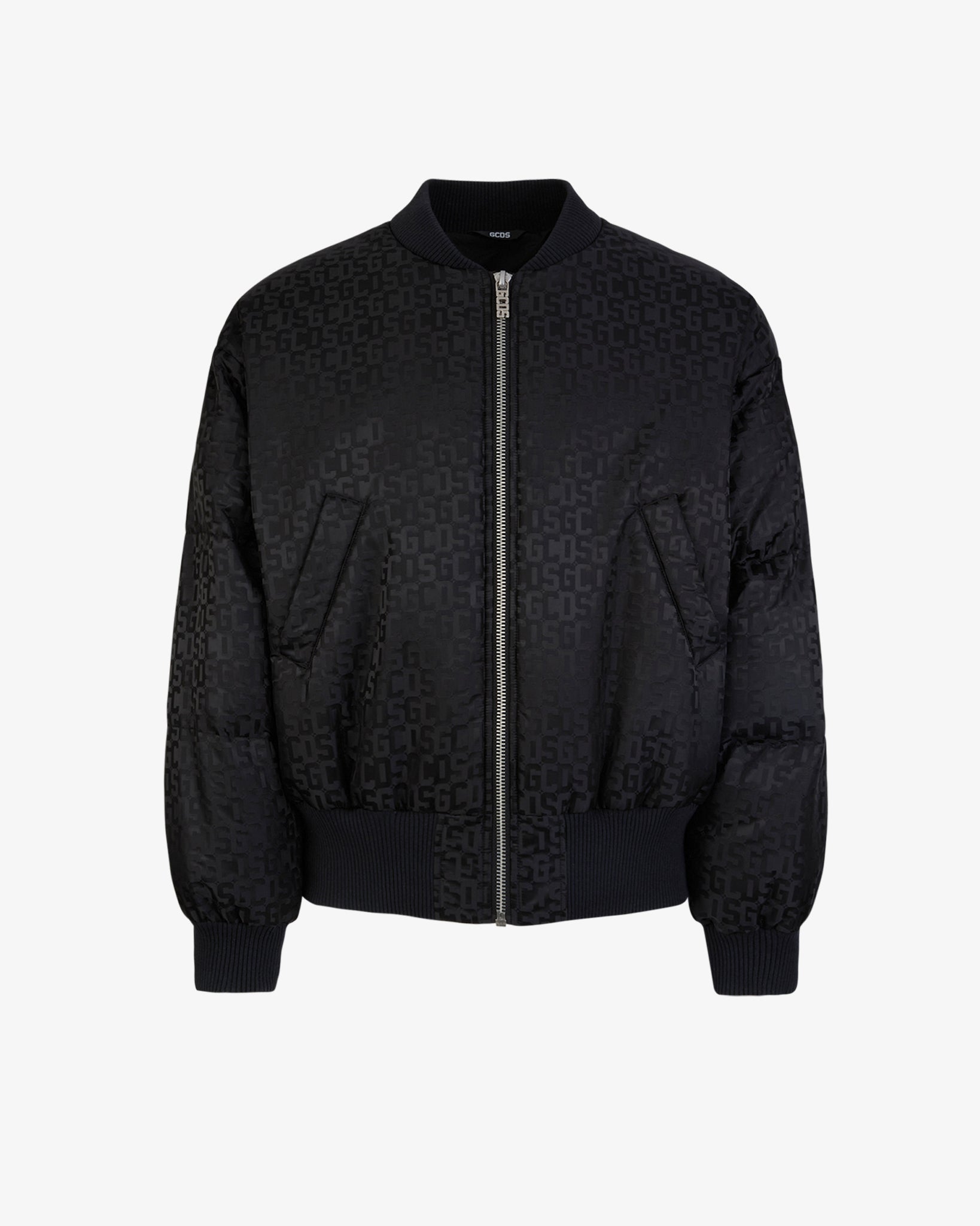 Padded round-neck bomber jacket made with ECONYL® yarn, which is sourced from nylon waste and is 100 percent regenerable. Features the all-over tone-on-tone GCDS monogram pattern. Long sleeves and front welt pockets. Metal zipper front closure. Ribbed trim at collar and cuff bottoms. Oversize fit.