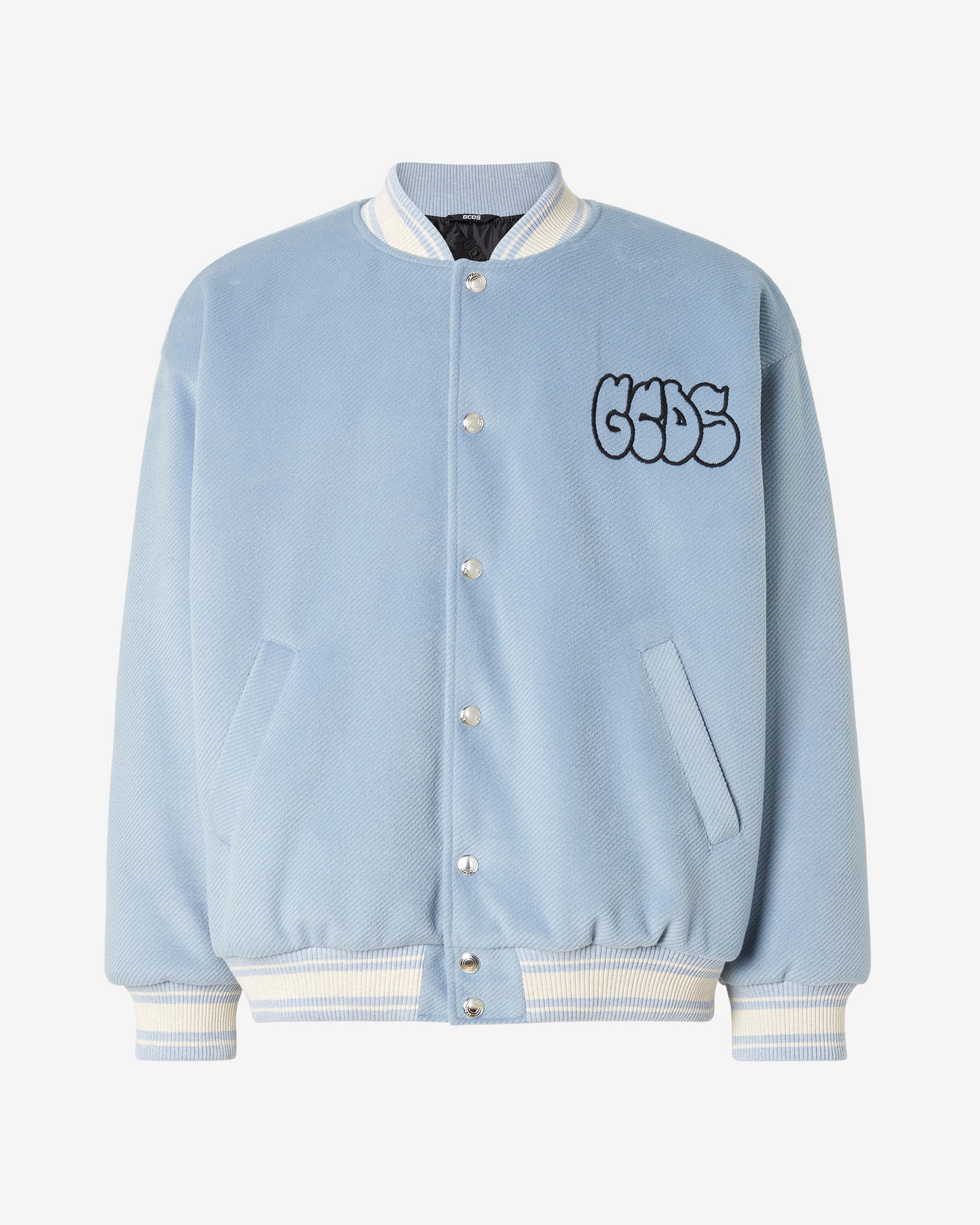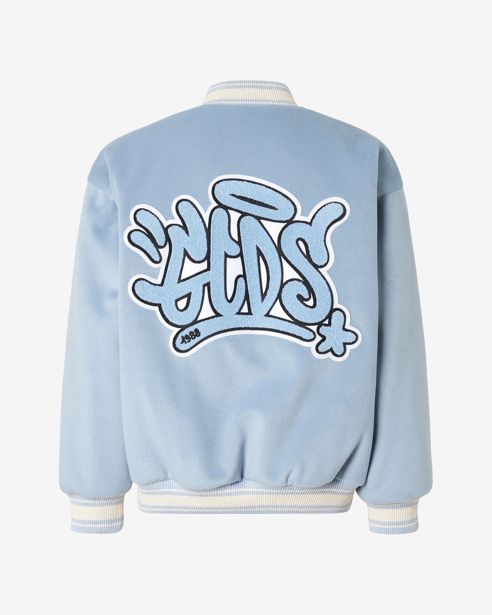 Graffiti-Logo varsity bomber is crafted with a contrast hemline finish detailing at the waist, sleeves, and neck, and contrasting graffiti logo detailing at the front. There is also a patch graffiti at the back, and has a metallic press-button closure.