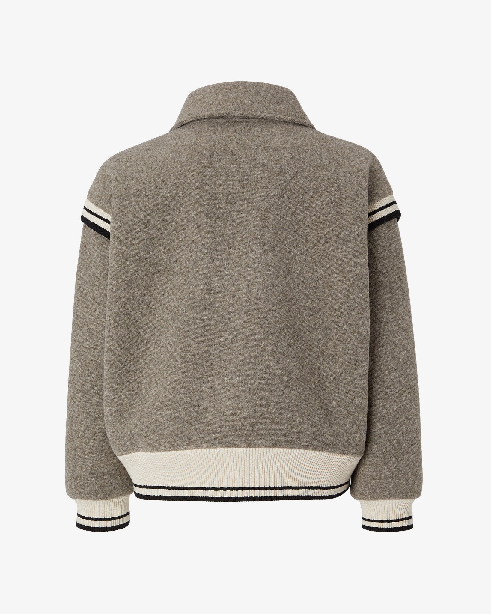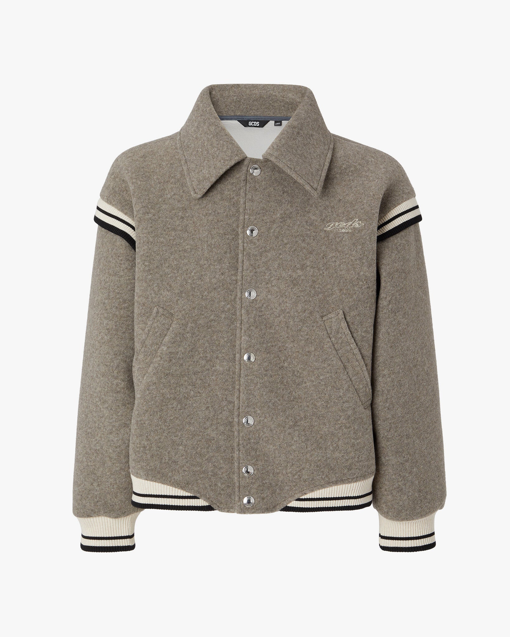 Collared GCDS Team Bomber is crafted from wool blend for a timelessly stylish look. It features a black and white striped ribbed collar, contrast buttons, and the GCDS logo in contrast on the front. Two side pockets complete the classic design.