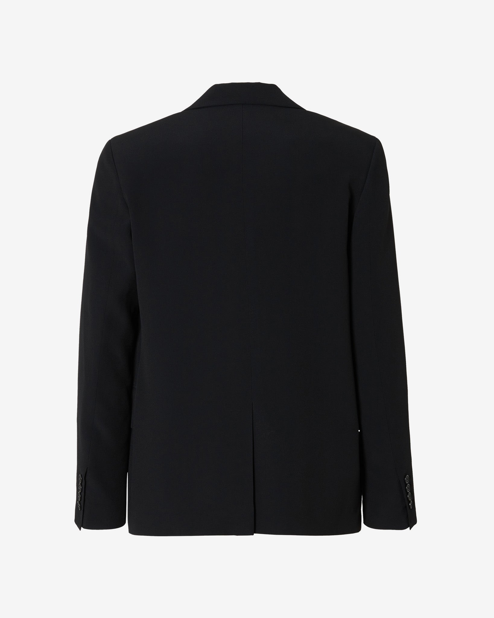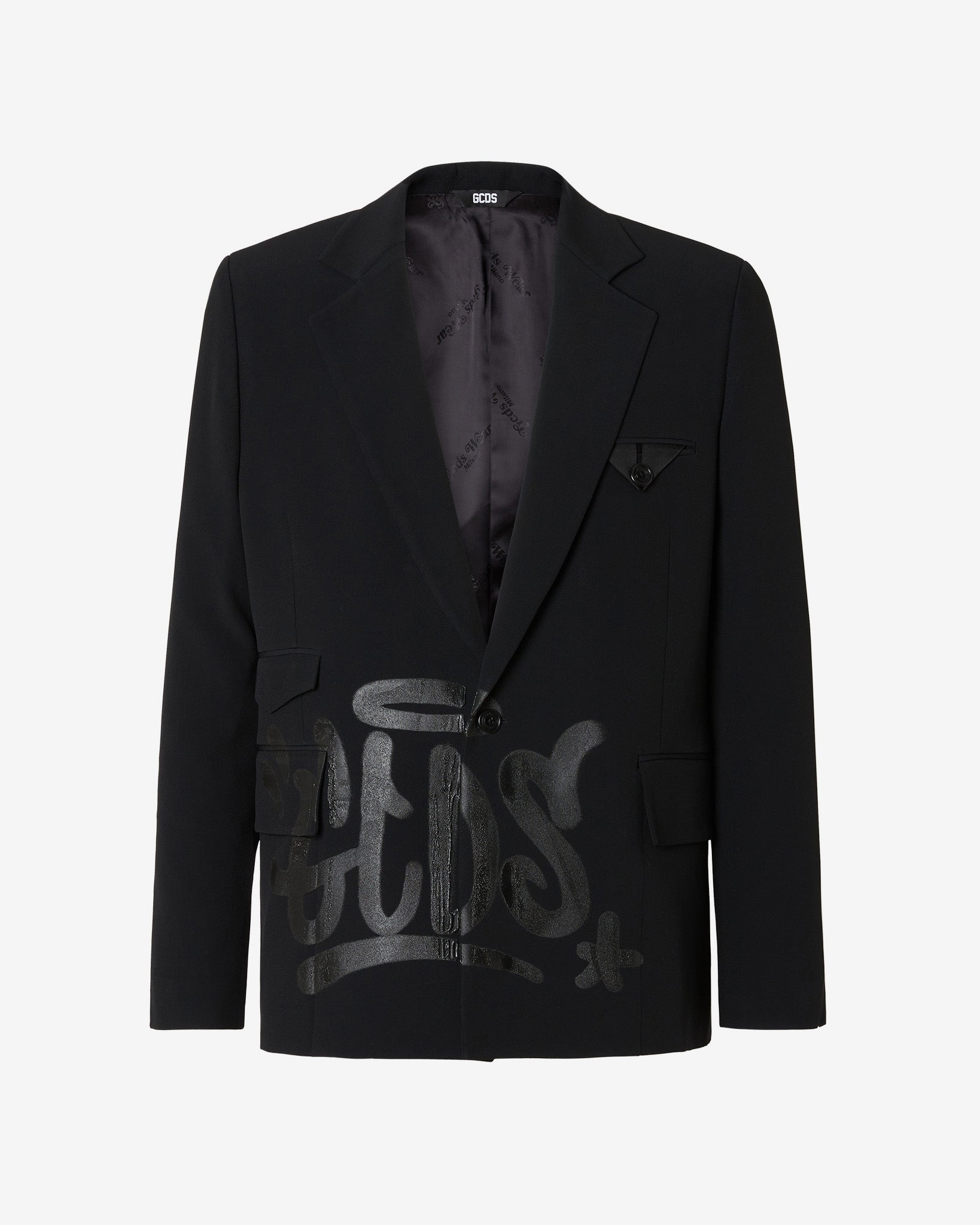 Single-breasted blazer made of silk with lapel collar and long sleeves. GCDS "Graffiti" semi-gloss spray effect print on the front carried out on finished garment. Front flap pockets with matching button closure. Jacquard logo lining adds a touch of elegance.