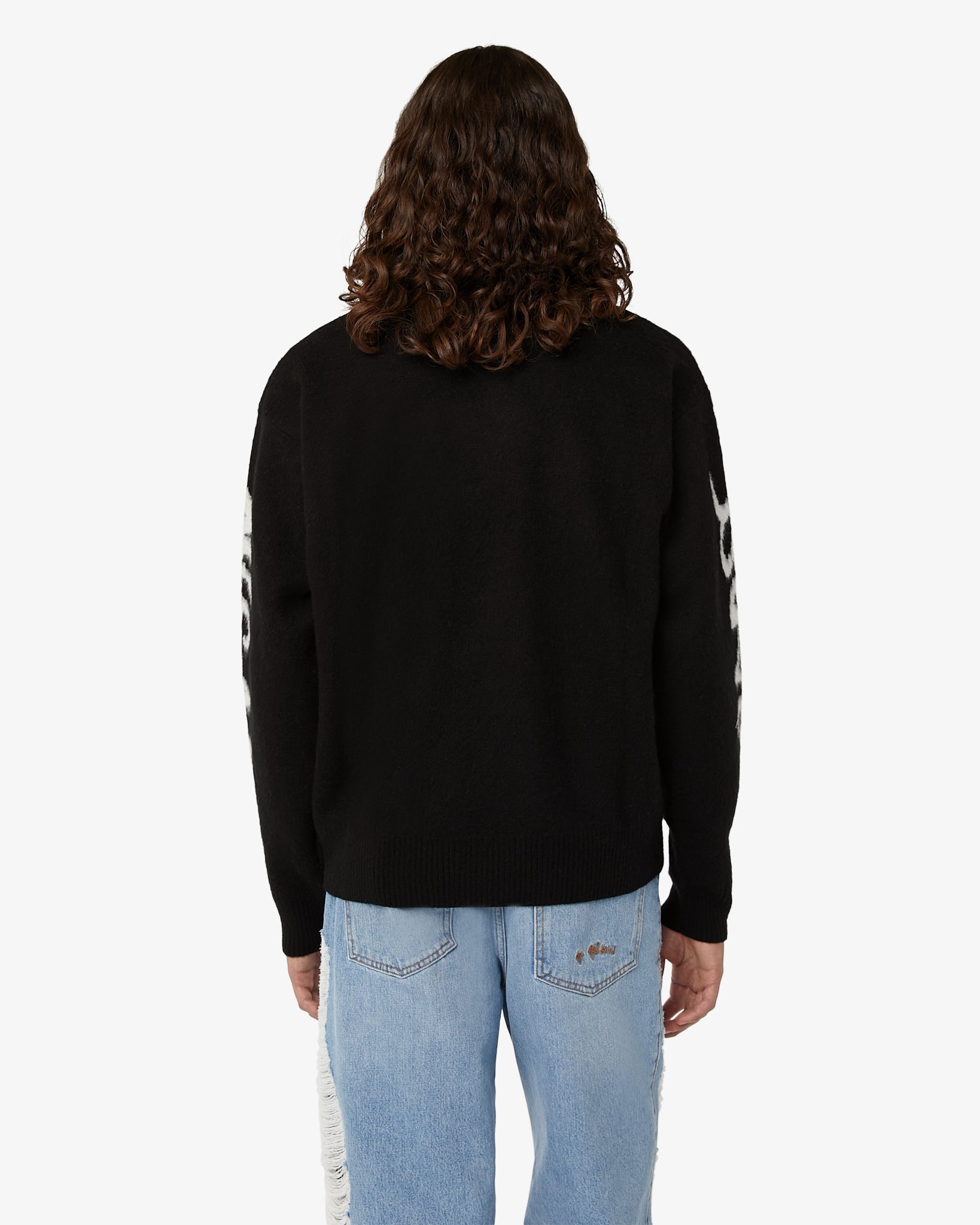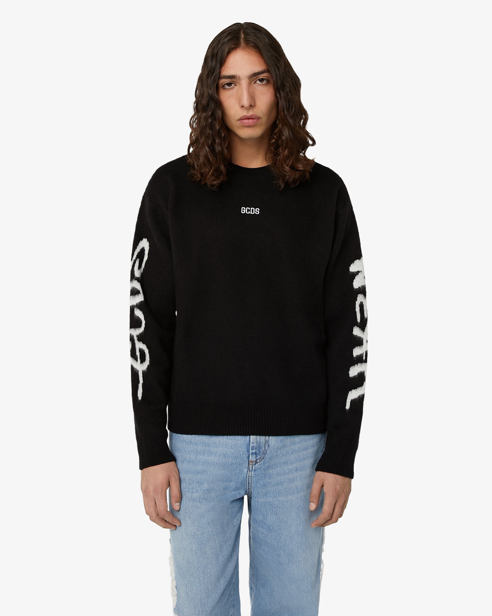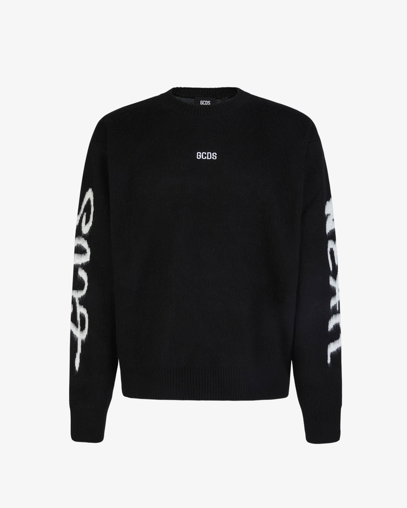 Crewneck sweater made from a soft fur-effect wool blend. The garment is enriched with GCDS Wear jacquard print "Graffiti" effect on the sleeves and GCDS logo placed on the front.