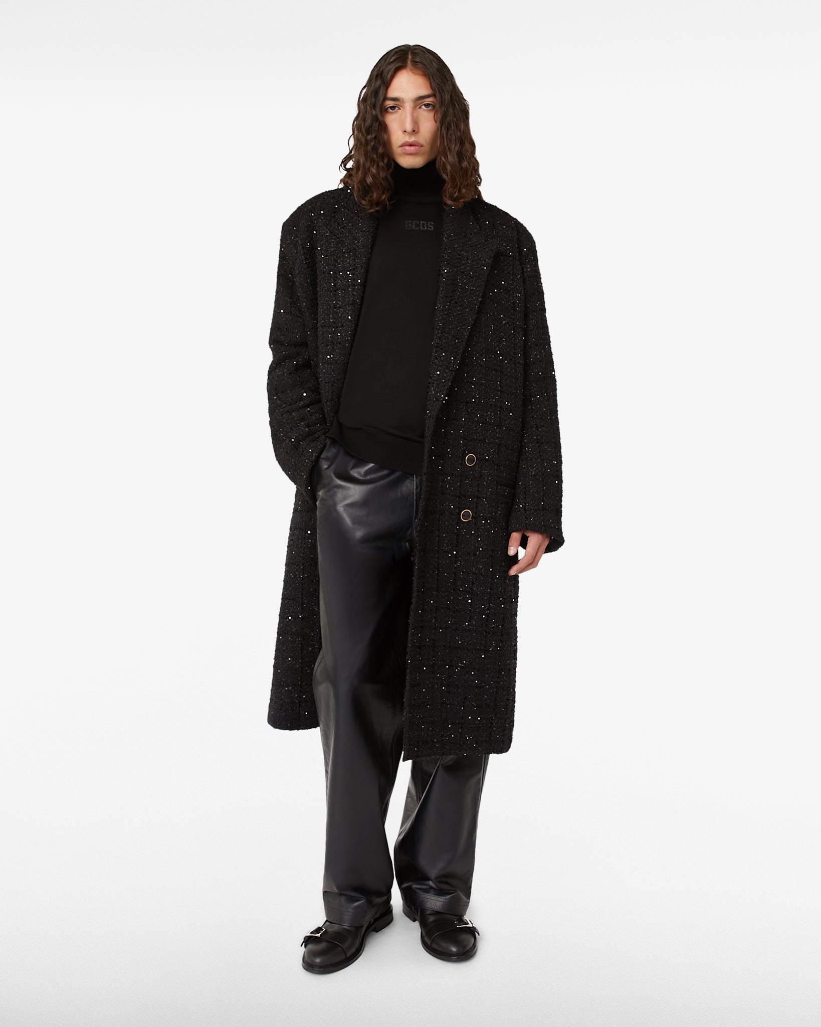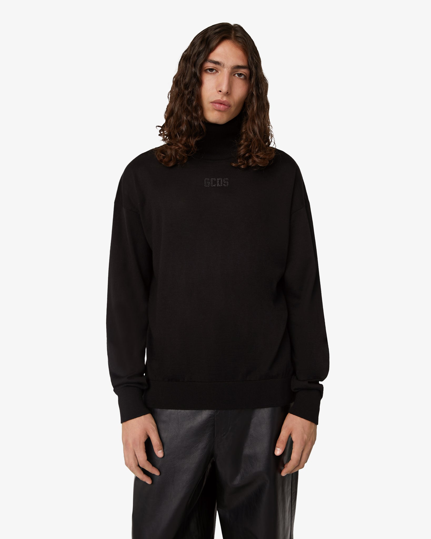 Wool-blend sweater with turtleneck and long sleeves. GCDS logo with tonal rhinestones applied on the front. Regular fit.