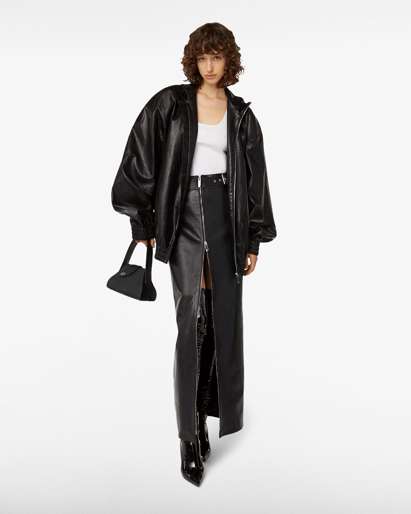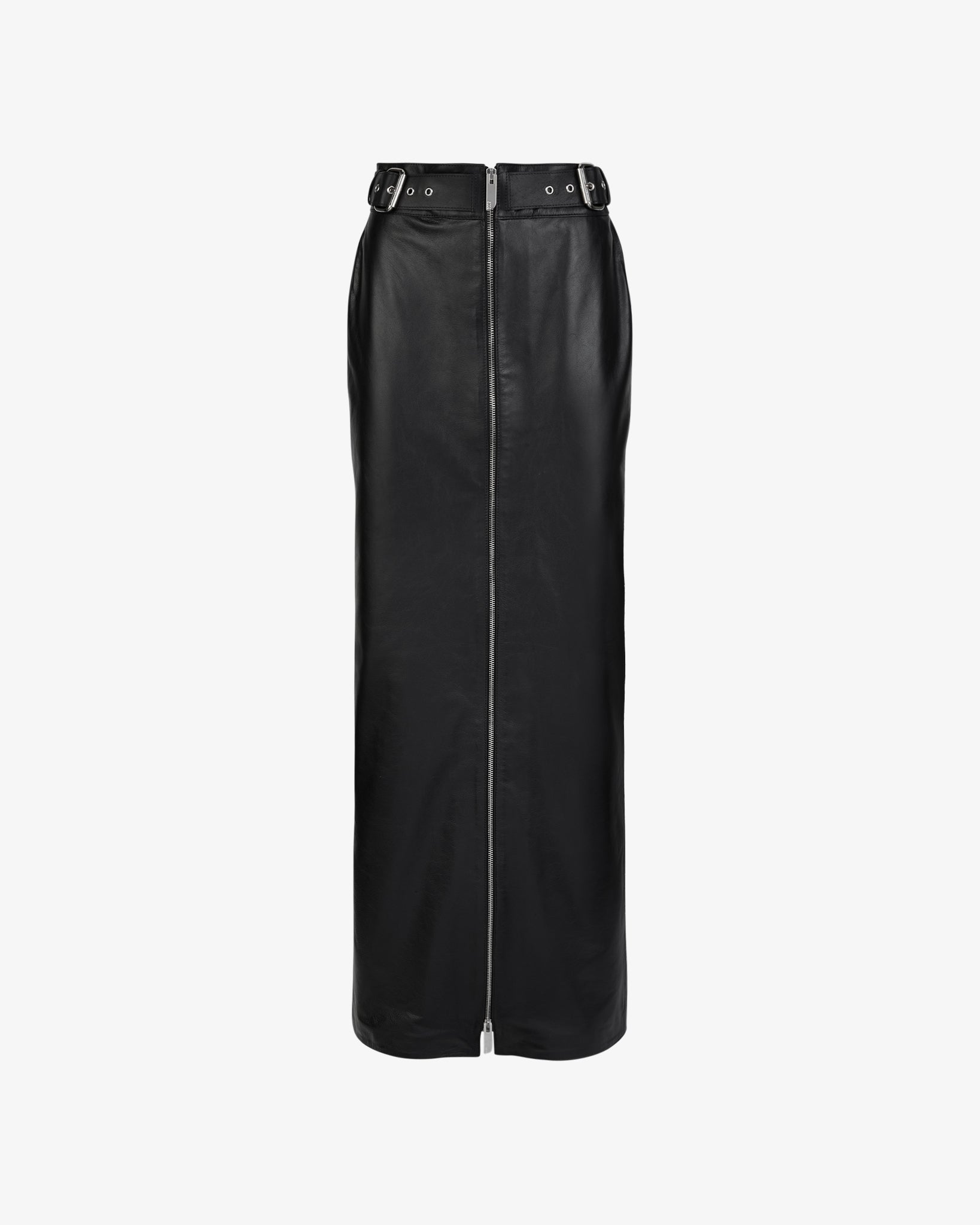 High waist midi skirt made of leather and featuring a full-length front zipper. Waistband with belt loops and double buckle allow the skirt to be adjusted.