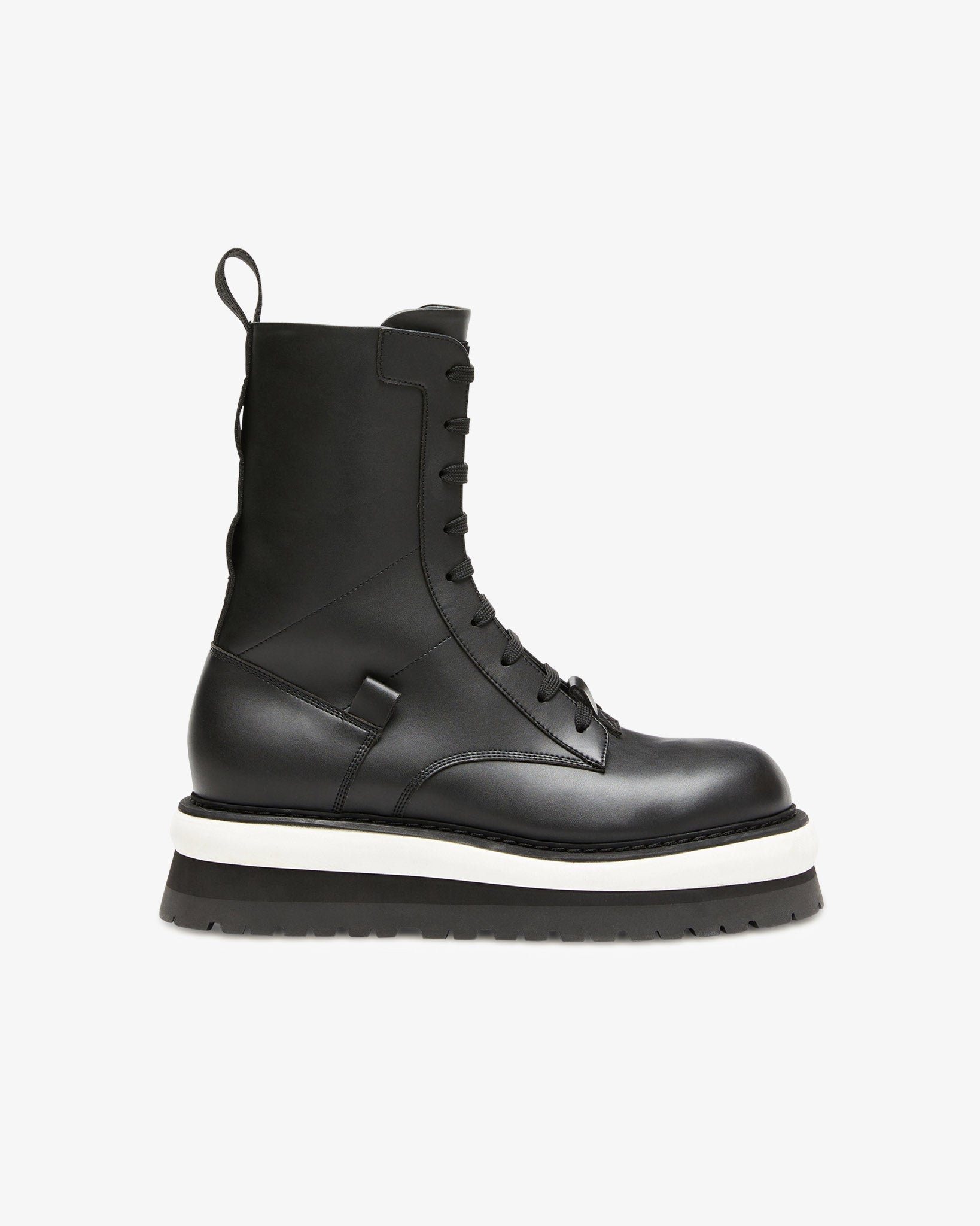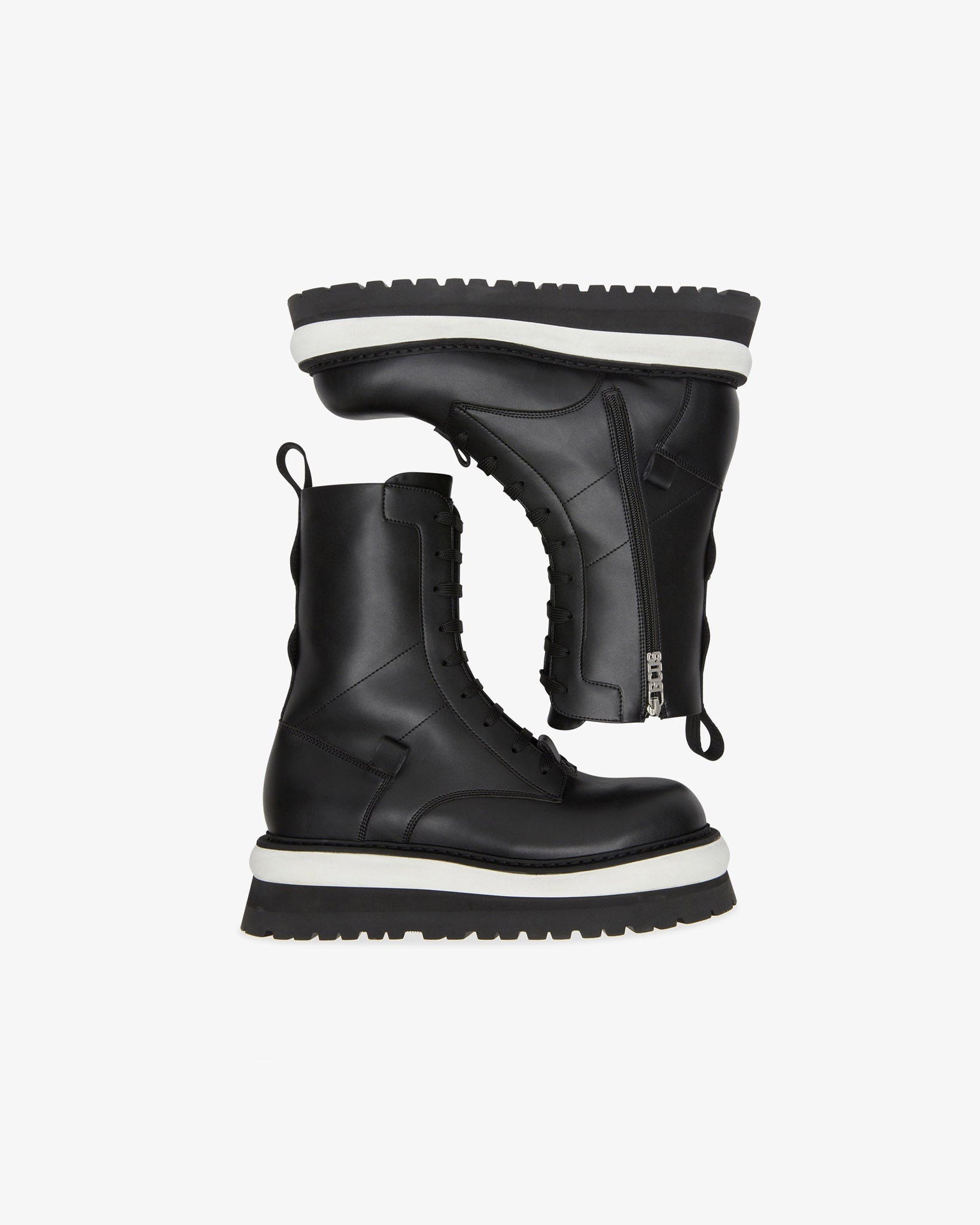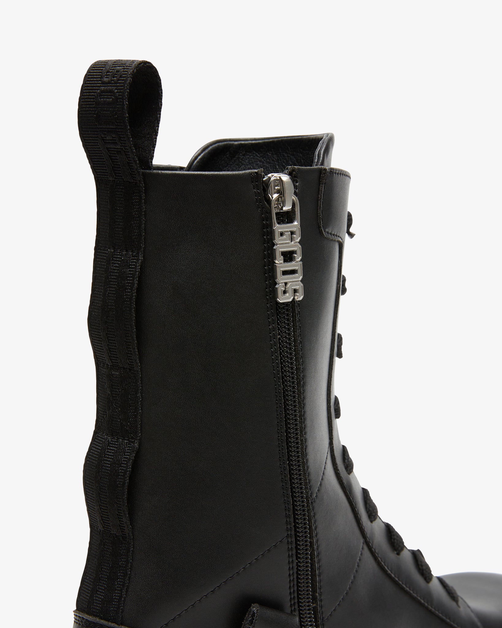 Combat boots with a round toe. The closure is with front laceds and an inside zipper with logoed zipper puller with matching stitching. Present loops on the upper where extra dettacfhed and stylable laces can be inserted.