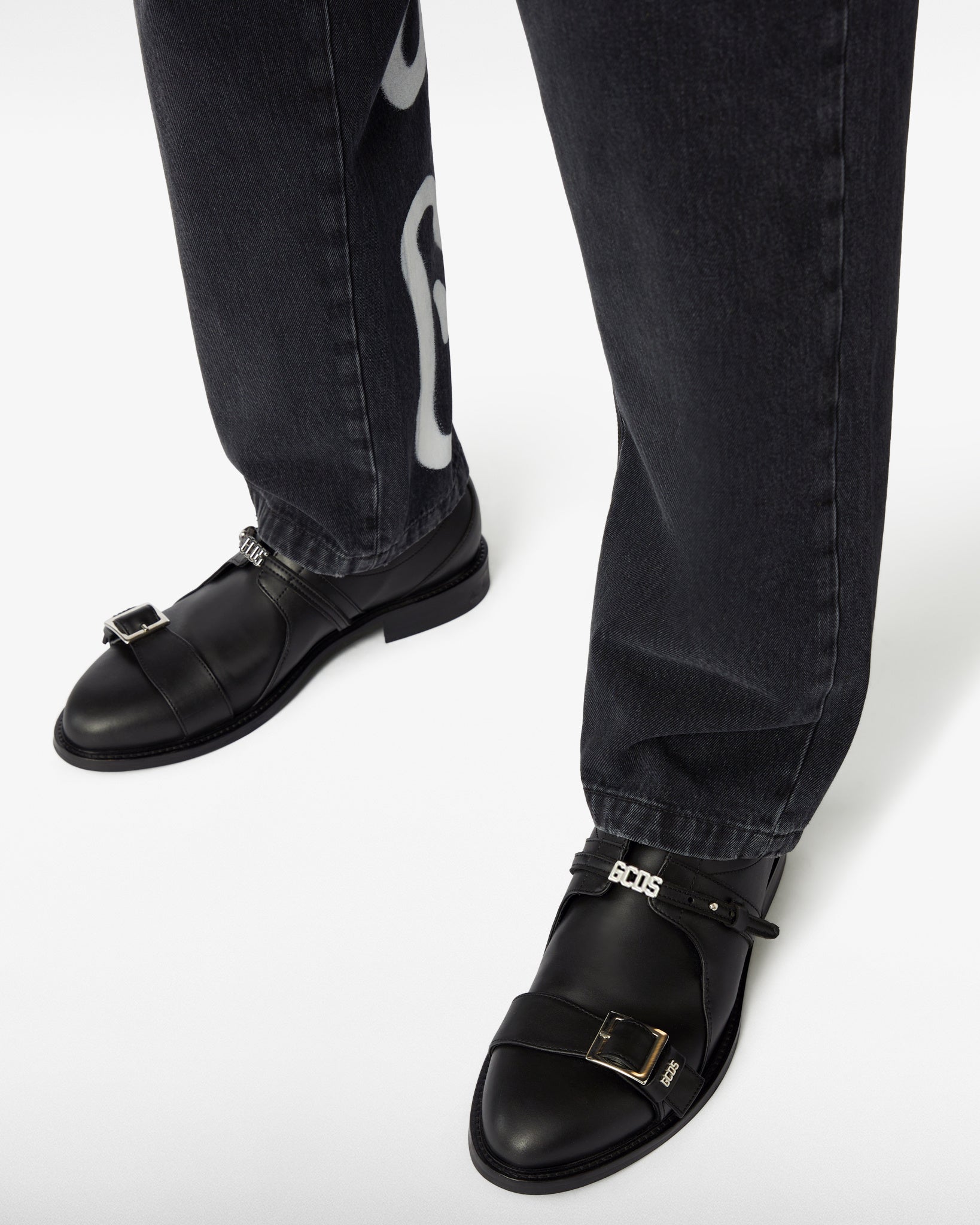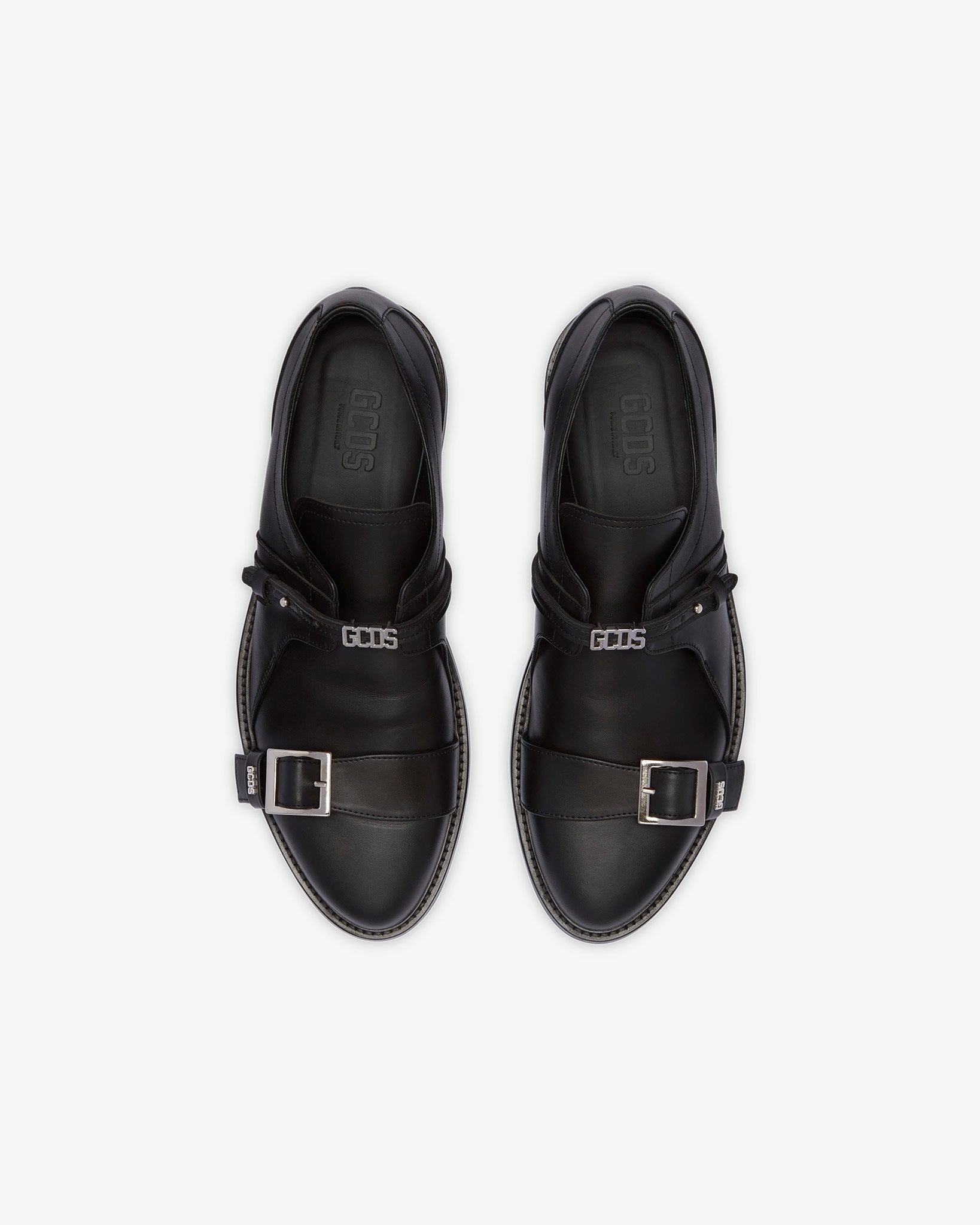 Derby shoe with a wide heel and round toe, features a square polished nickel buckle on the toe, and a adjustable logo buckle strap. The upper is made from black brushed leather with matching stitching. Black sole with smooth welt with anti-slip. Comes with withe shoelaces to complete the style.