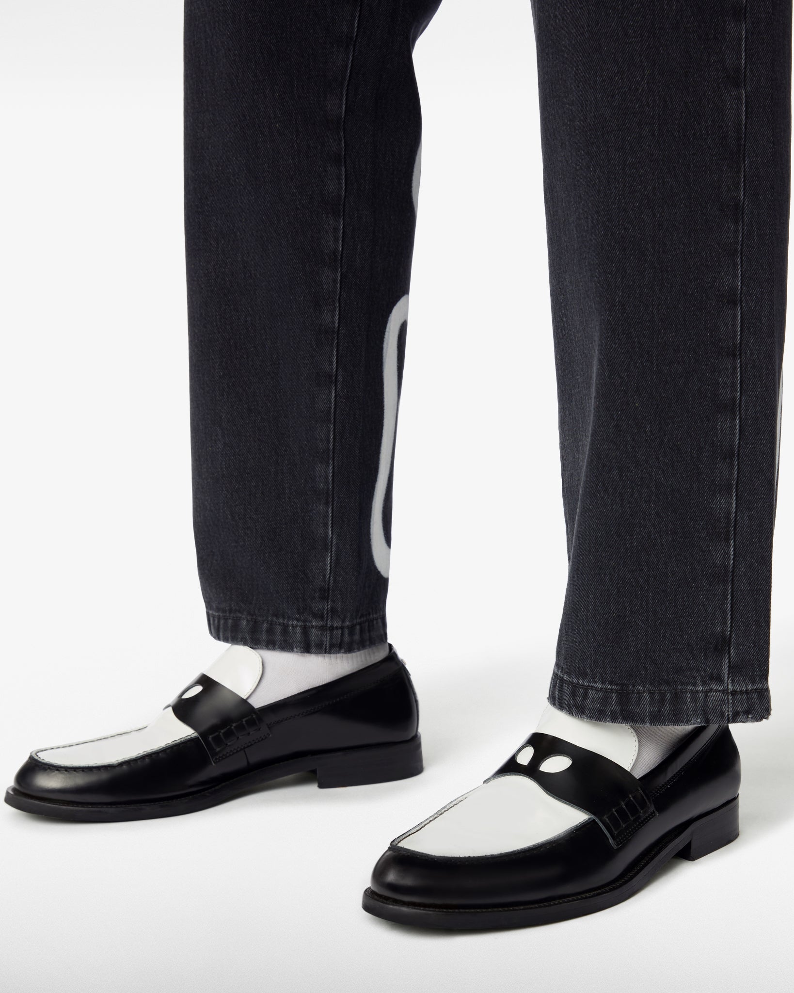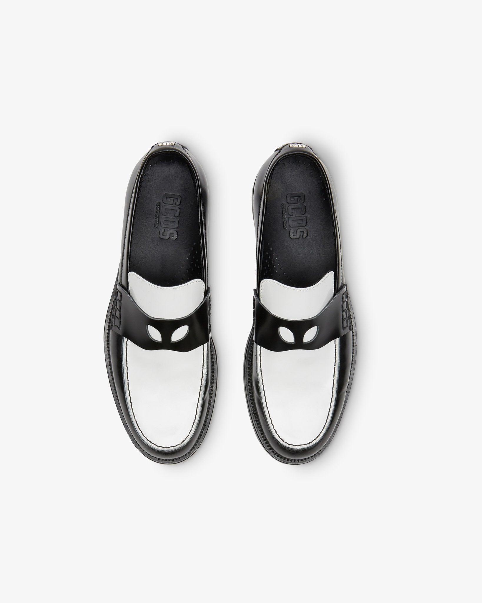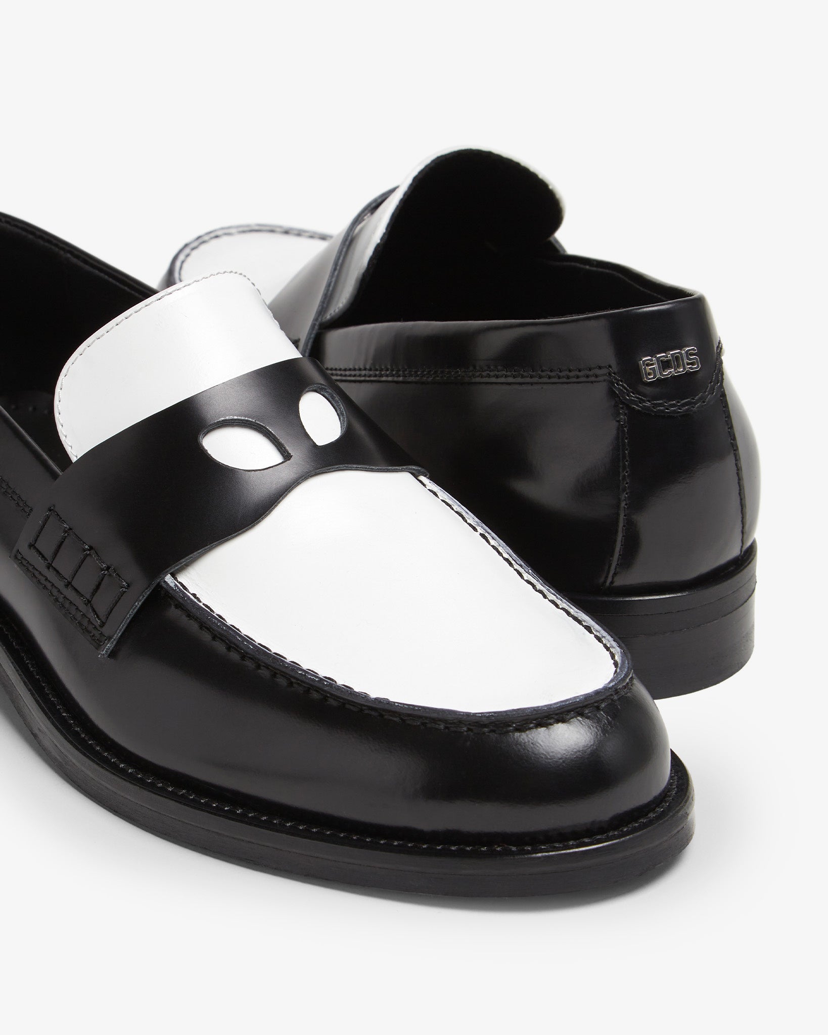 Classic cut loafer characterized by the two small Wirdo fissures on the top. Contrasting bicolor upper made from black and white leather and matching stitches. Black sole with smooth welt with anti-slip. A polished nickel GCDS logo plaque adds a touch to the back. The leather insole has a hot-pressed GCDS logo stamped. Rounded toe.