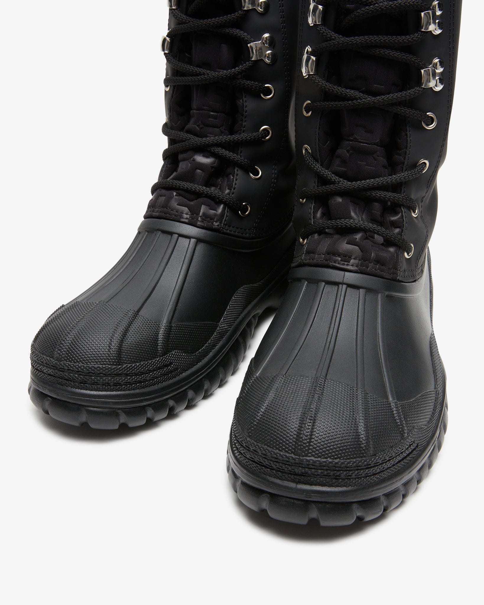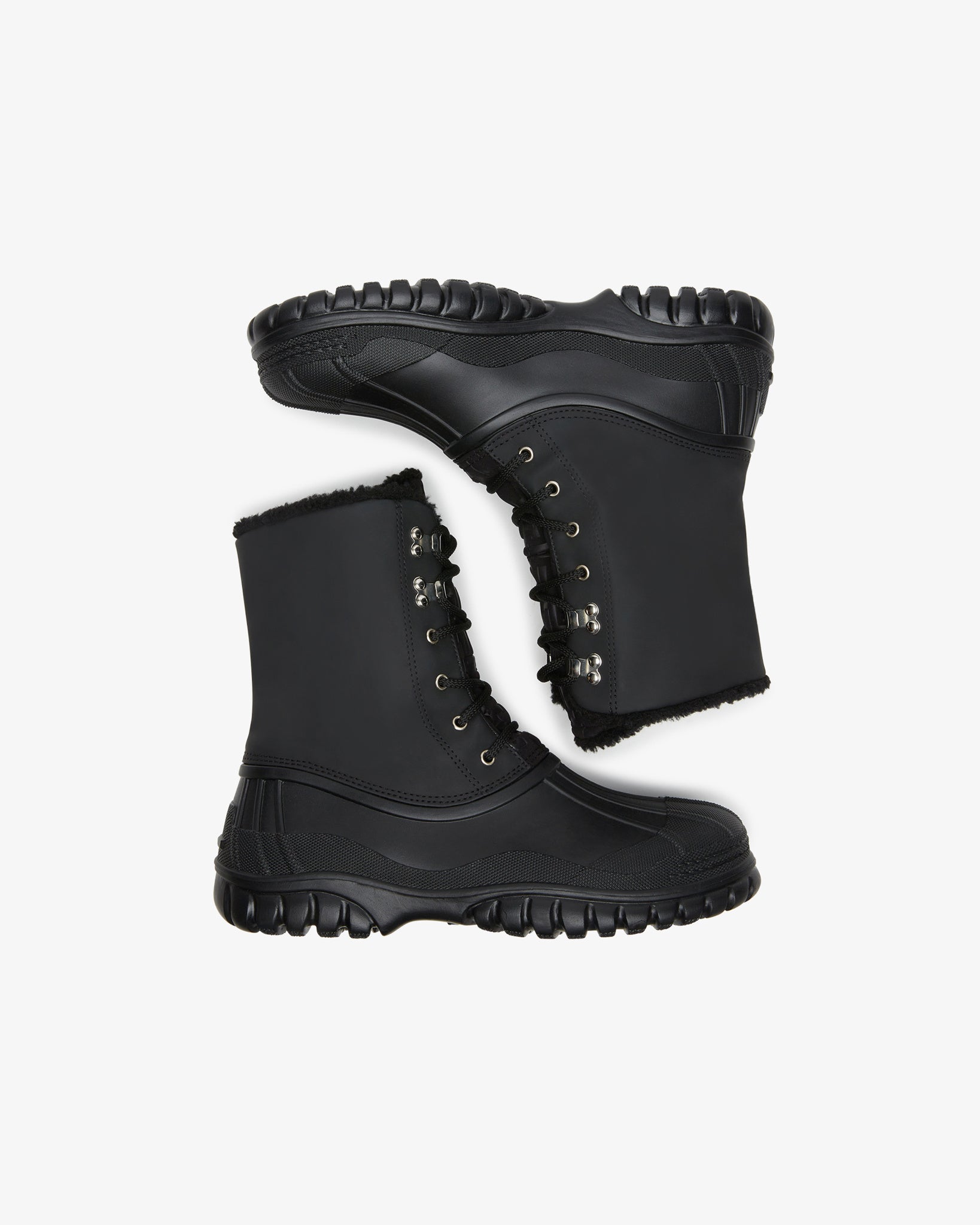Skip to contentDuck boot in black rubber sole and toe cap. Upper made from black rubberized material. Tongue made form neoprene embossed logoed, and characterized by a bicolor lacing. Internal lining in black faux shearling.