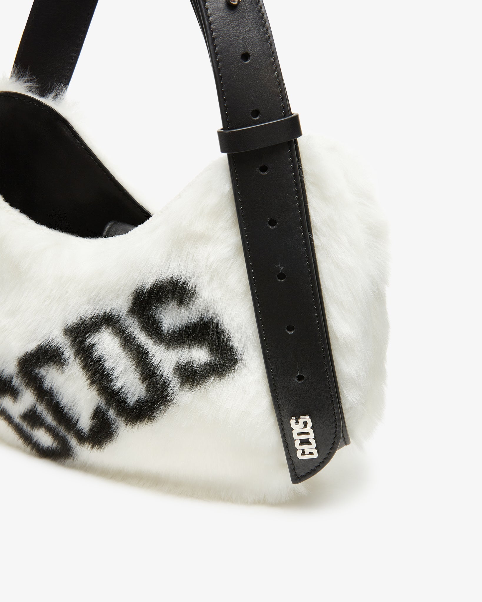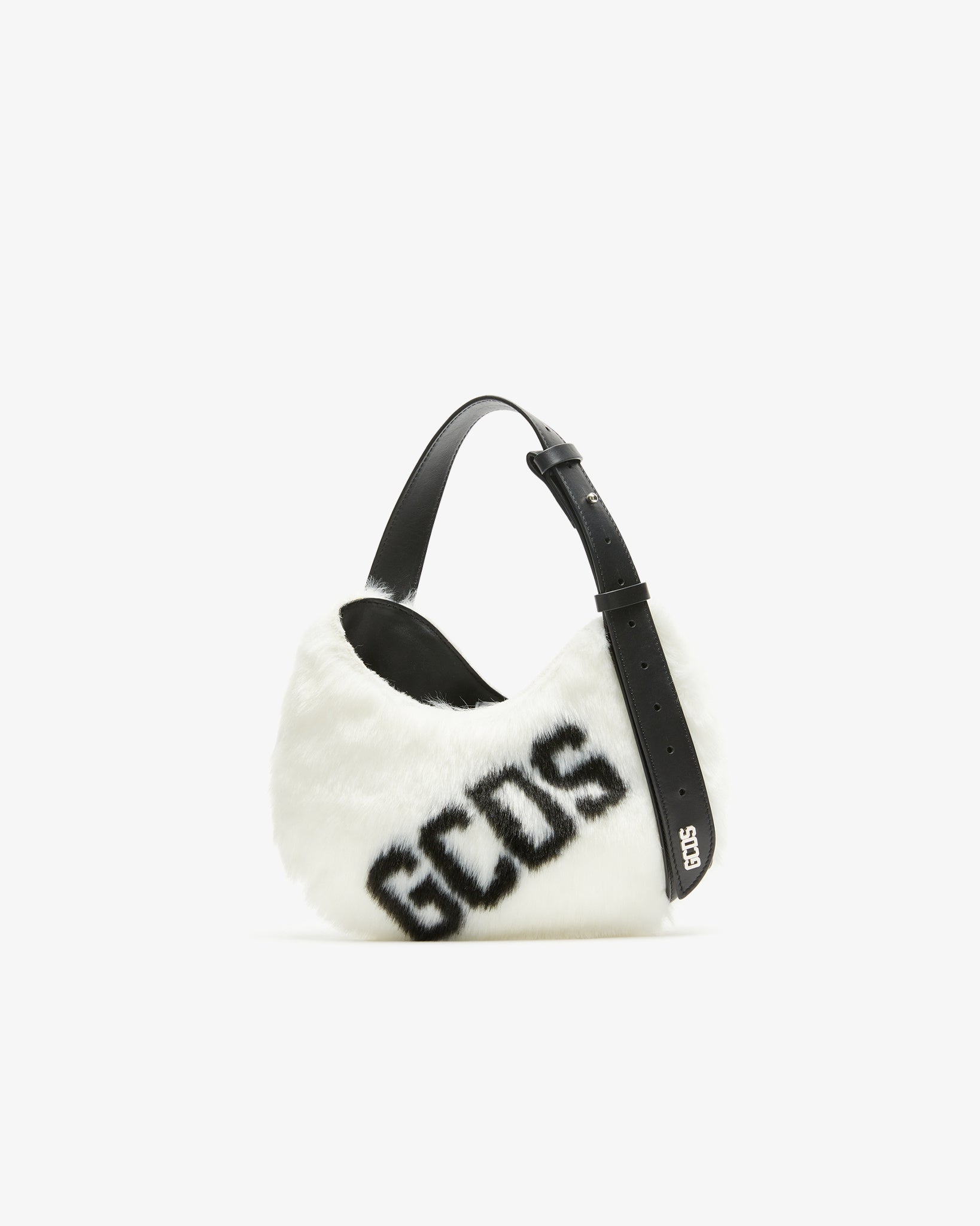 Small hobo bag with a single compartment. Characterized by its mirrored curved shape and the adjustable asymmetrical handle. Features a magnetic closure and a polished nickel GCDS logo plaque at the end of the leather handle. Made from two-tone logoed faux fur with a contrasting handle. Inside, jacquard logo lining in black, pocket with metallic zipper and logoed zipper puller, key ring and cardholder pocket with heat-embossed logo on the inside.