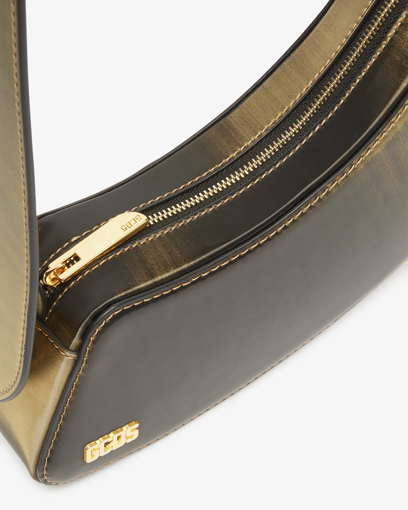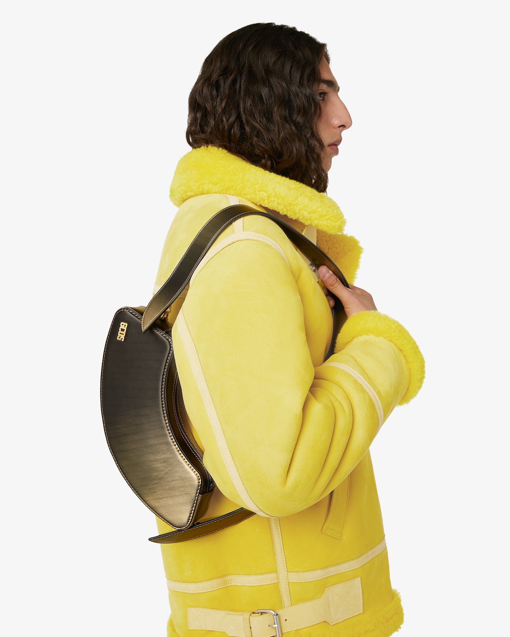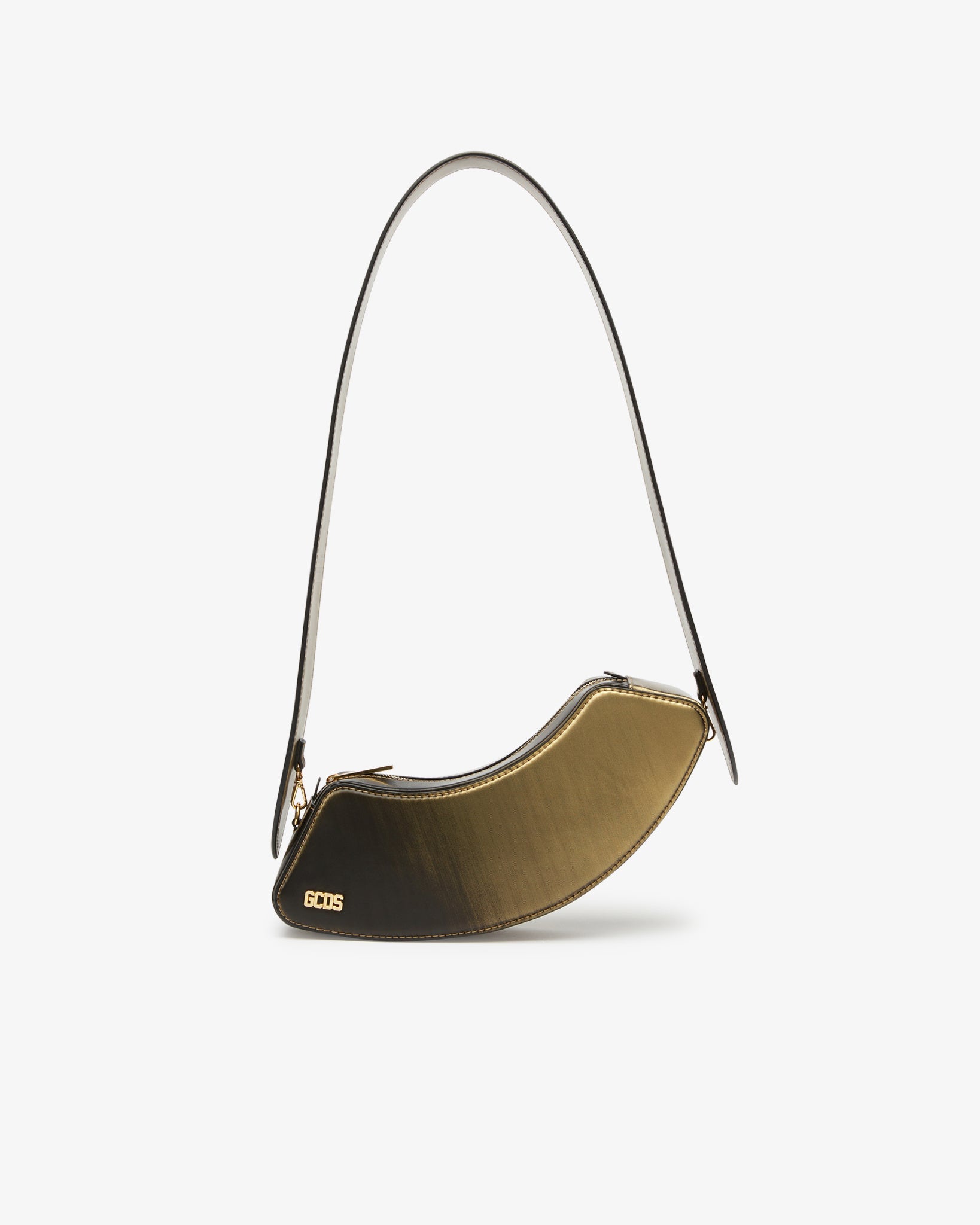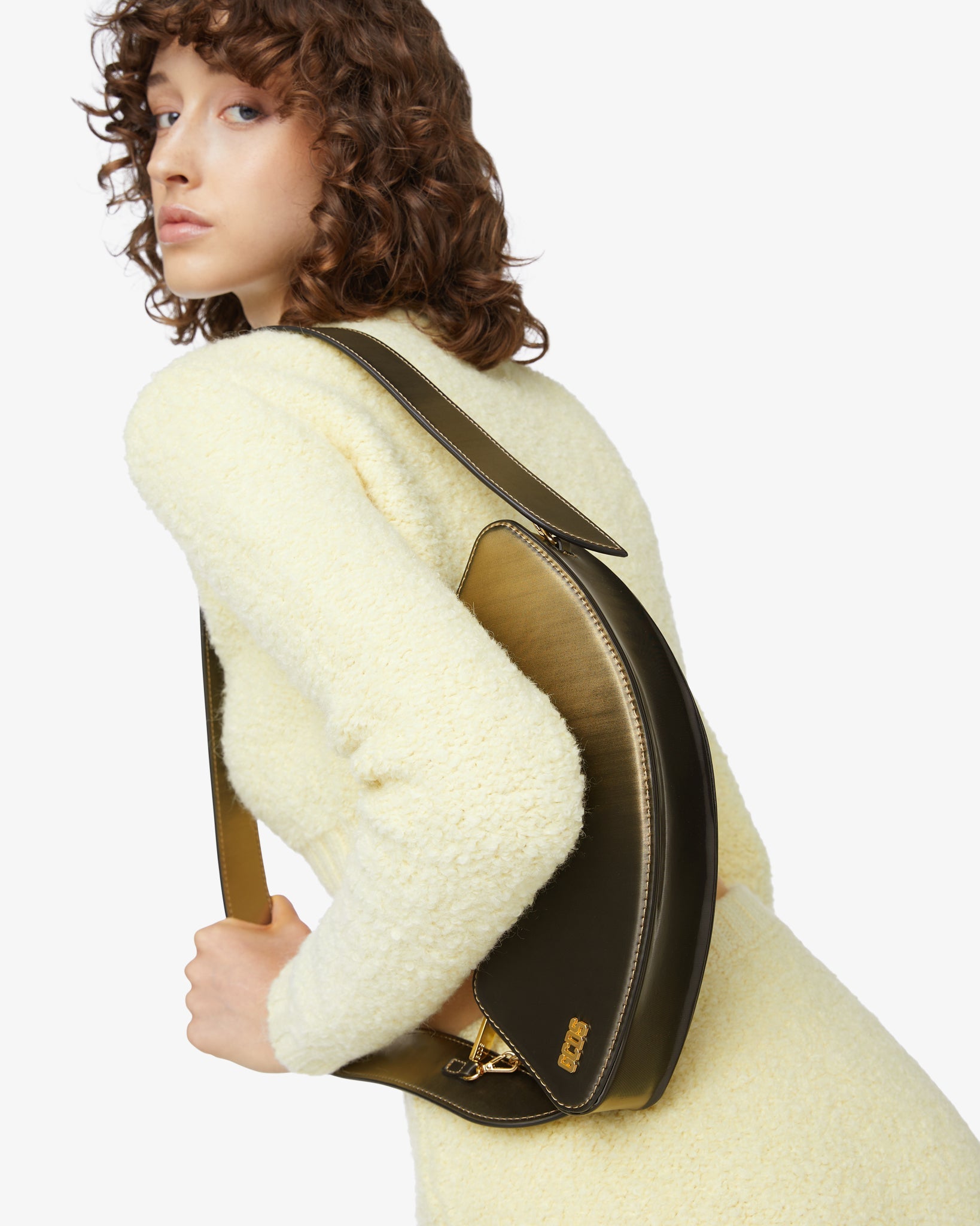 Holographic synthetic medium curve-shaped structured cross body Comma bag. The adjustable strap features 4 semi-hidden snap hooks. Golden logo plaque on the front. Jacquard logo lining in black and leather trim on the inside. Internal cardholder pocket with heat-embossed logo.