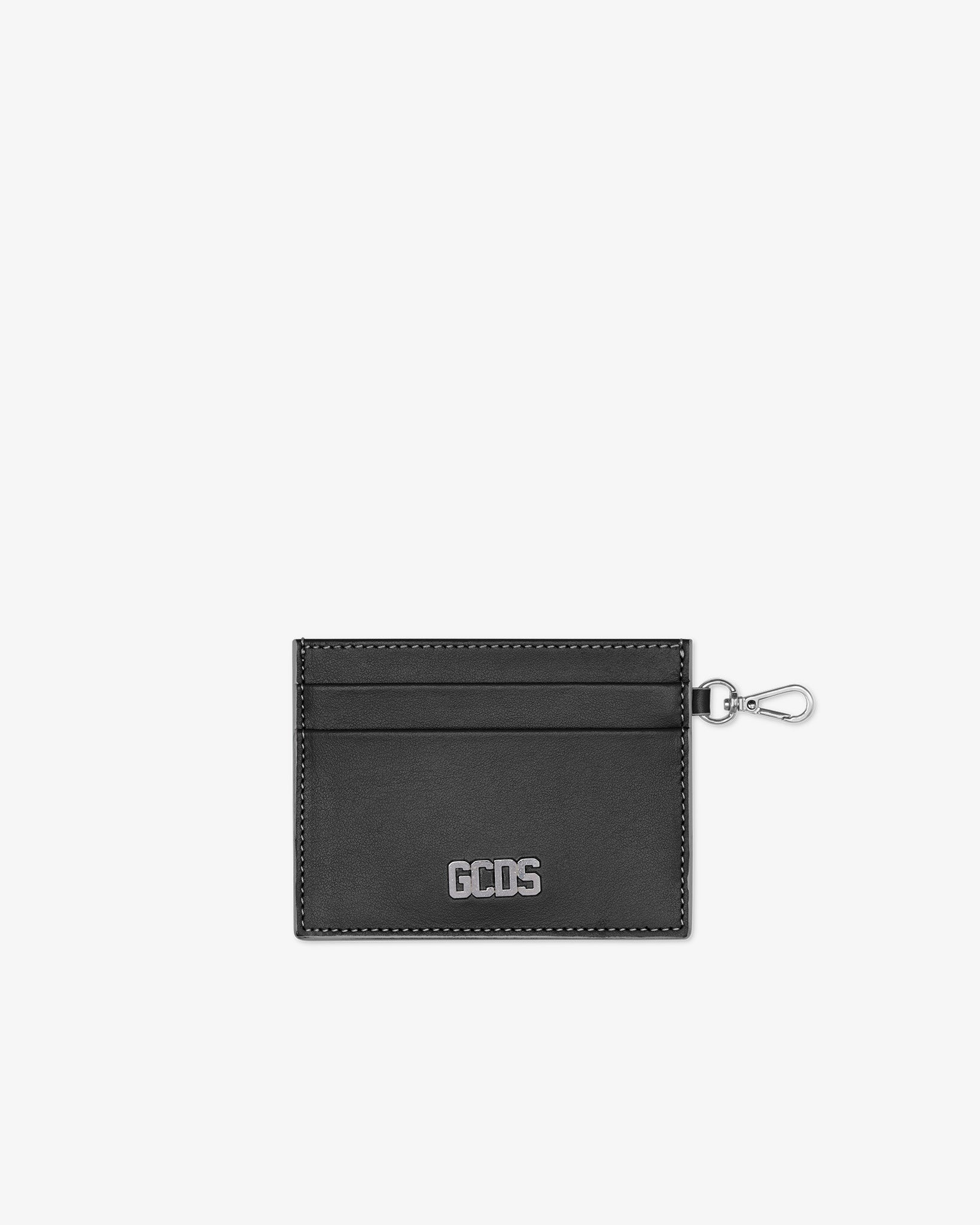 Leather pocket-size cardholder with contrasting stitching and characterized by the GCDS logo plaque in polished nickel. Featuring three card slots and a keychain hoop.