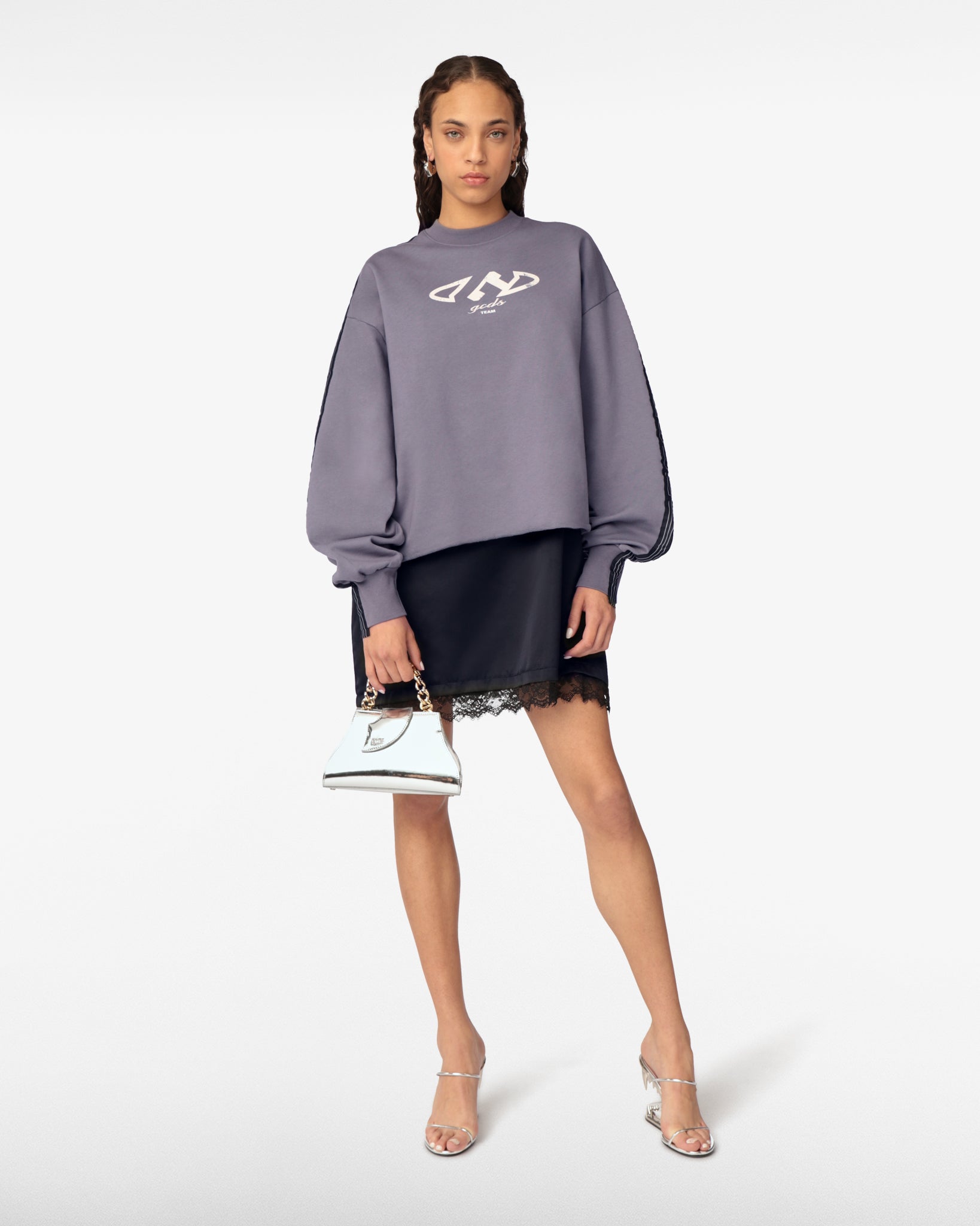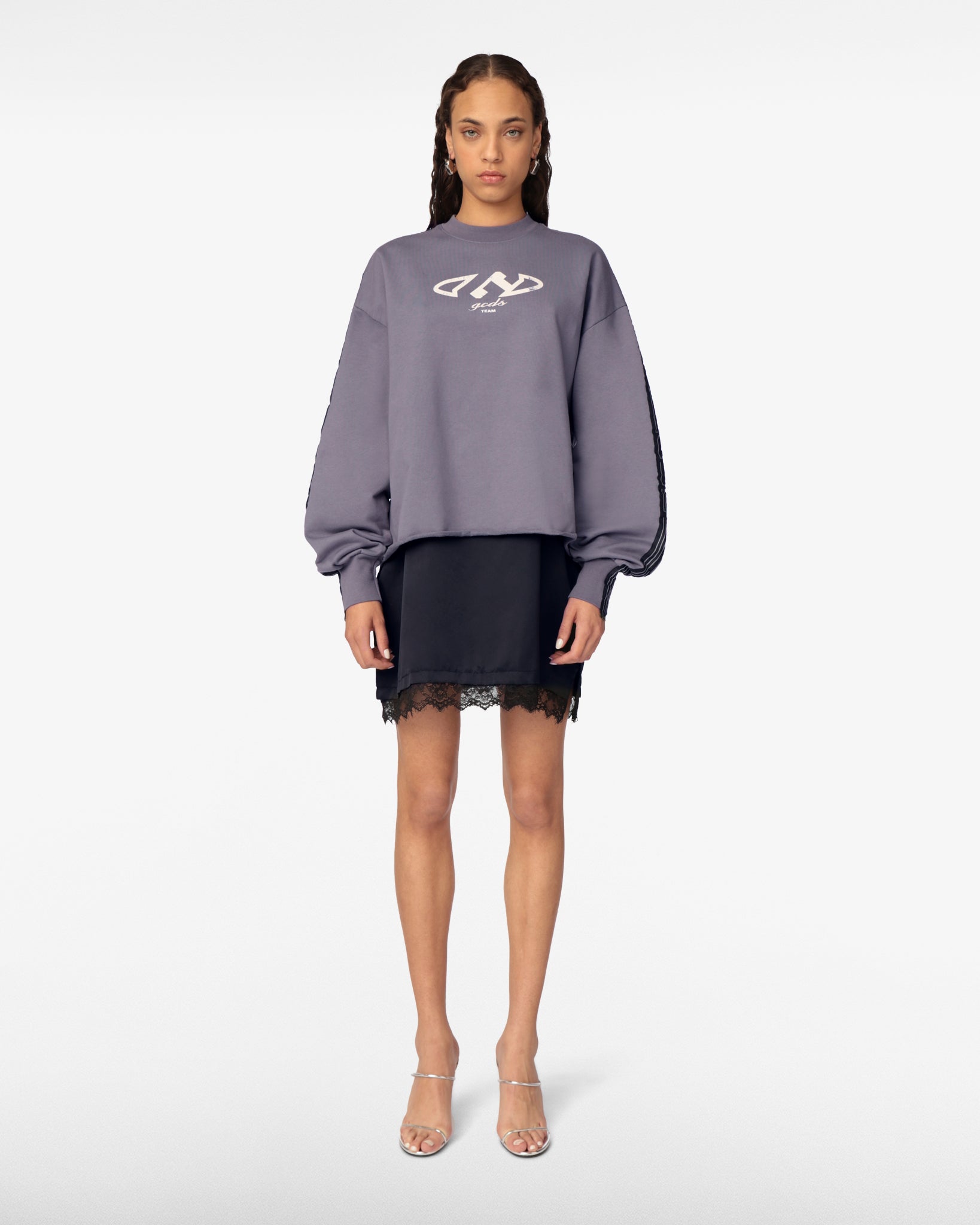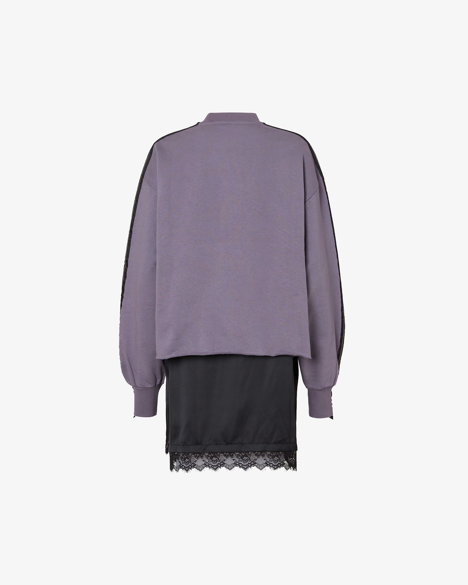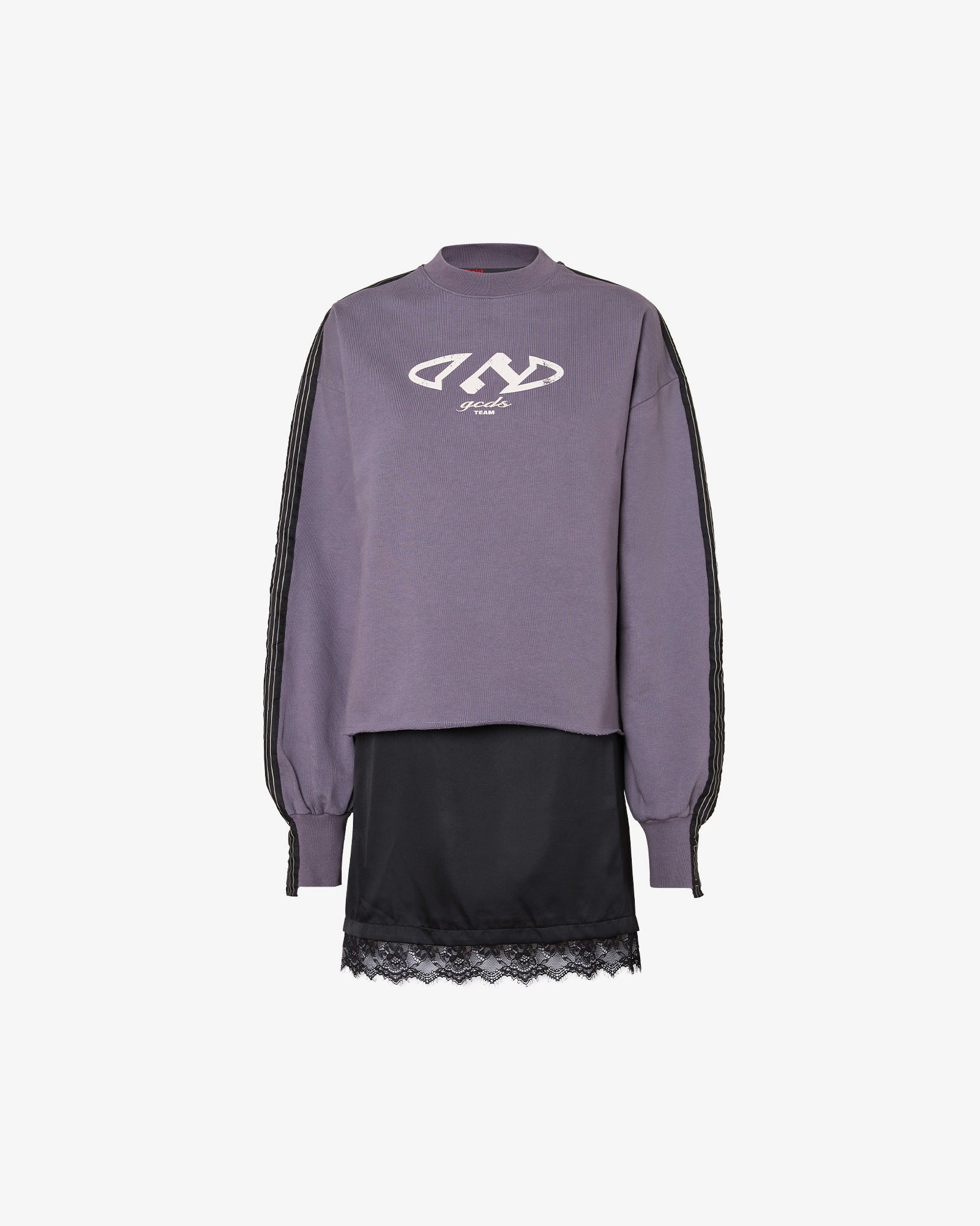 Oversized dress made with a double-layered jersey fabric and a black satin miniskirt with lace trim. The dress features a vintage-effect "G" print on the front and logoed ribbon details on the shoulders and sleeves.