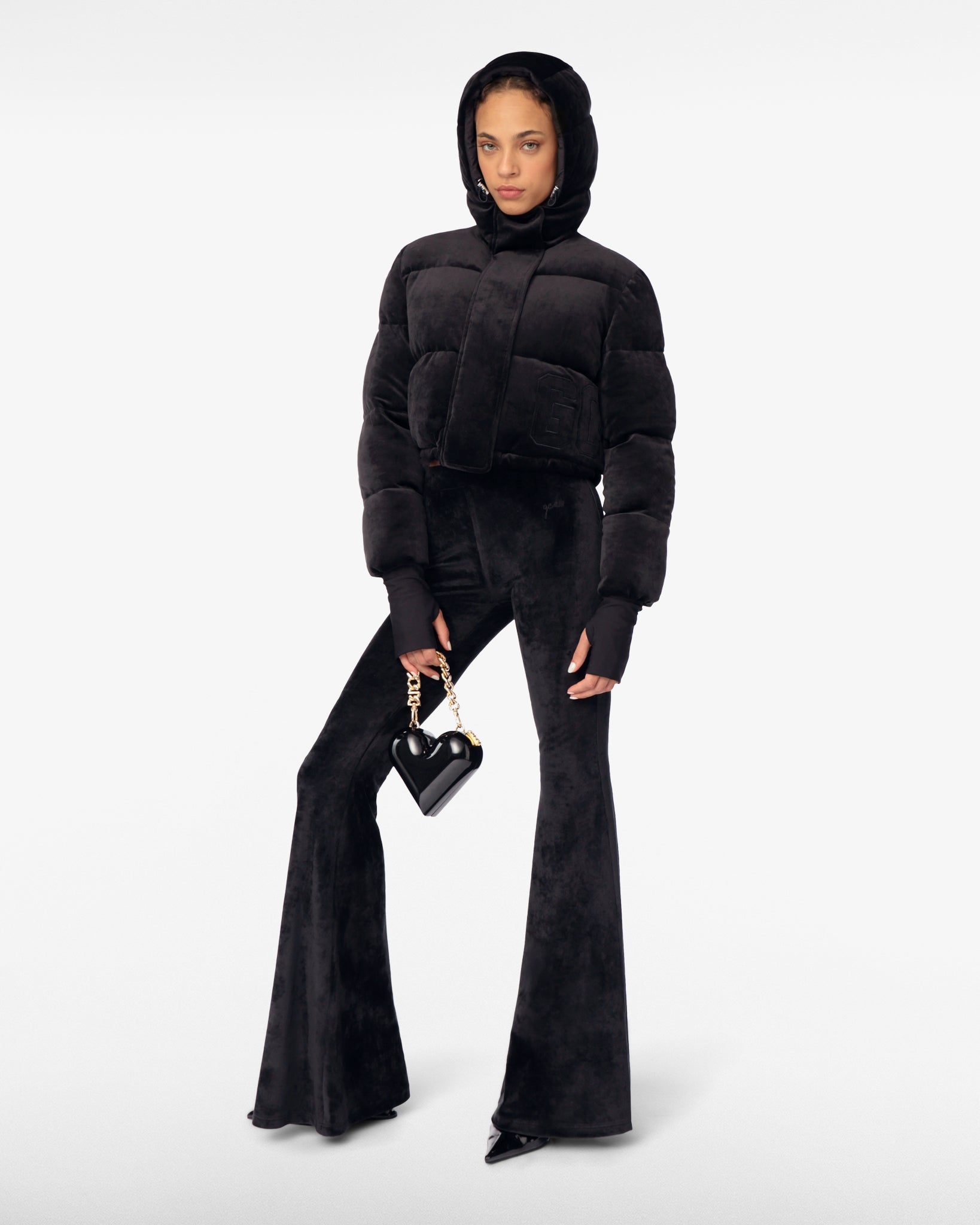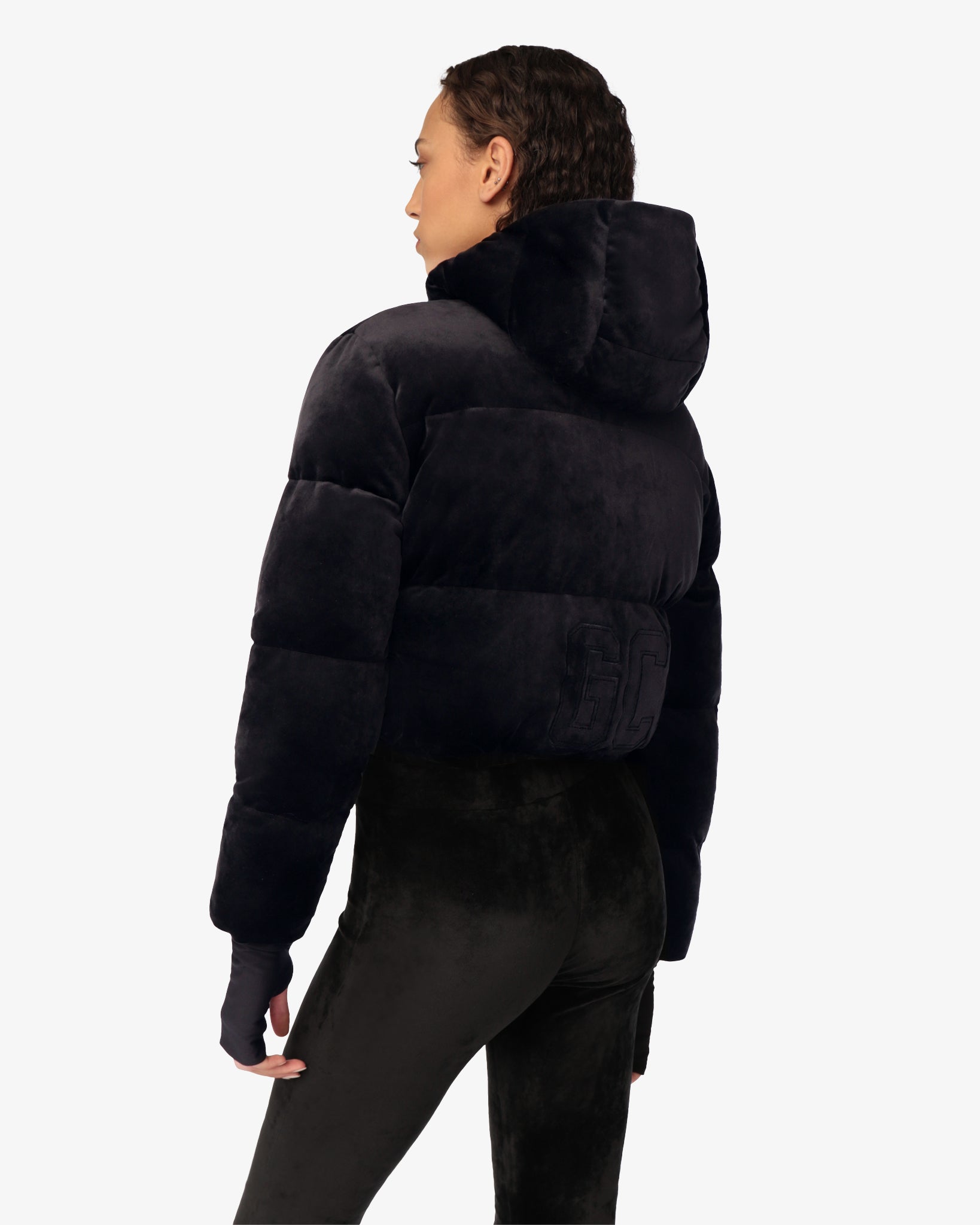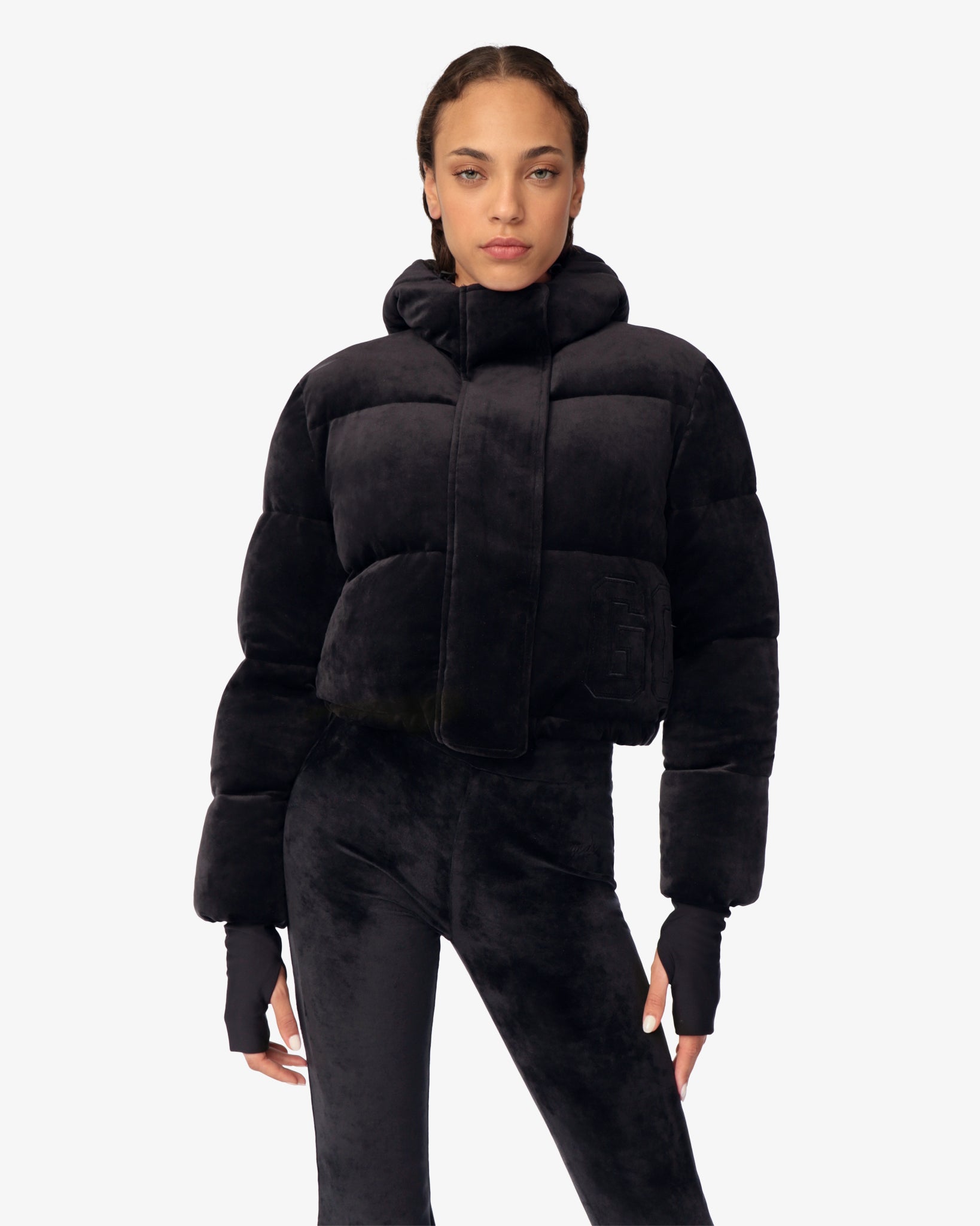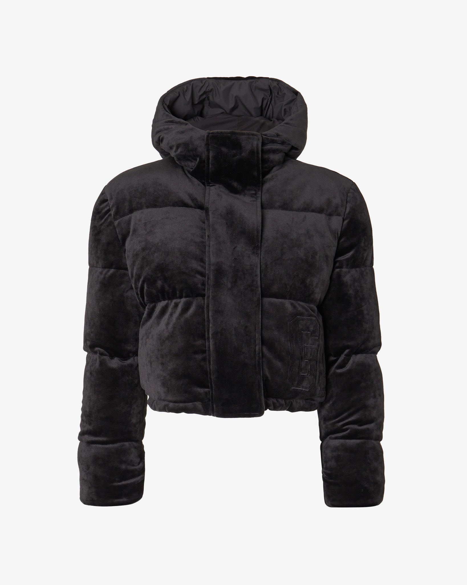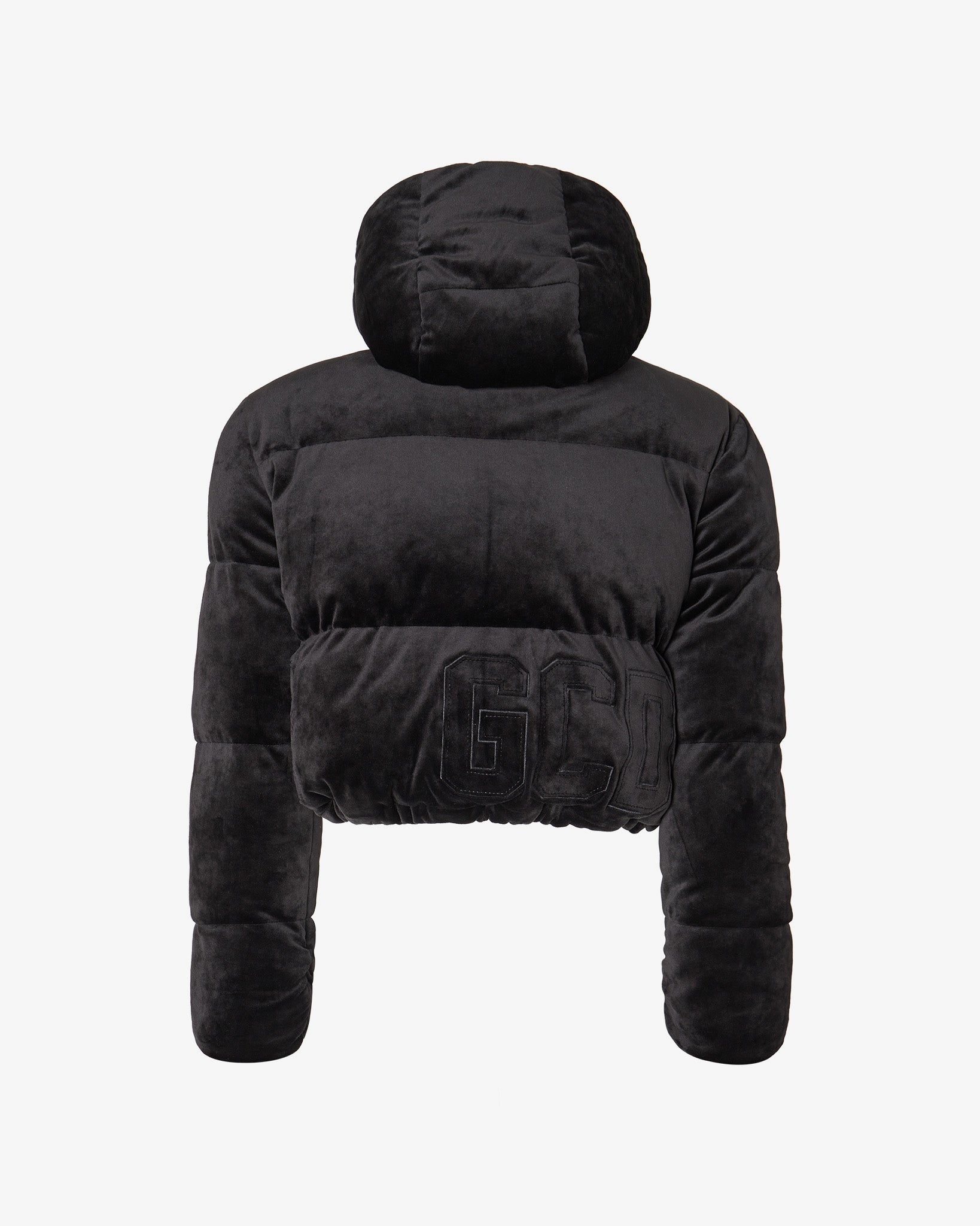Soft velvet padded jacket with high collar and hood in cropped silhouette. Long sleeves with lycra gauntlet. Adjustable drawstring hem. Front zipper and snap button closure. GCDS embroidery completes the garment.