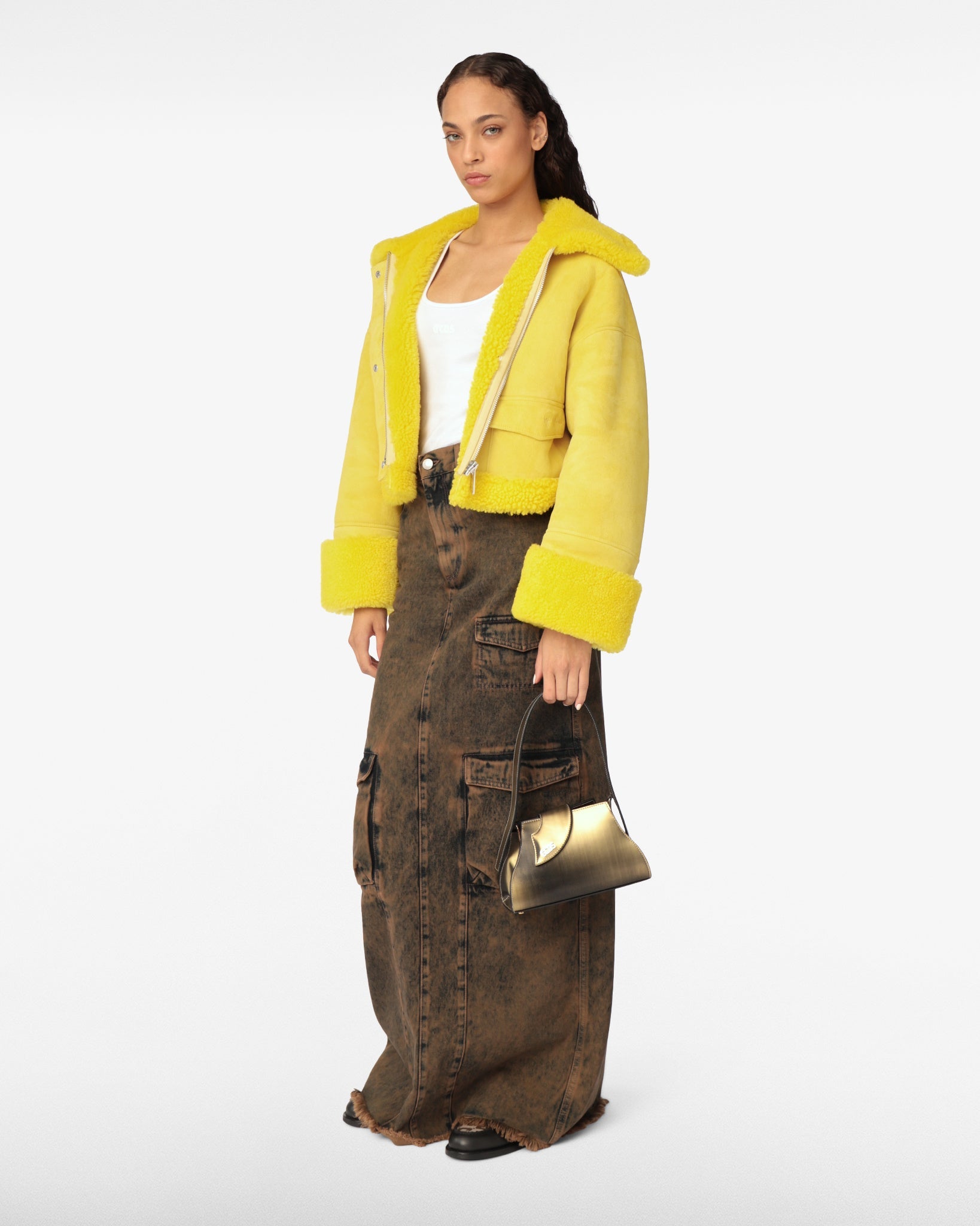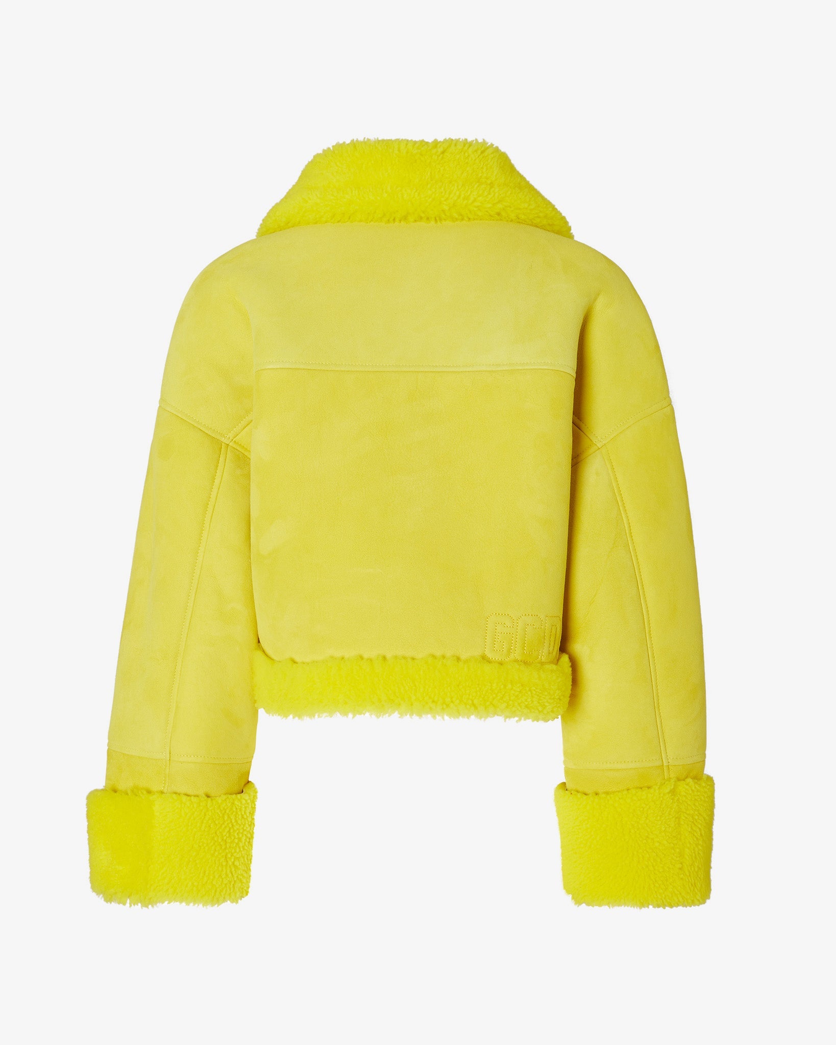 Shearling jacket with high collar and long sleeves. Front patch pockets and concealed zipper closure. The garment offers a timeless look with faux fur details around the collar, cuffs and bottom. GCDS logo embroidered on the bottom in the back completes the garment. Cropped fit.