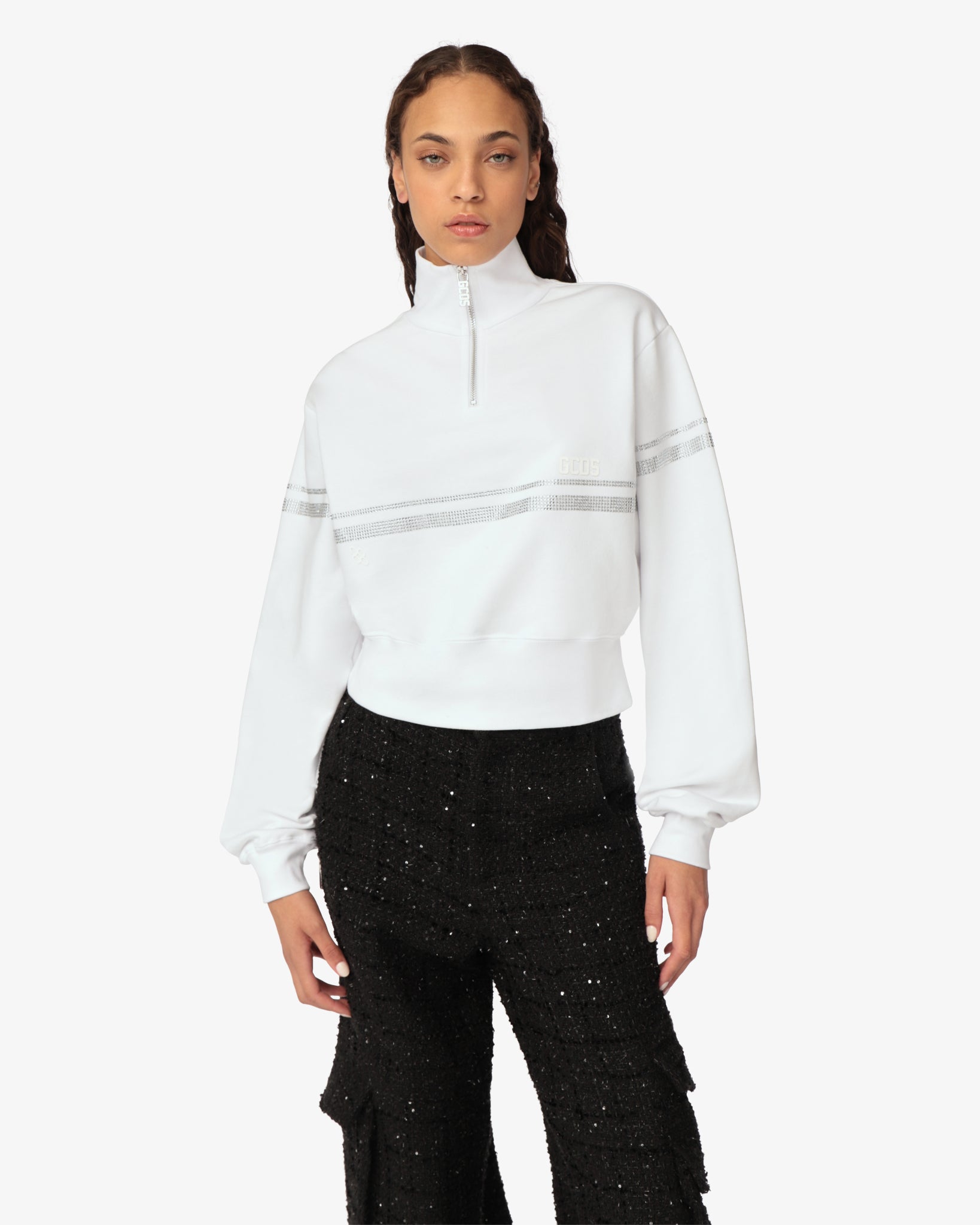 Cotton jersey hoodie with high neck and crop cut. “GCDS Stripes” artwork and heat-applied rhinestones on the front, back and sleeves. Thick GCDS and “GCDS Bliss” transfer logo print on the front.