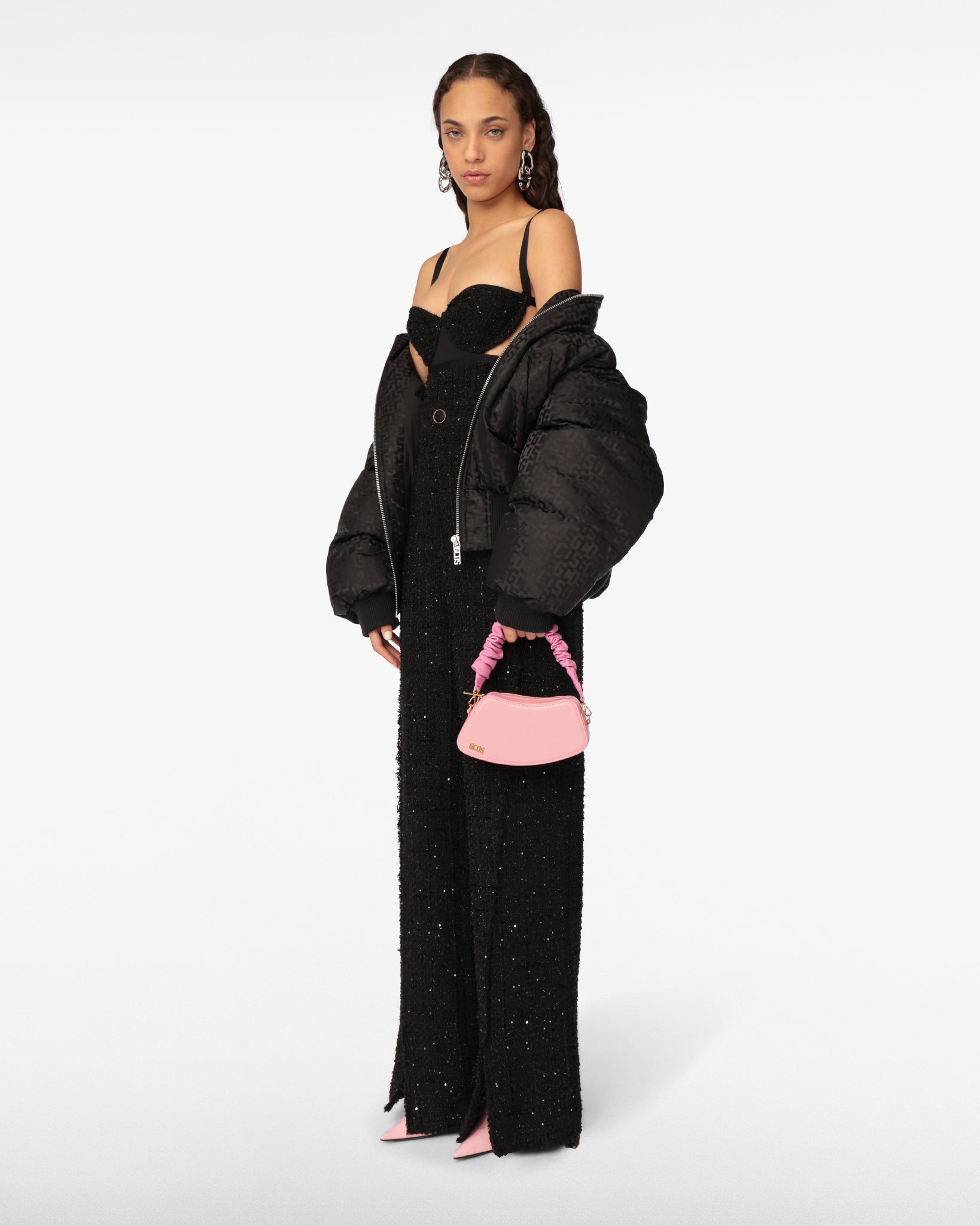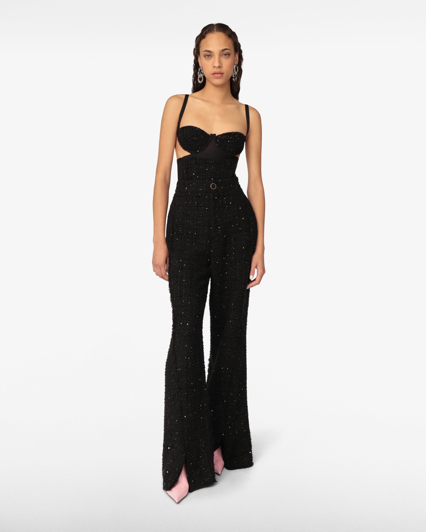Trousers made from cotton-blend tweed, embellished with bright sequins, and a tone-on-tone nacre logoed button. Curved details and a front slit at the bottom complete the garment. Fit tailoring.