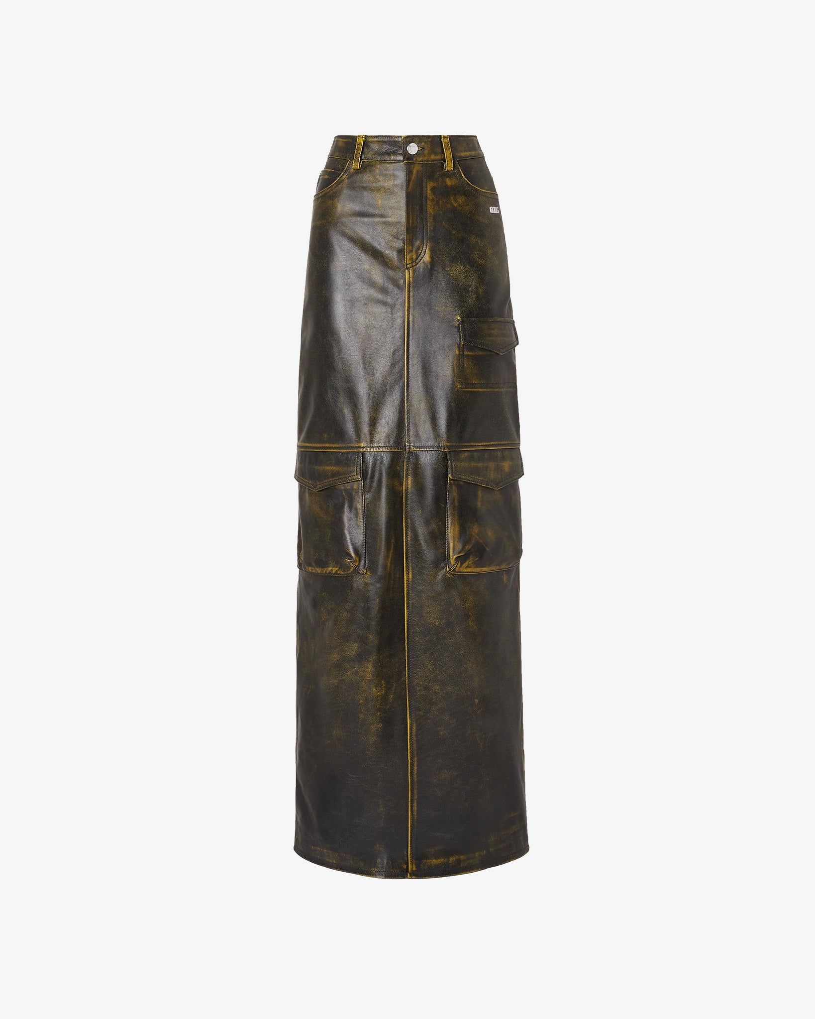 High waisted skirt in leather treated for a lived-in look effect. Features two cargo pockets and a wide back slit. Front zipper and metal button closure.