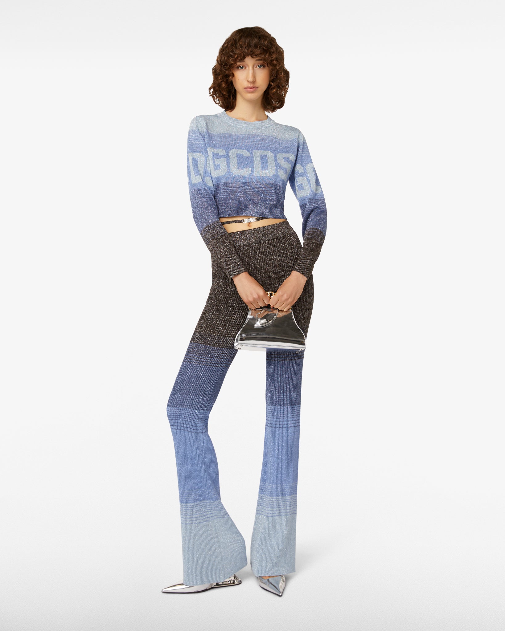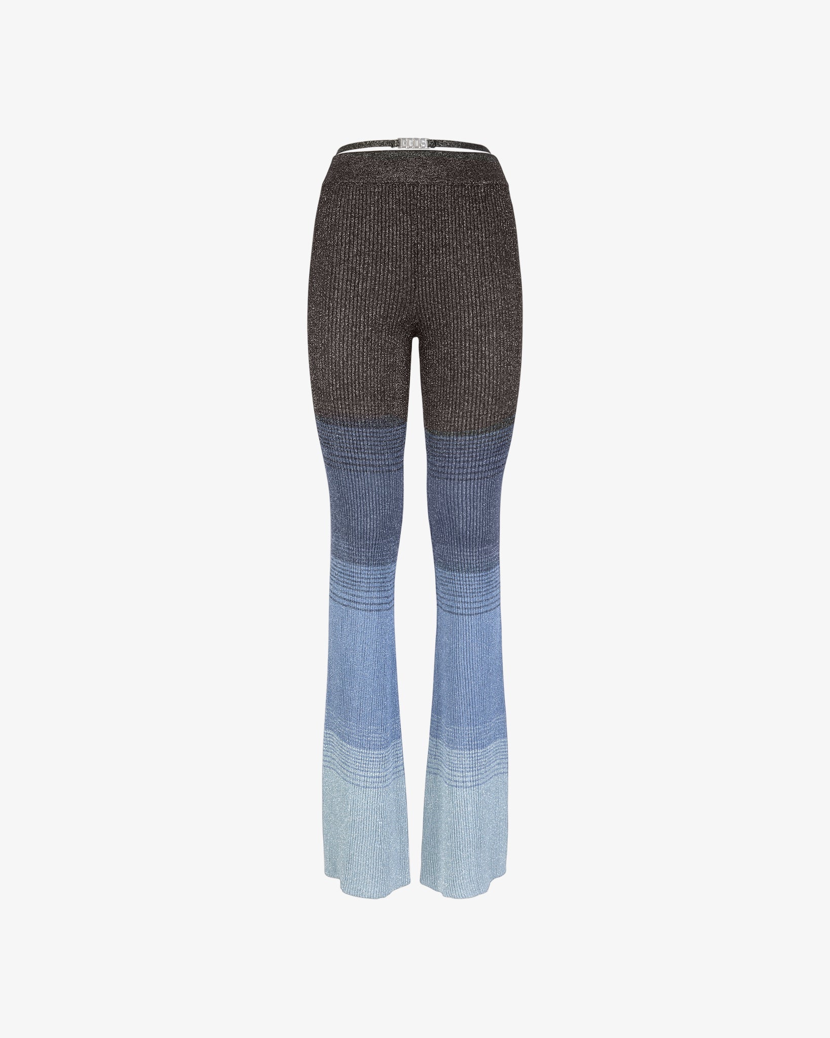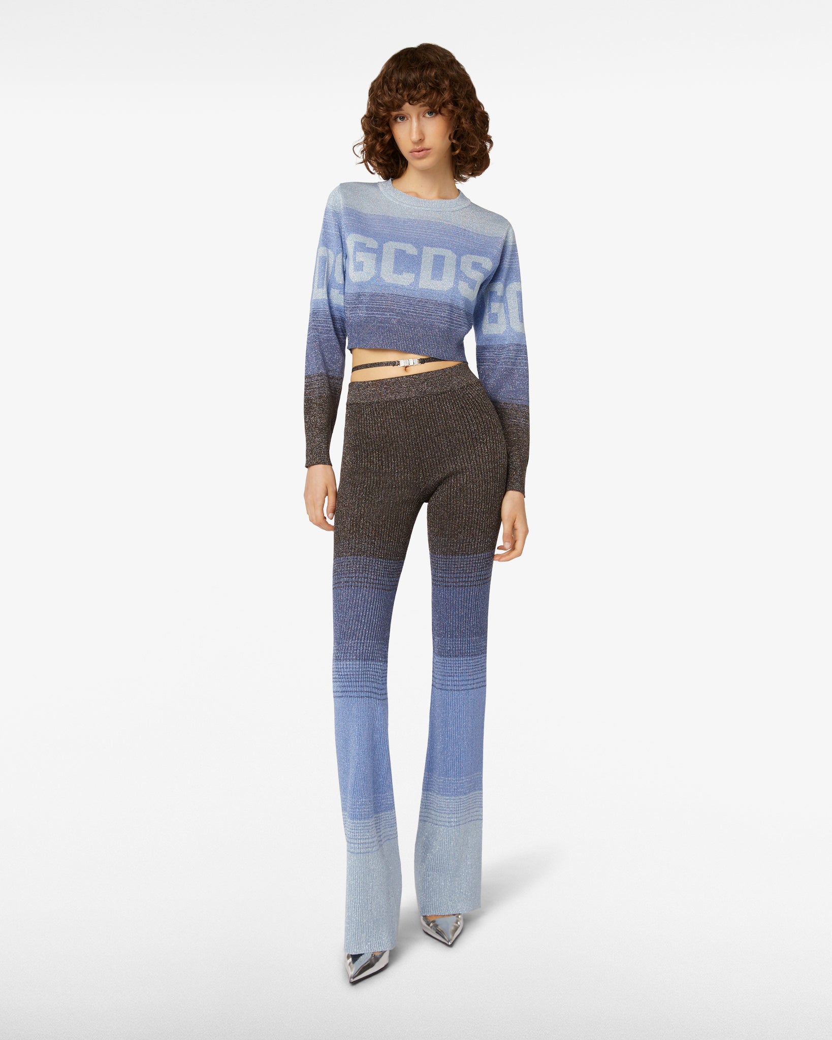 High waisted trousers in four-tone lurex with a faded effect, made with rib knitting. Knitted string from the waist with logo clip on the center front. Flared leg cut.