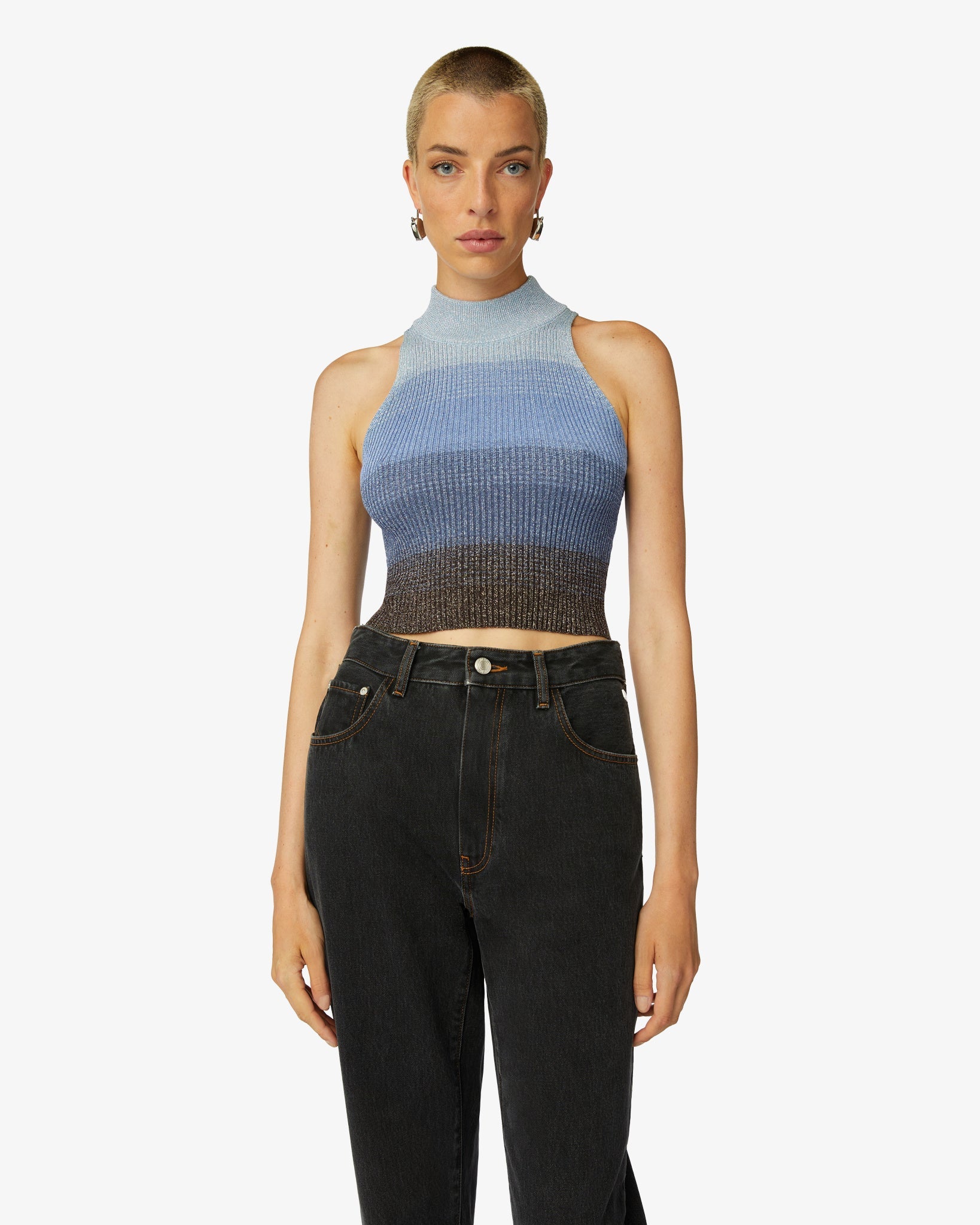 Skip to contentSleeveless halter style high neck top in four-tone lurex with degradé effect, made with rib knitting.