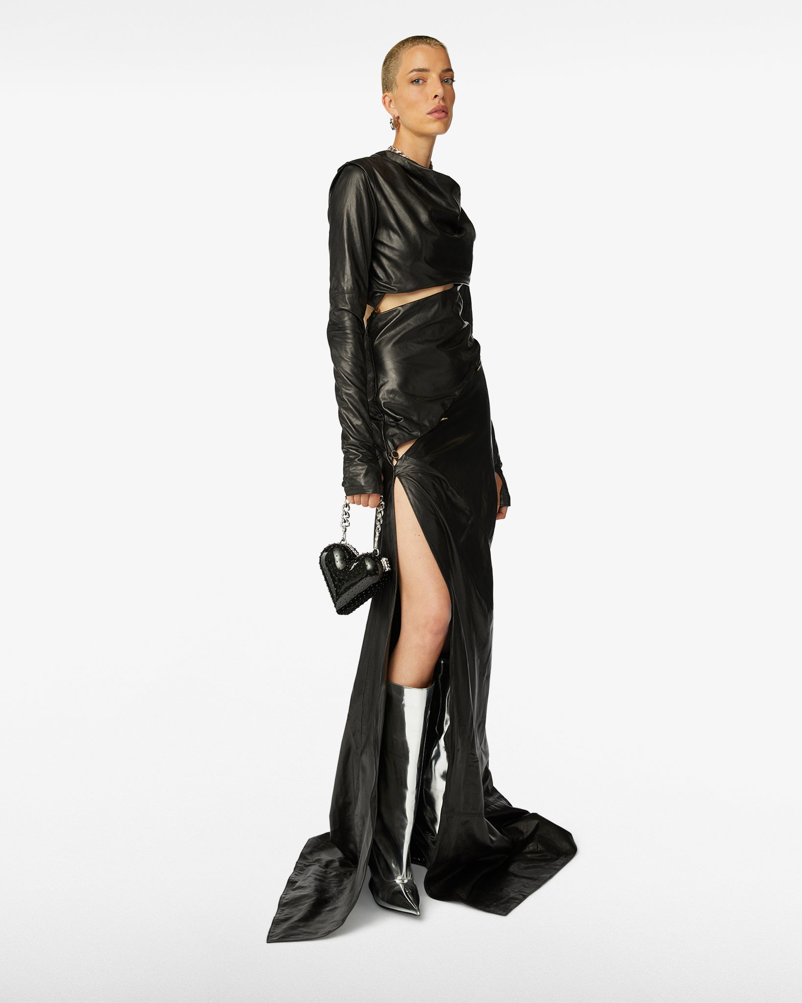 Leather long dress. Round neckline with a draped effect and long biker glove sleeves. The uniqueness of the garment is accentuated by the train, asymmetrical cuts with buttons and a front slit.