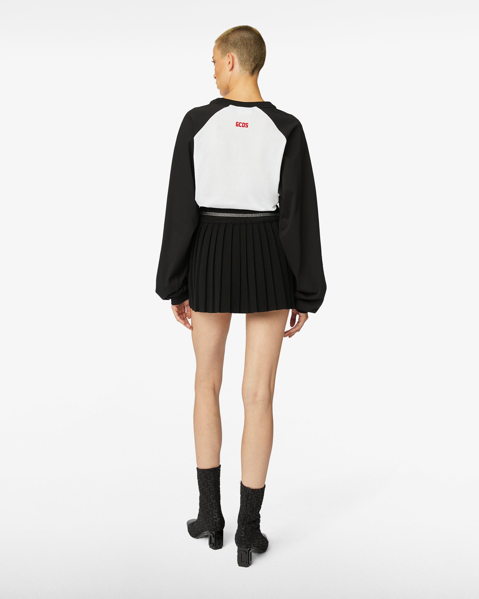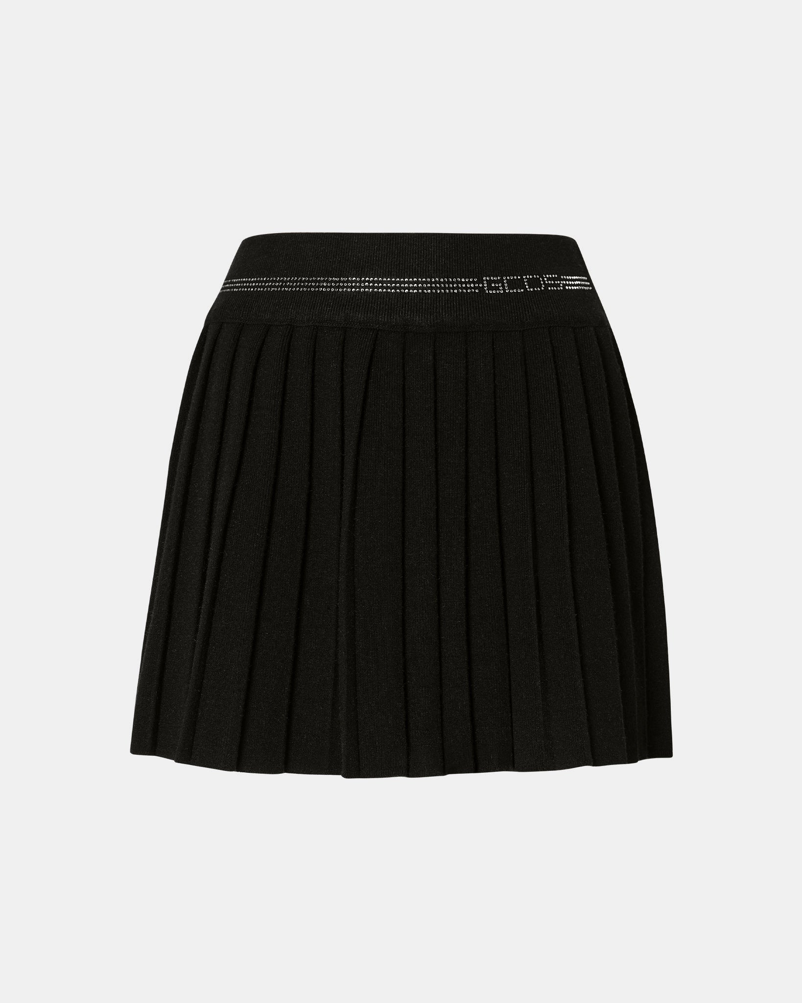 Pleated mini skirt made from a soft viscose, embellished with three rows of rhinestones and the GCDS logo on the waist. Perfect for adding a touch of elegance to any occasion.