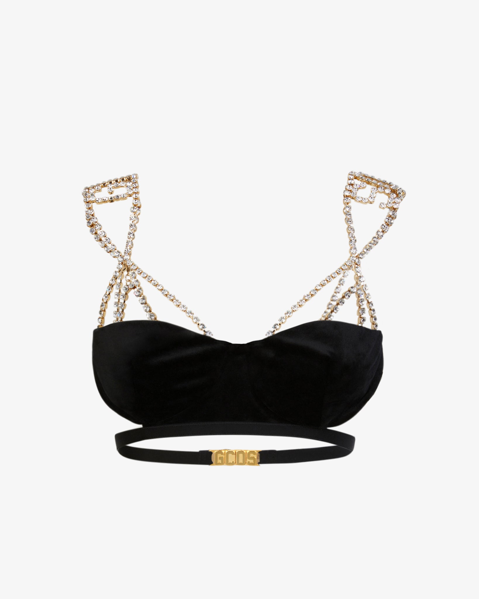 Velvet mini top with balconette cups. The distinctive detail is the adjustable straps embellished with the iconic rhinestone GCDS logo choker. The garment is enriched with a ribbon matching the straps with logoed clip on the back.