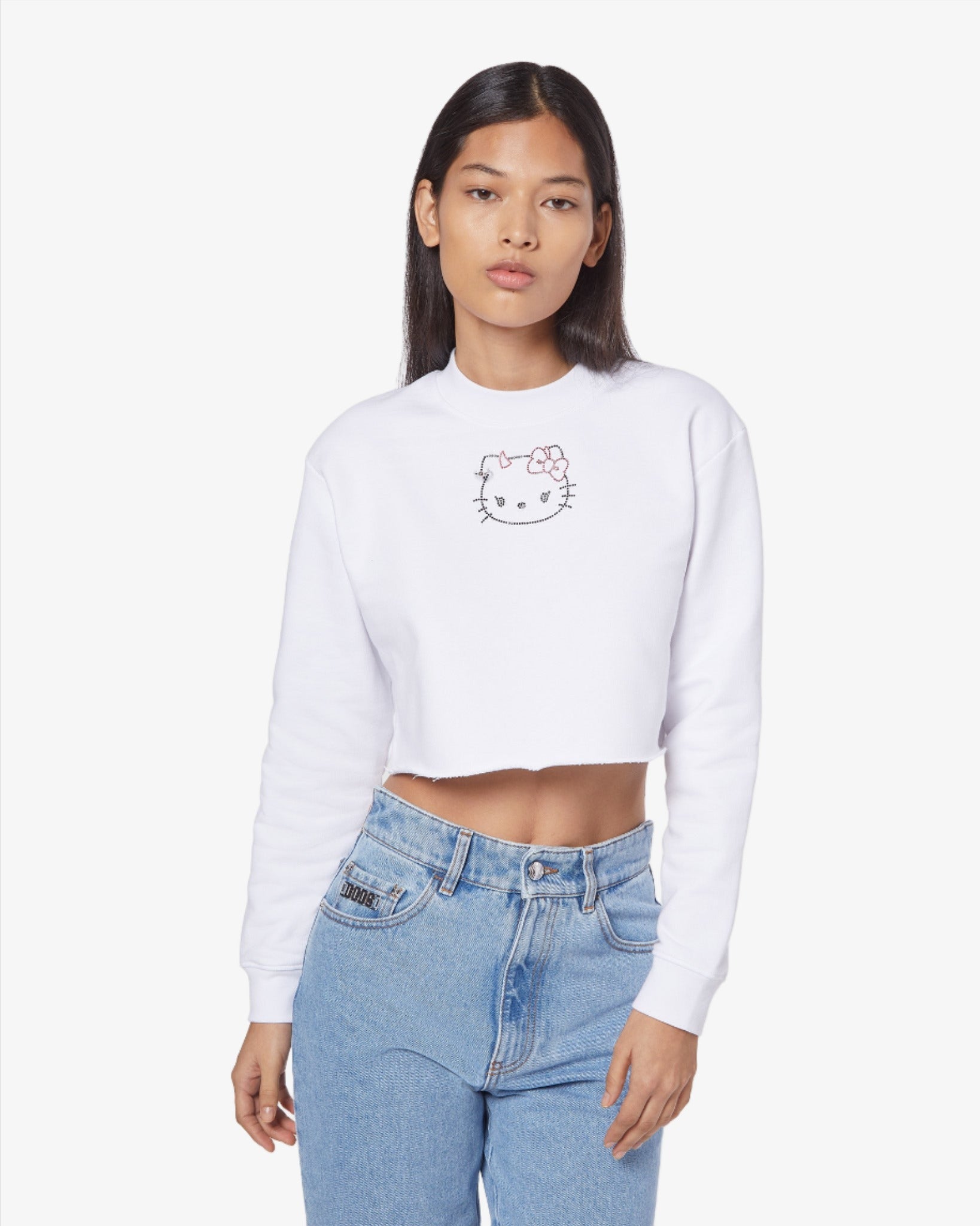 Long-sleeved cropped sweatshirt with raw-cut bottom. On the front, heat-applied rhinestone crystal Hello Kitty artwork. On the back, raised Hello Kitty print and GCDS Wear logo embroidery.