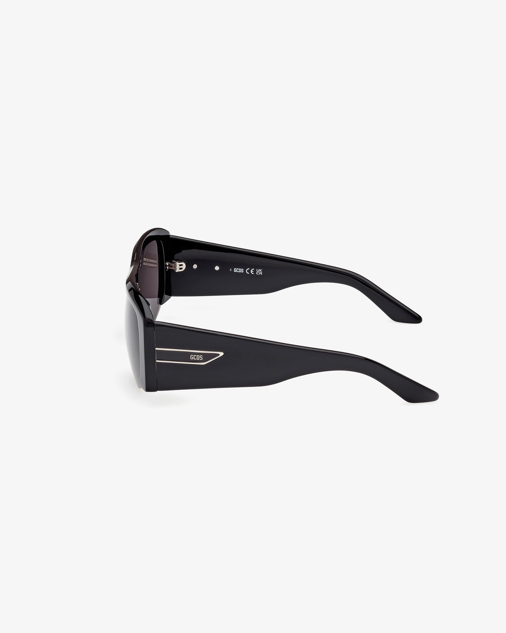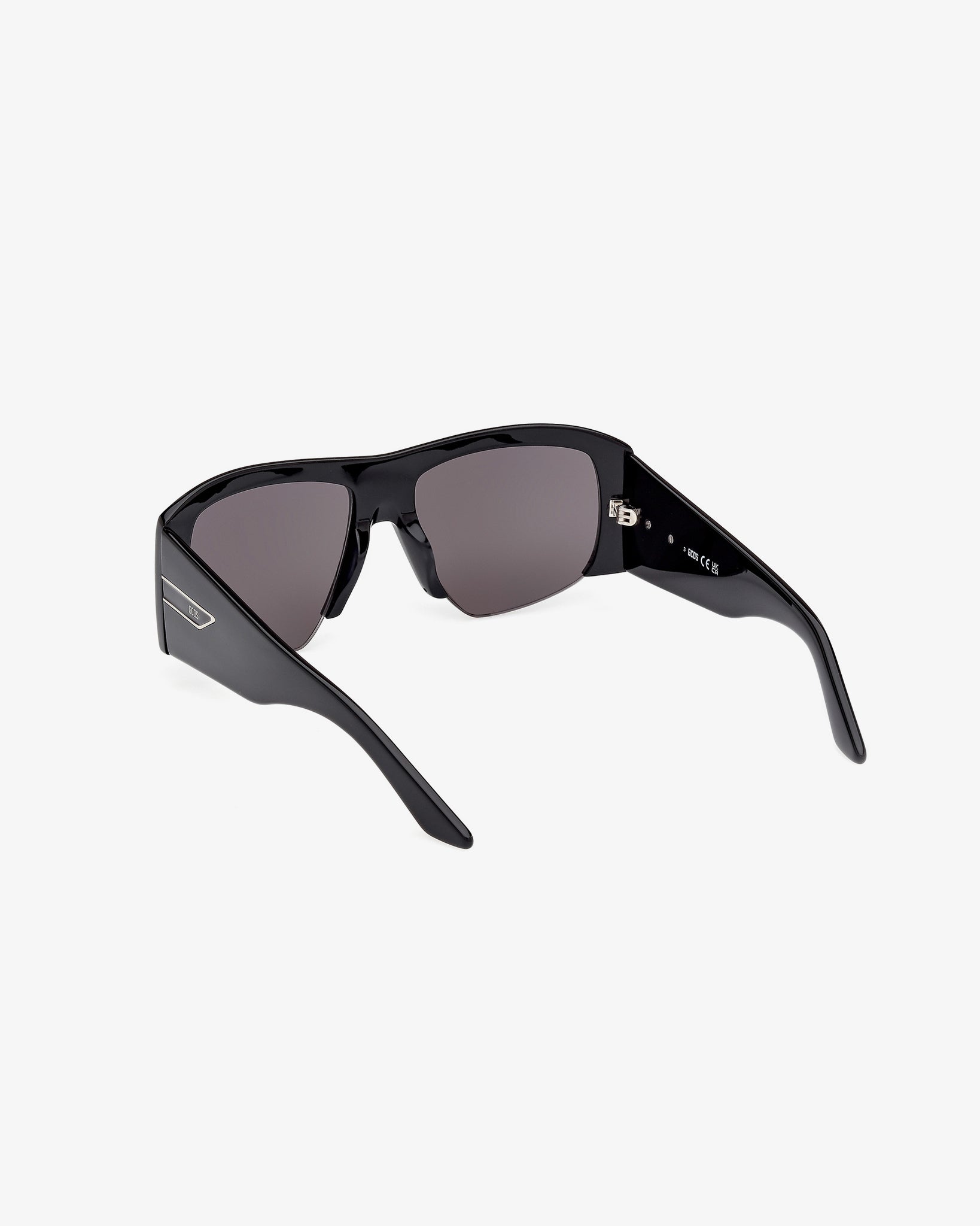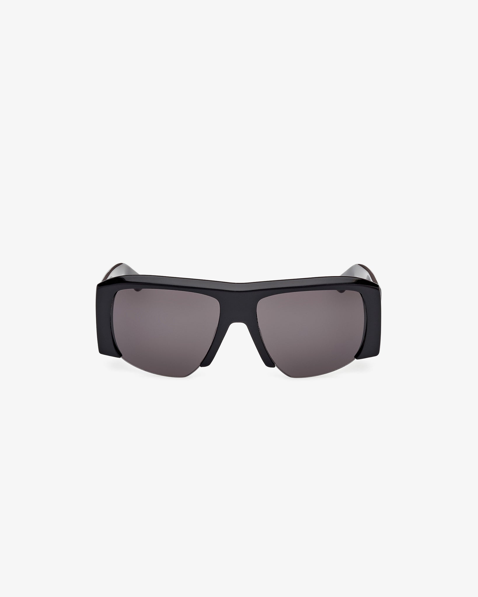 These sunglasses feature a bold and modern design. The oversized rectangular frame is made of shiny black acetate and the dark rectangular lenses offer optimal UV protection. A metal detail with an engraved logo stands out on the side arms, with their wrap-around structure, these sunglasses provide excellent coverage and protection.