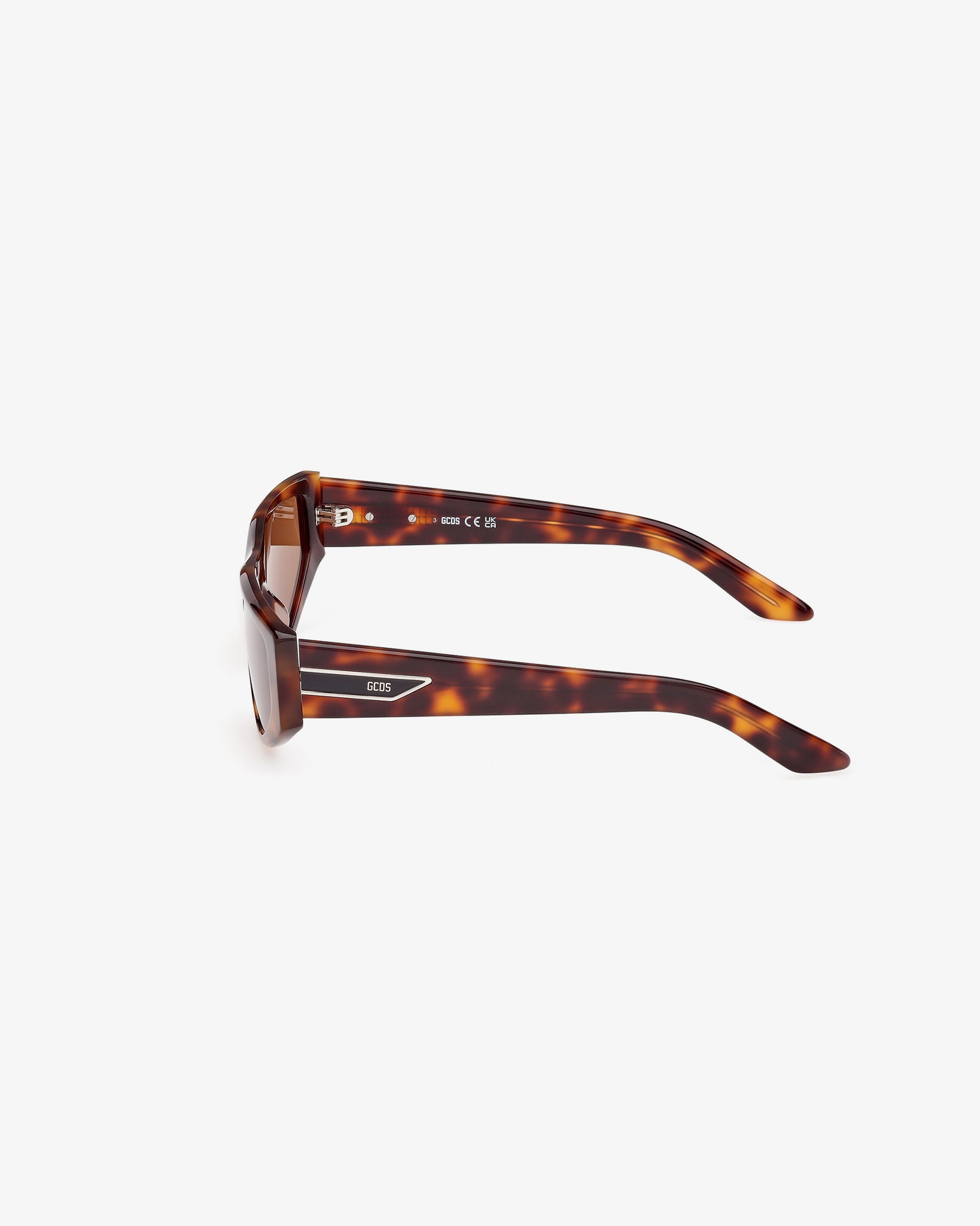These sunglasses feature a sleek geometric frame, crafted a dark havana acetate frame with tobacco lenses. The temples showcase a refined metal detail with an engraved GCDS logo.