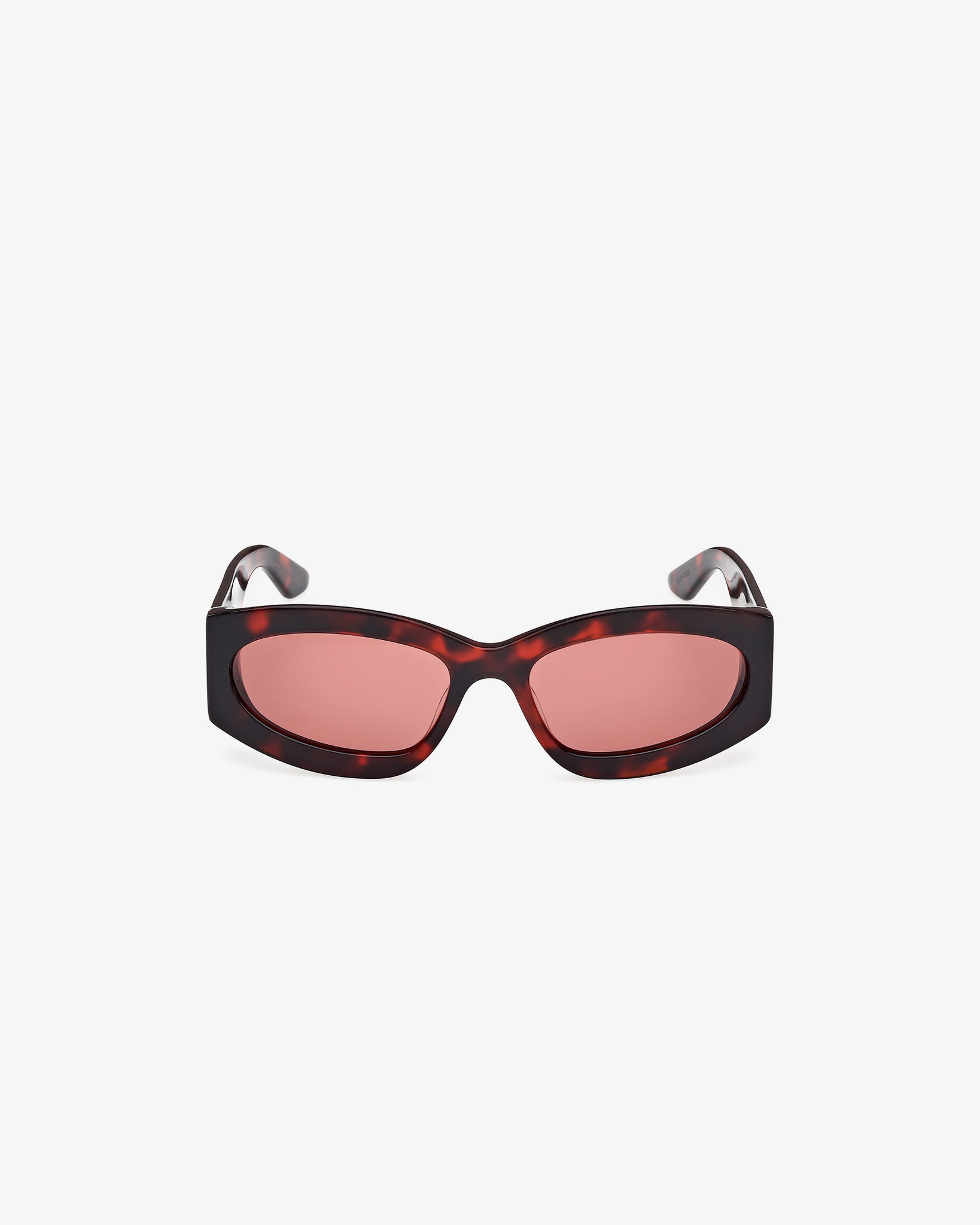 These sunglasses feature a bold geometric frame, made from red havana acetate with bordeaux lenses. An metal GCDS logo detail engraved on the temples.